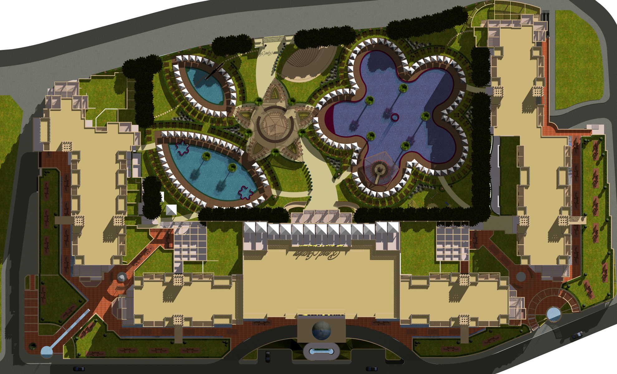 Royal Garden complex offers 4 swimming-pools with different shapes and size, each one with perfect for entertainment and recreation. All swimming-pools, excluding the standard one, are heated, pleasant and suitable for recreation and rest, as well as for entertaining games and amusement.