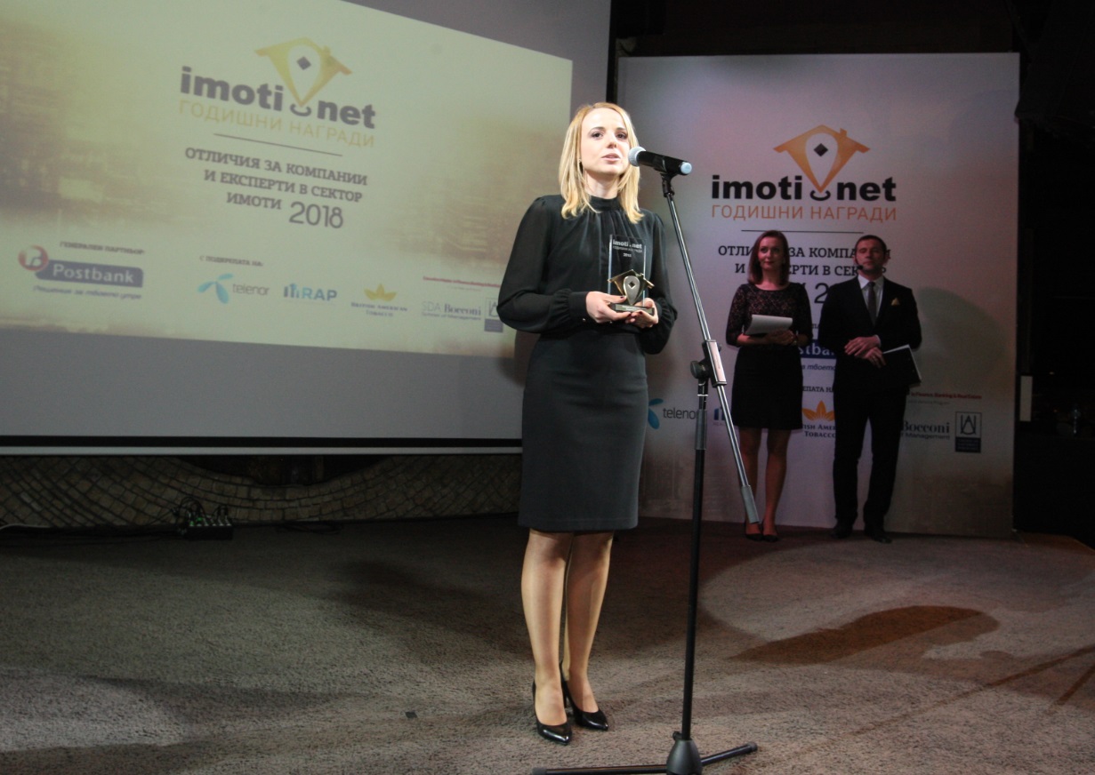 Magdalena Tosheva, in turn, told the audience: "It is a great honor for me to receive the most prestigious award - "Broker of the Year" at the Annual Awards of Imoti.net for 2018. I am proud to be part of the team of BULGARIAN PROPERTIES for more than 10 years now and I would like to thank them sincerely for the unconditional support and trust. We are happy to work with some of the most serious construction entrepreneurs and investors and help them with the sales of their new developments. An example are residential complexes such as Vitosha View, Modera Residence, Sofia North Park and many others which sell successfully."