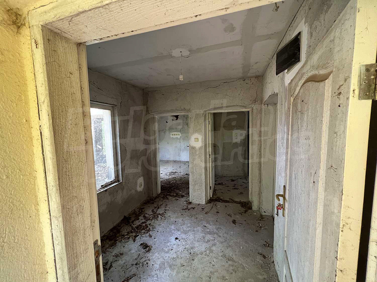 This property is located in a hilly area only 10 km away from the town of Elhovo. The total living are of the house is 60 sq. m. It consists of corridor, living room, bedroom, master bedroom with premises for bathroom/toilet and terrace, and basement (16 sq. m.). There is electricity and water (connected to septic tank) installed in the property; a telephone line is also possible to connect.
