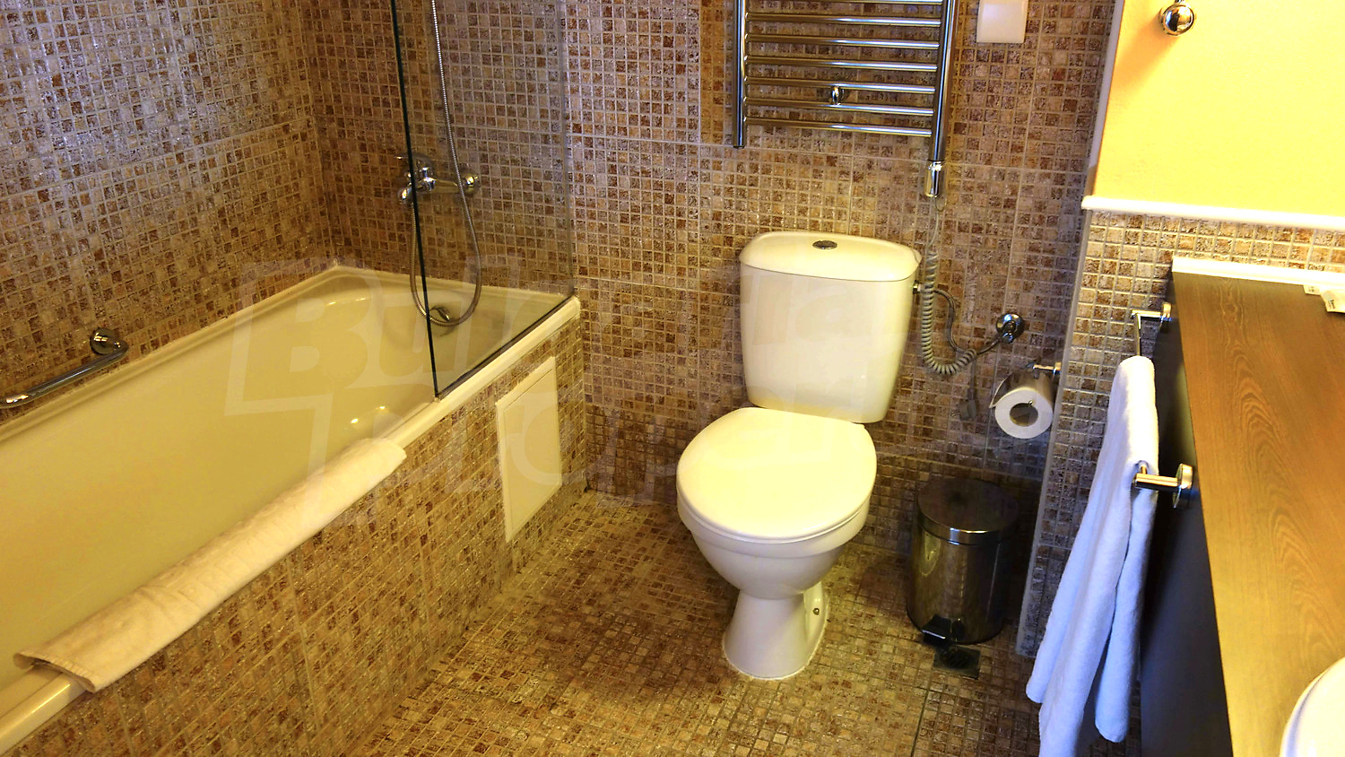 It is equipped with an air-conditioning system. The bathrooms is fully equipped with faience tiles, boiler, sanitary utilities, accessories and lighting. The apartment is situated on the eight floor ,has a wonderful mountain view and is for sale fully furnished.