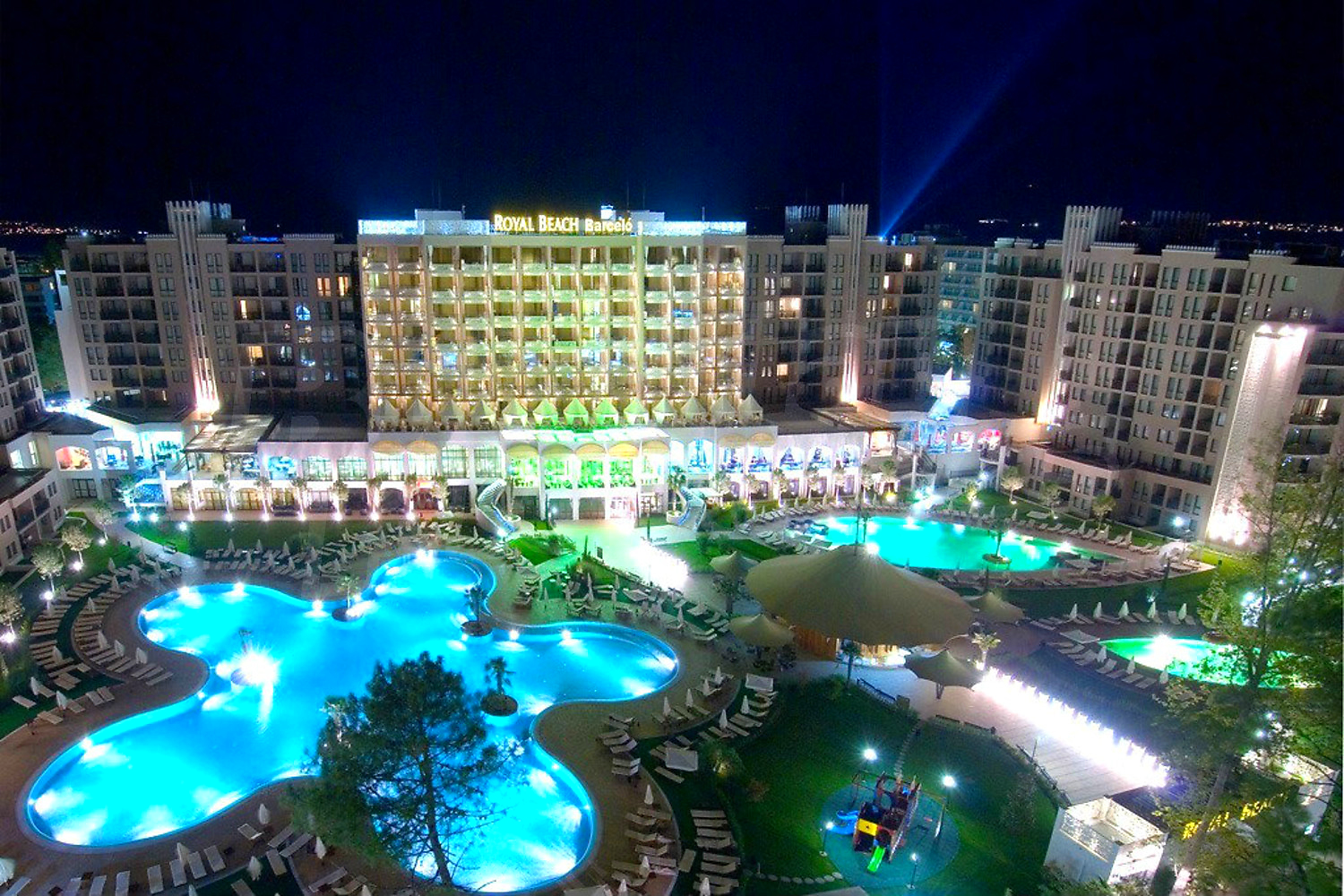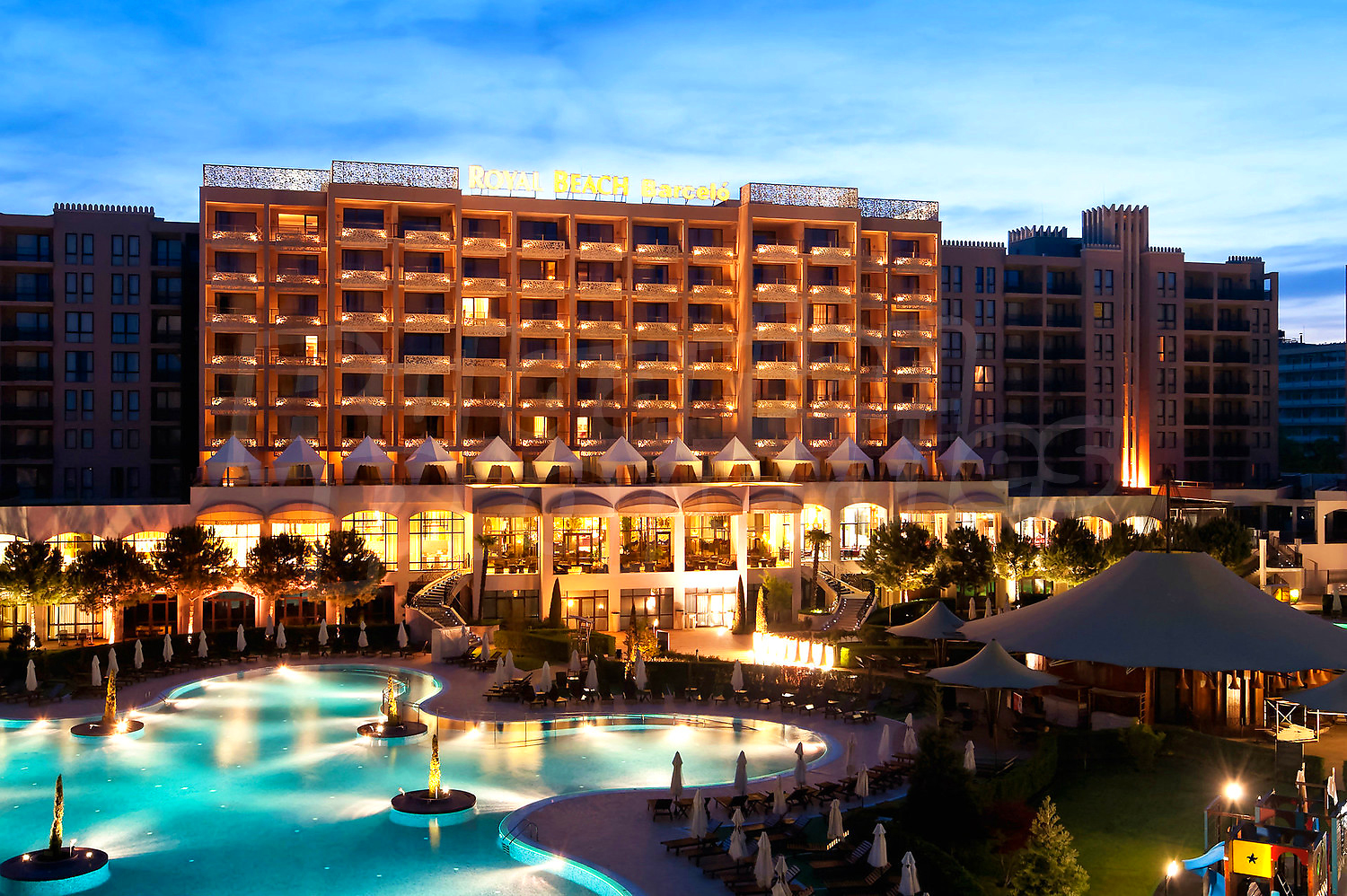 a five-star hotel, comprising 143 rooms, 6 buildings with 504 apartments, a children’s playground and a garden with an area of over 9 decares. Numerous entertainment options are a further guarantee for a perfect holiday: 6 theme restaurants and confectioneries, a piano bar and a lobby bar. The Royal Beach Barceló Complex is remarkable for its picturesqueness and five-star luxury, which have made it the new paradise place of Sunny Beach Resort.