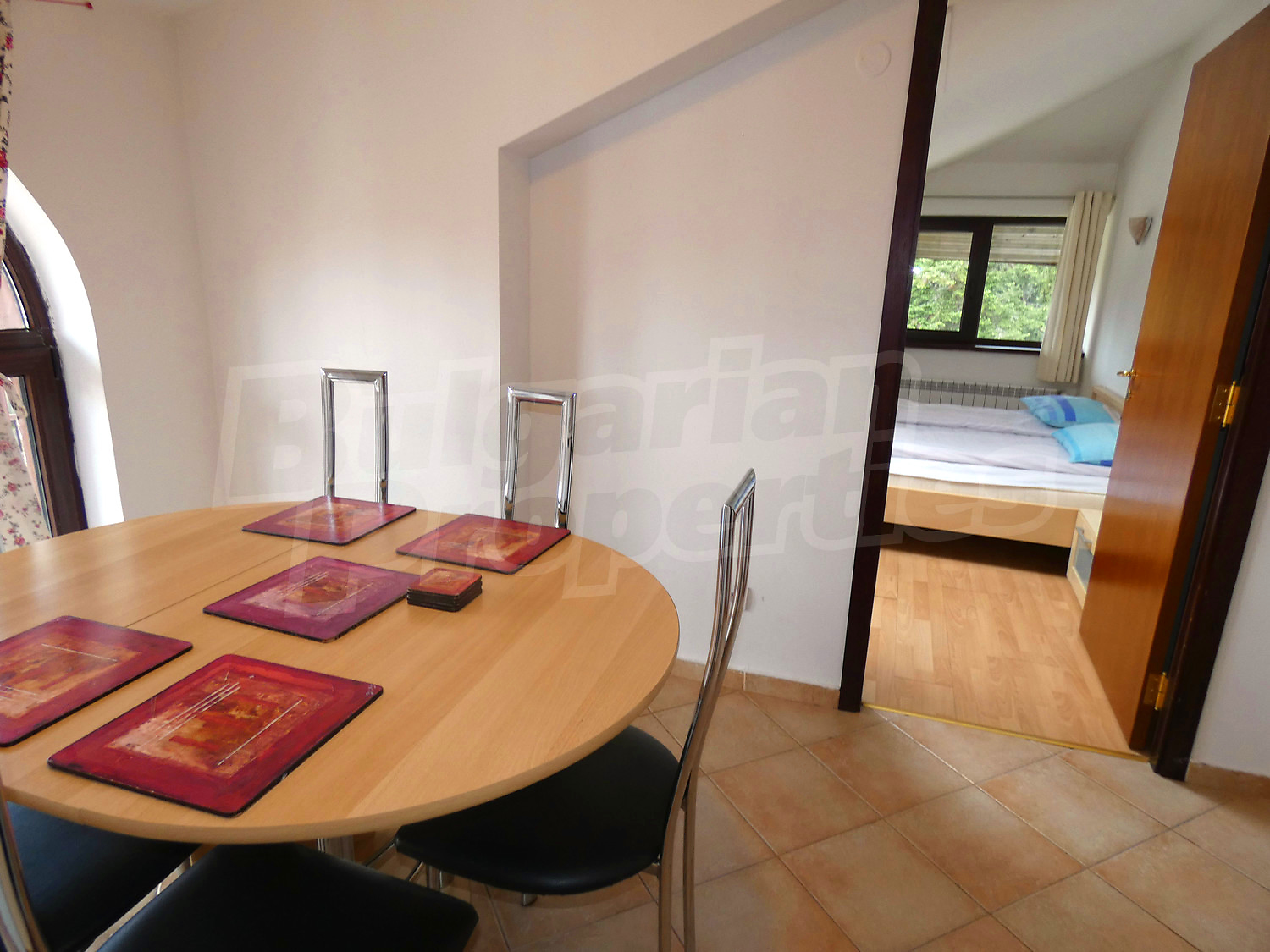 The southeastern home consists of a living room with kitchenette, a bedroom, a bathroom with WC and a balcony with great views. The rooms are fitted with laminate flooring and with tiles in the hallway and the kitchenette, painted walls and PVC joinery. The kitchen is equipped with a ceramic hob, a sink, cupboards, an oven, a refrigerator, a table with 4 chairs, an extractor hood, and the furniture in the living room includes two sofa beds, a coffee table, a TV set, DVD and in the bedroom - a double bed and two nightstands. The bathroom is equipped with а bathtub and а washbasin with mirror. The heating is local. The apartment has telephone, cable TV, Internet and security system.