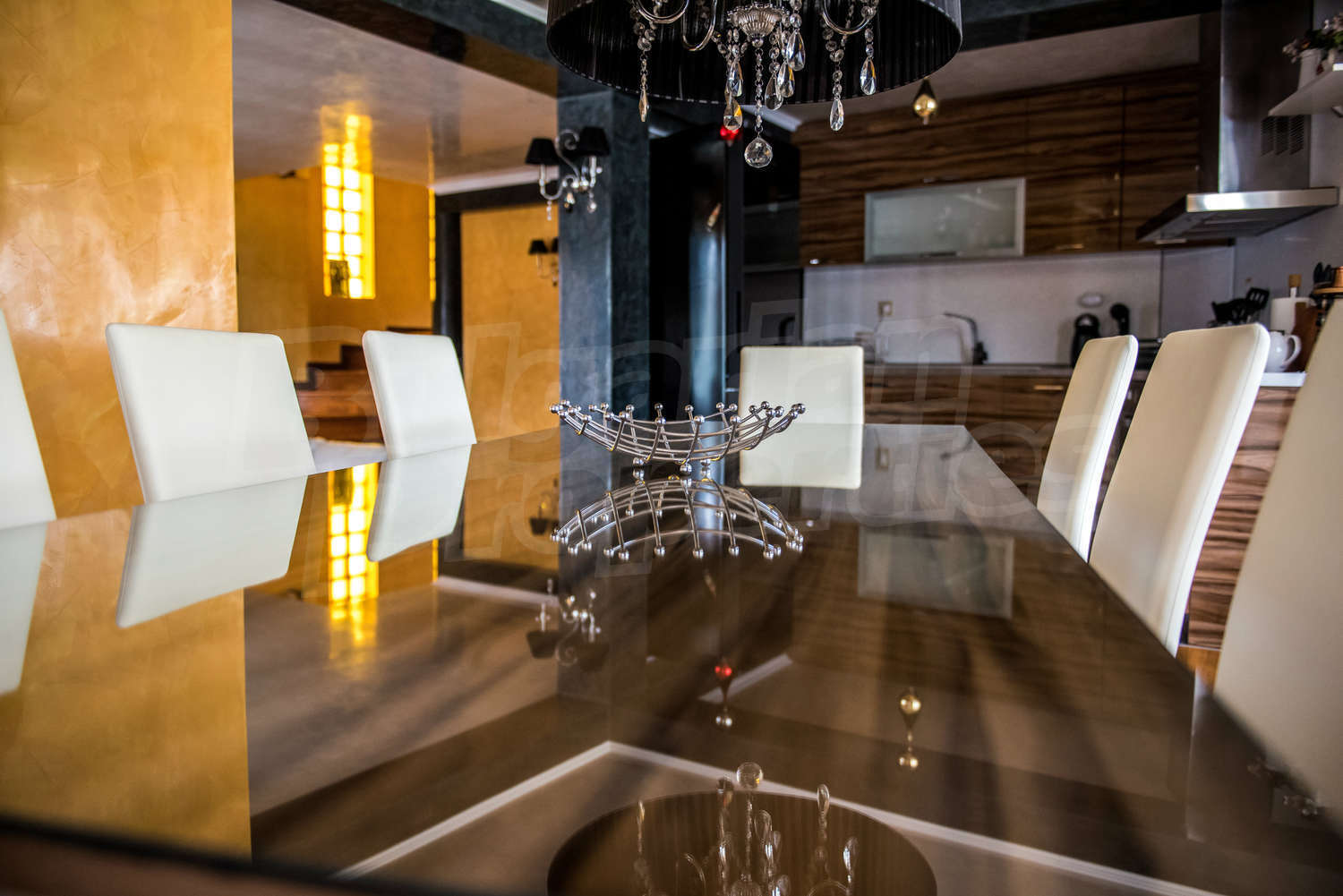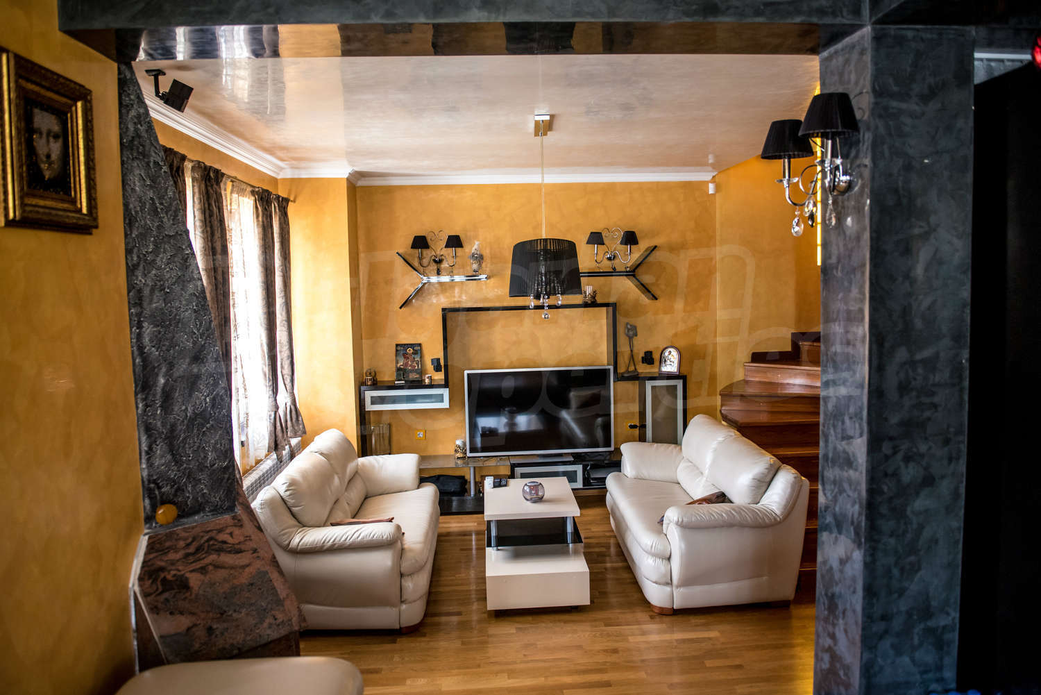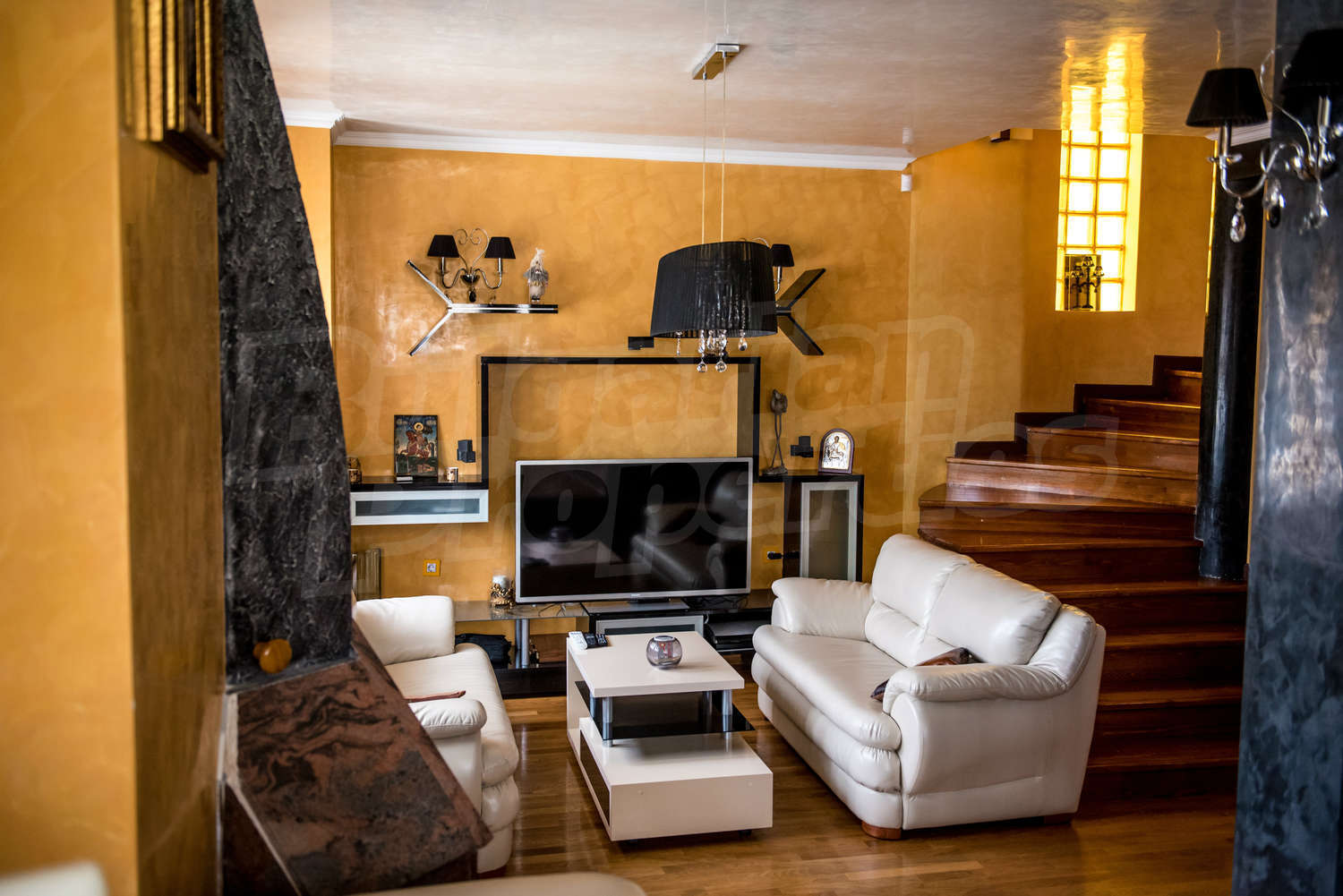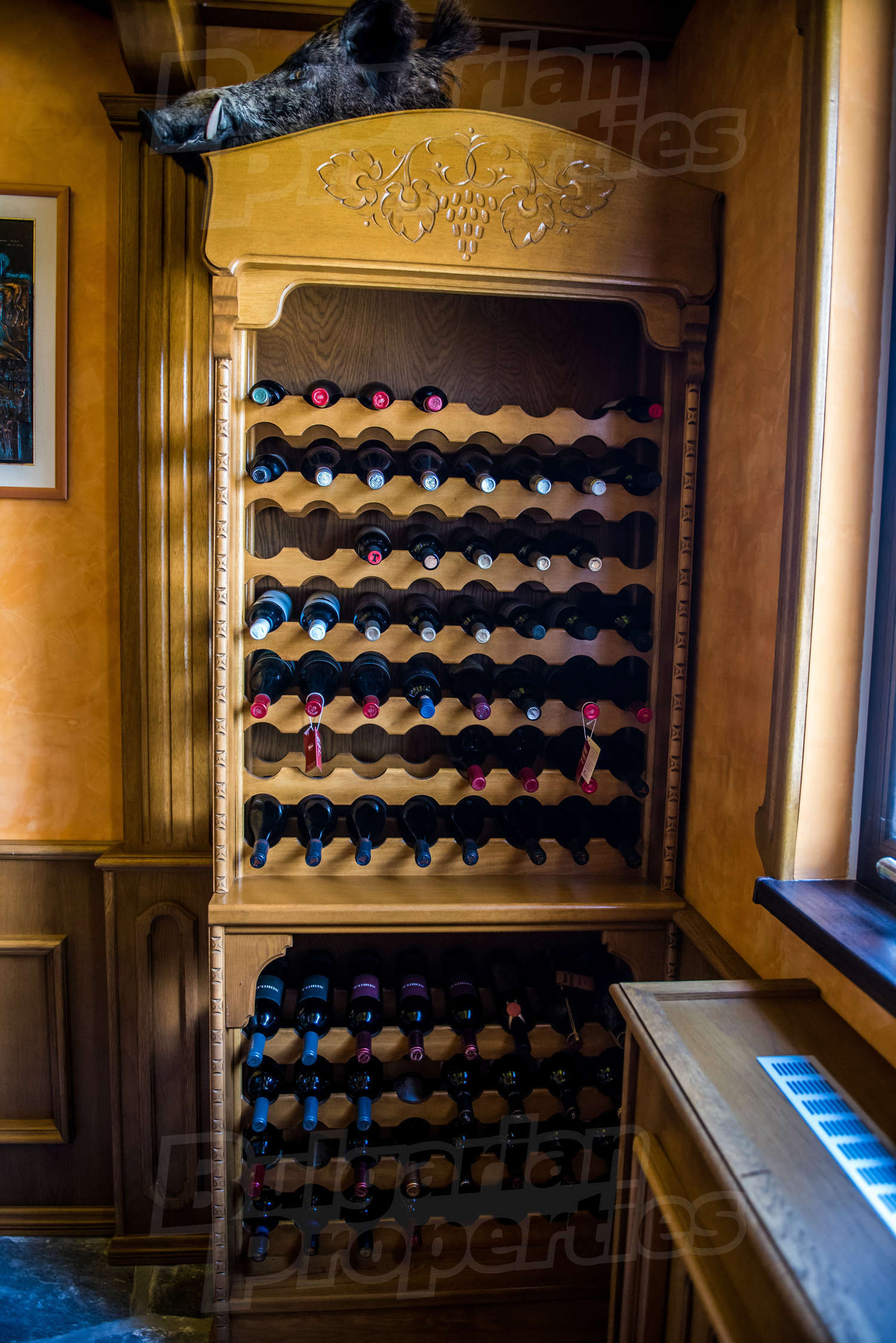 The three-storey luxury house spreads over 213.59 sq.m. (first floor - 47.26 sq.m., second floor - 82.30 sq.m. and third floor - 84.03 sq.m.). The garden has an area of 639 sq.m. The property has a two-car garage. The winery and the whole kitchen on the first floor are made of natural wood. An internal staircase leads to the second floor with a living room with dining area and kitchen and two balconies. The living room is equipped with sound system with integrated rear pillars at the ceiling. The third floor consists of four bedrooms, two bathrooms, a sauna and two terraces. The property is supplied with electricity, water inside and sewerage system. It has telephone, internet and digital TV. The heating is via diesel boiler (with an internally insulated container of stainless steel, filled with diesel fuel (500 liters)). There is an electricity aggregate, too.