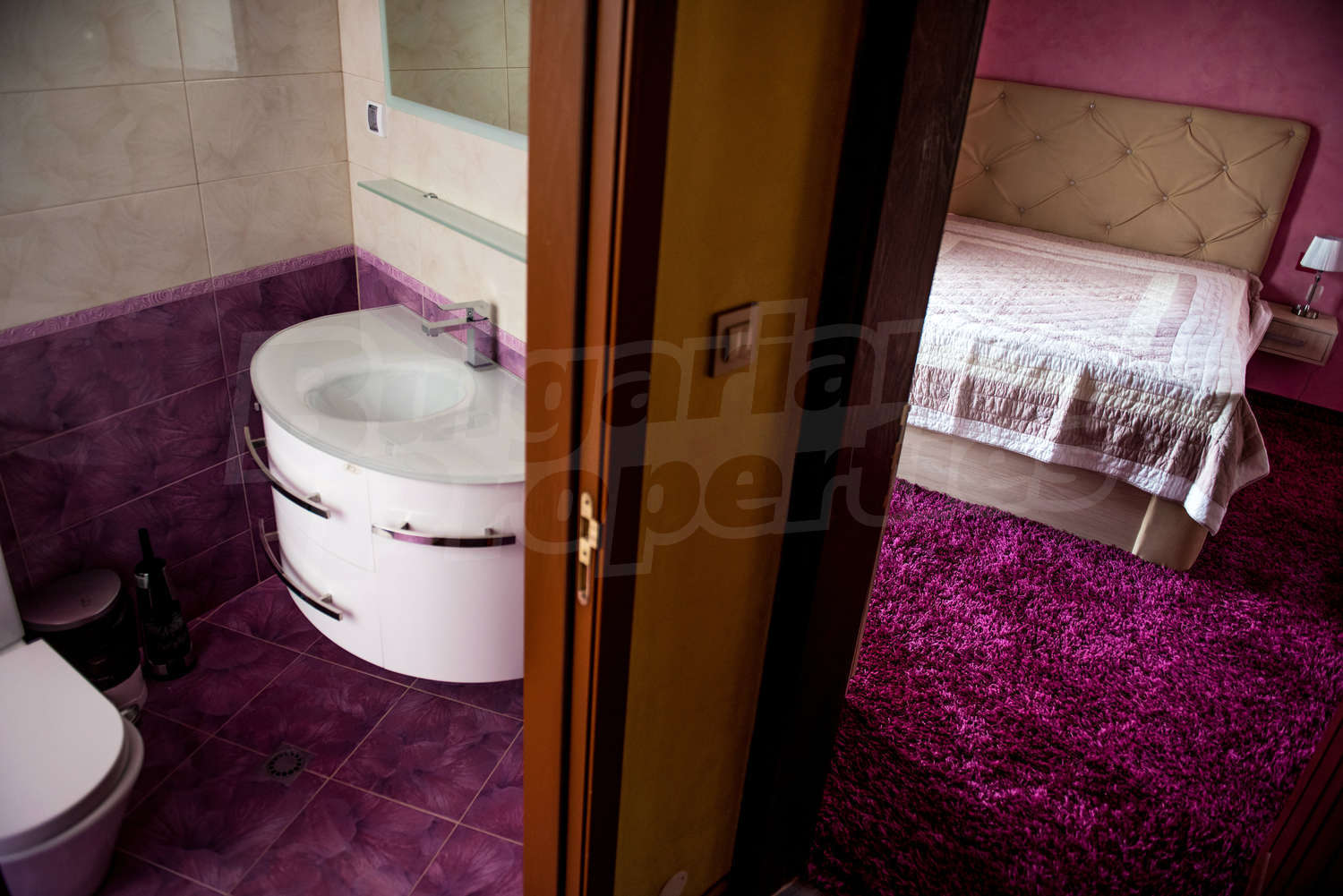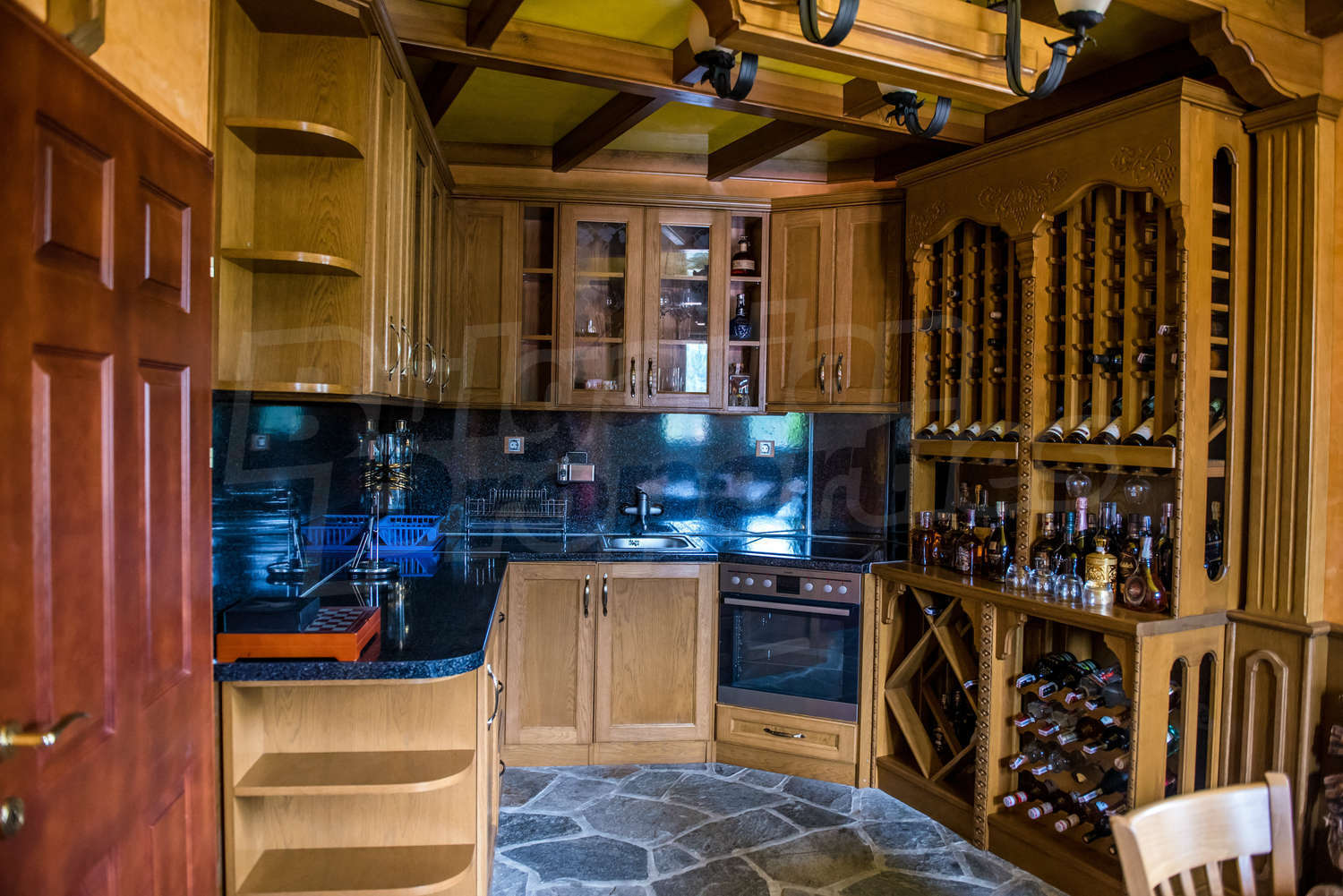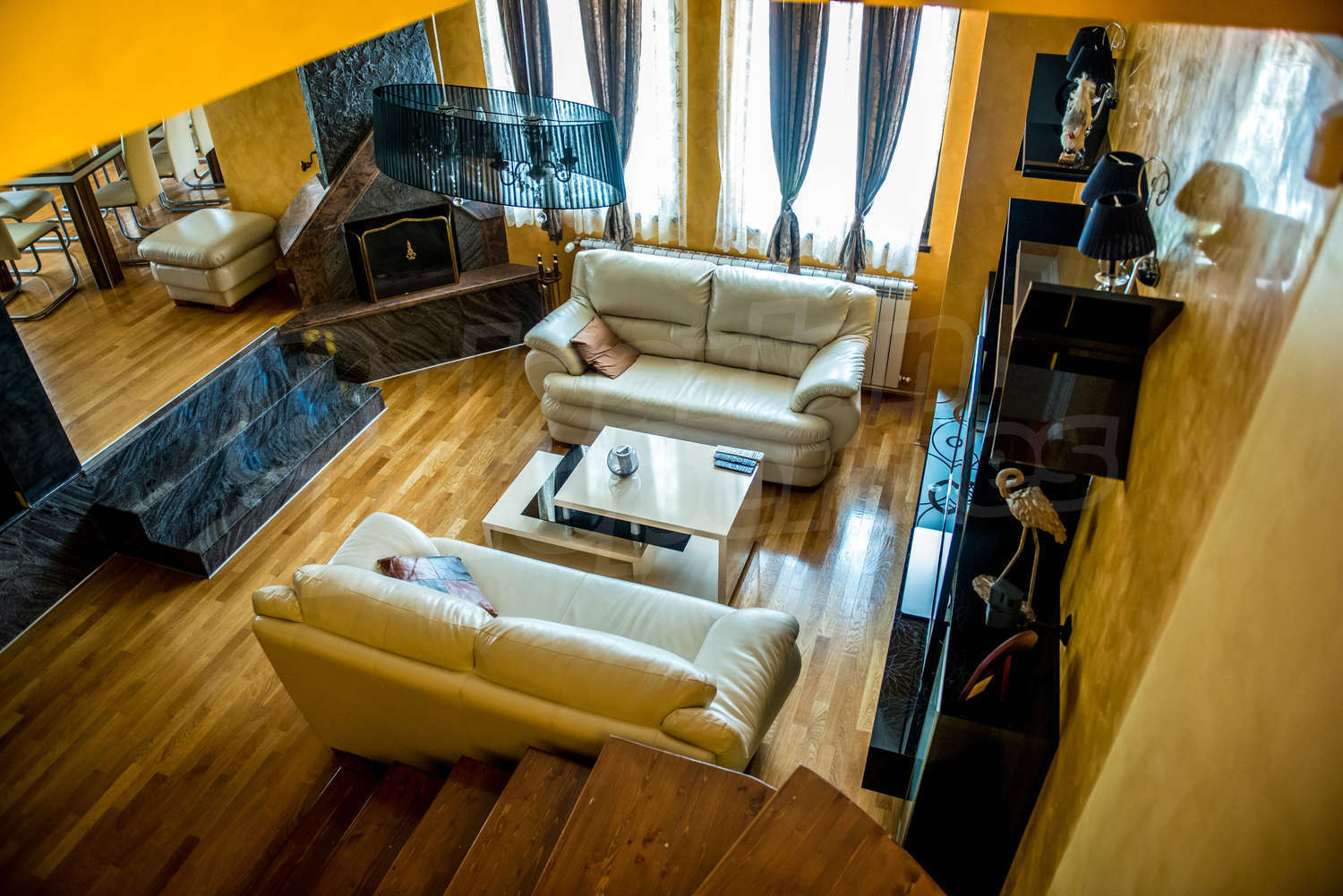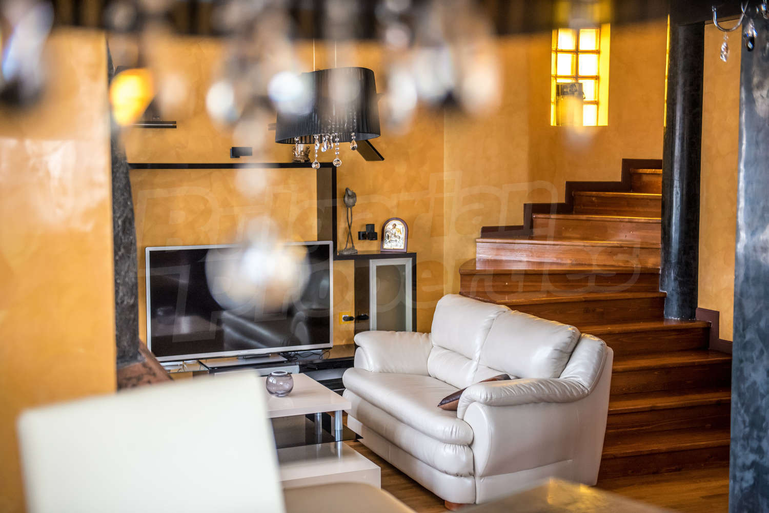 The three-storey luxury house spreads over 213.59 sq.m. (first floor - 47.26 sq.m., second floor - 82.30 sq.m. and third floor - 84.03 sq.m.). The garden has an area of 639 sq.m. The property has a two-car garage. The winery and the whole kitchen on the first floor are made of natural wood. An internal staircase leads to the second floor with a living room with dining area and kitchen and two balconies. The living room is equipped with sound system with integrated rear pillars at the ceiling. The third floor consists of four bedrooms, two bathrooms, a sauna and two terraces. The property is supplied with electricity, water inside and sewerage system. It has telephone, internet and digital TV. The heating is via diesel boiler (with an internally insulated container of stainless steel, filled with diesel fuel (500 liters)). There is an electricity aggregate, too.