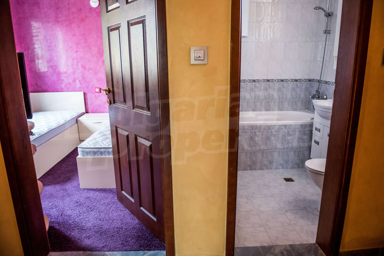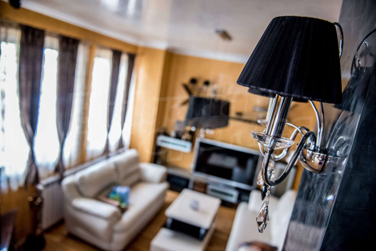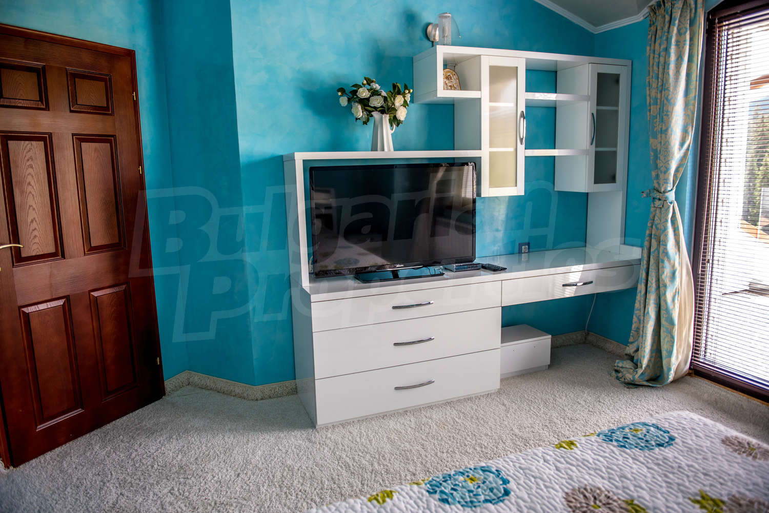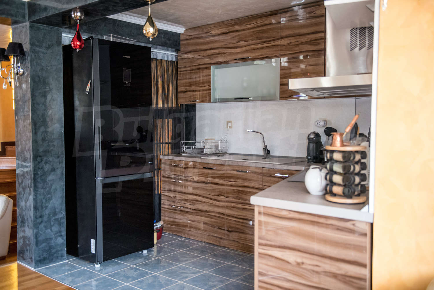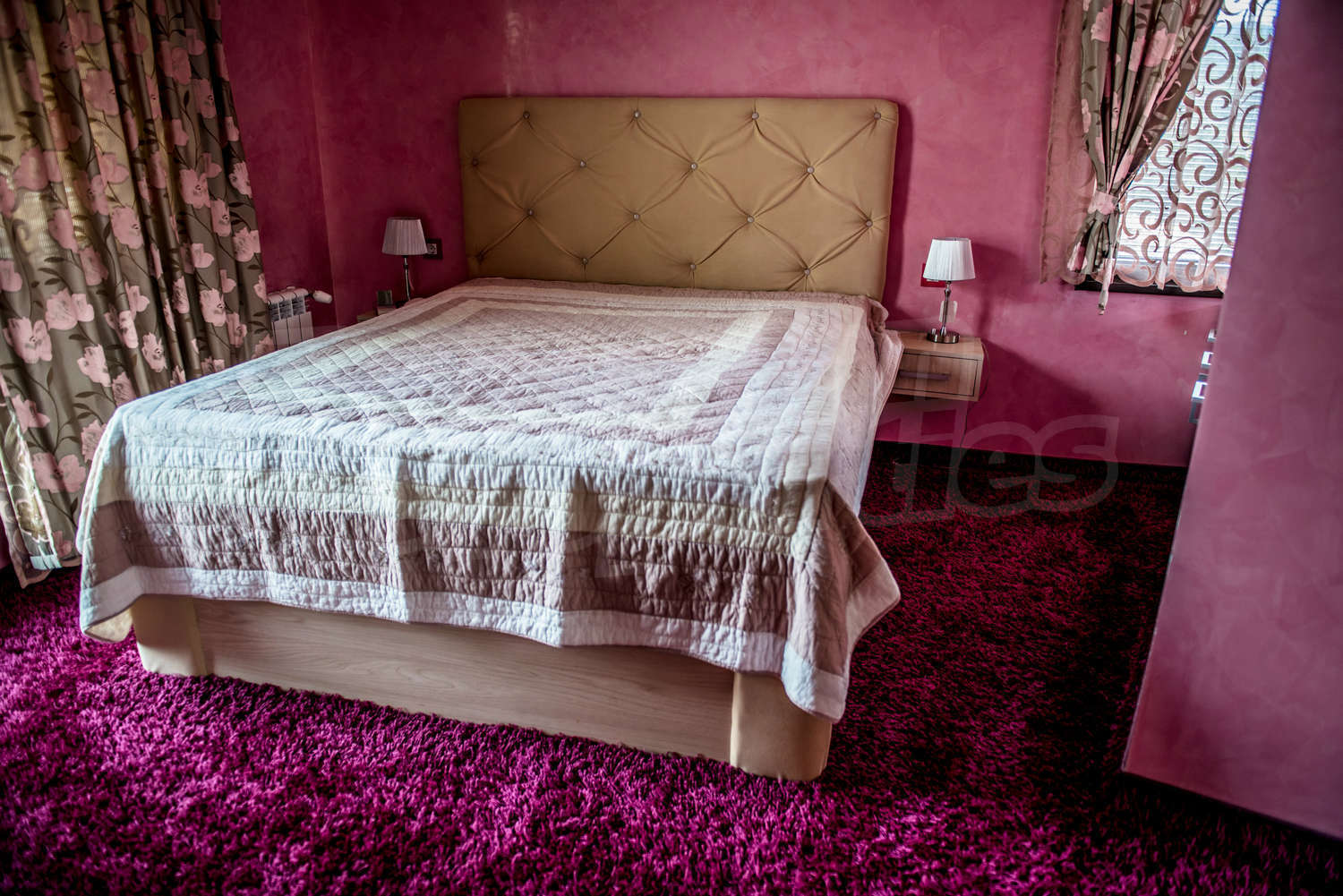 The three-storey luxury house spreads over 213.59 sq.m. (first floor - 47.26 sq.m., second floor - 82.30 sq.m. and third floor - 84.03 sq.m.). The garden has an area of 639 sq.m. The property has a two-car garage. The winery and the whole kitchen on the first floor are made of natural wood. An internal staircase leads to the second floor with a living room with dining area and kitchen and two balconies. The living room is equipped with sound system with integrated rear pillars at the ceiling. The third floor consists of four bedrooms, two bathrooms, a sauna and two terraces. The property is supplied with electricity, water inside and sewerage system. It has telephone, internet and digital TV. The heating is via diesel boiler (with an internally insulated container of stainless steel, filled with diesel fuel (500 liters)). There is an electricity aggregate, too.