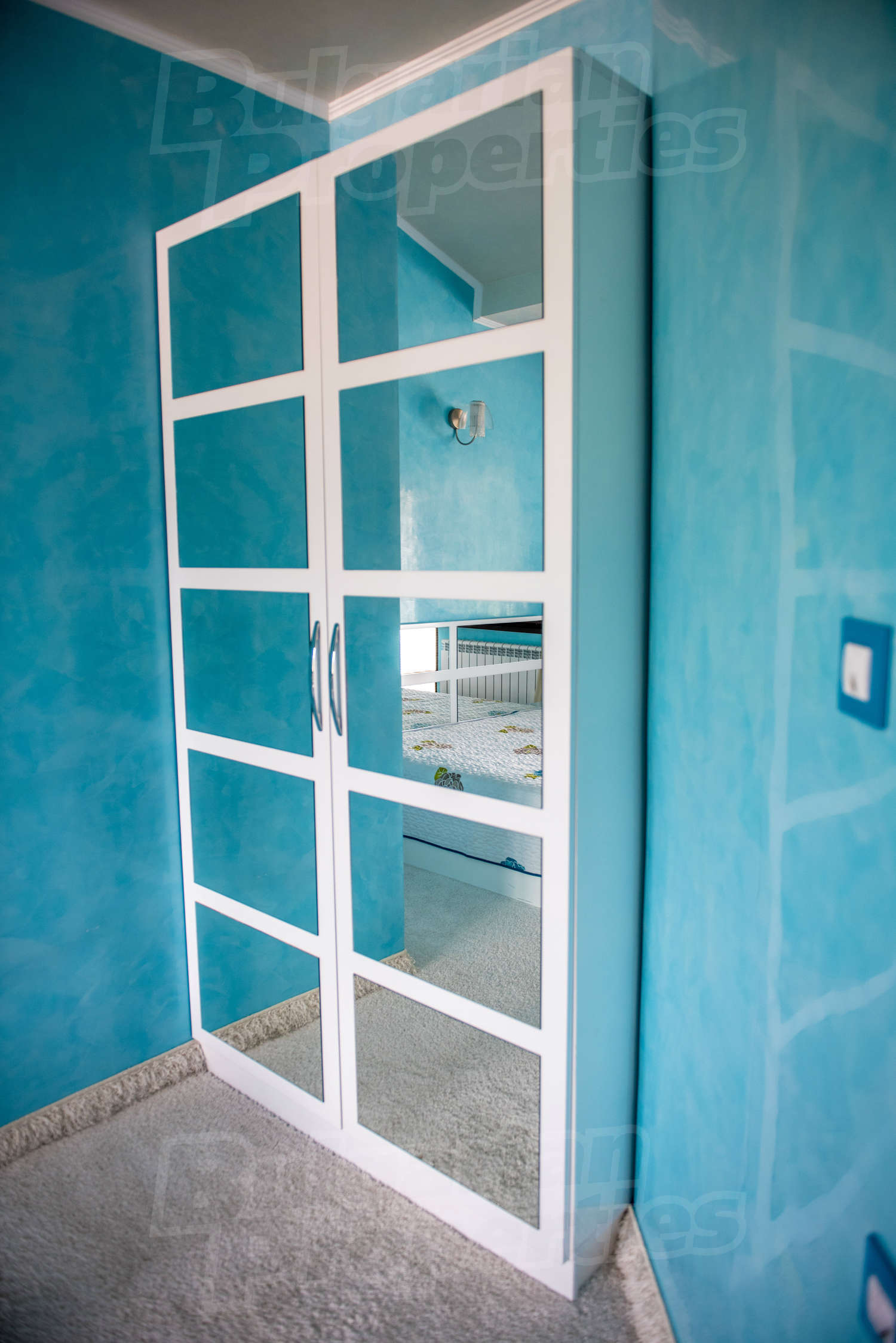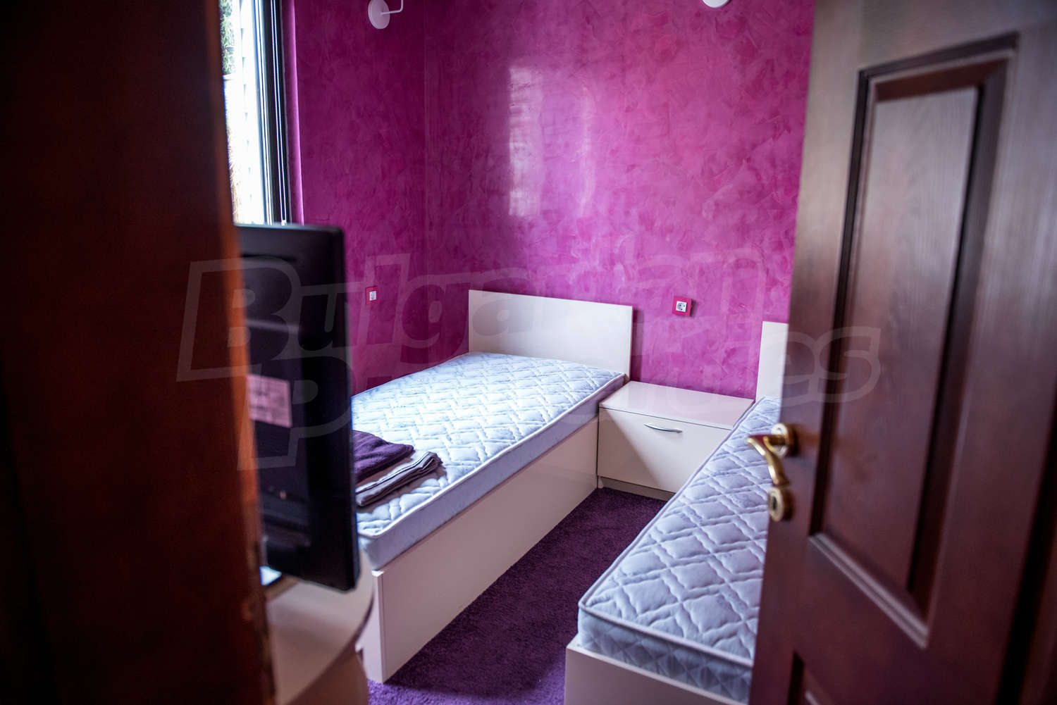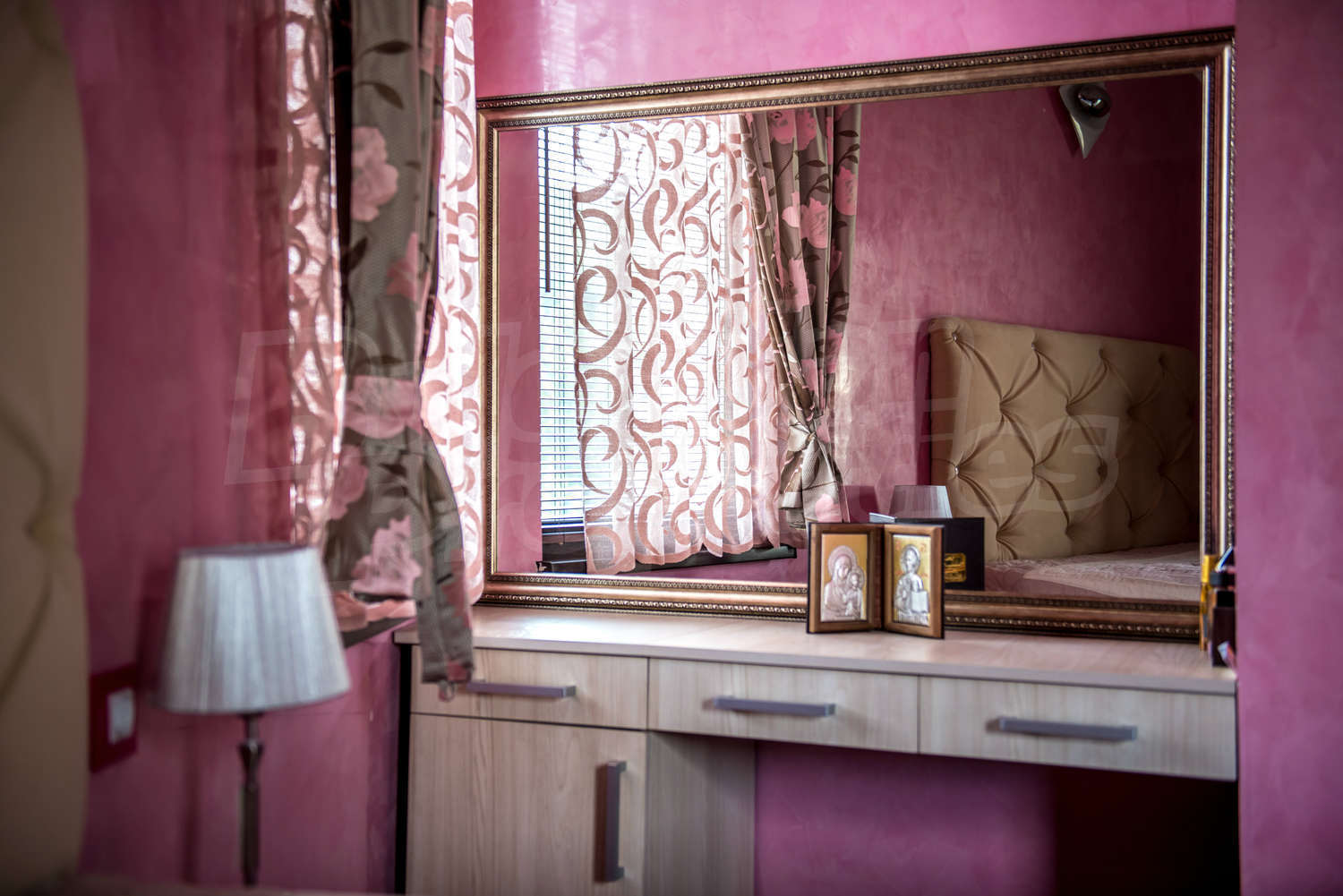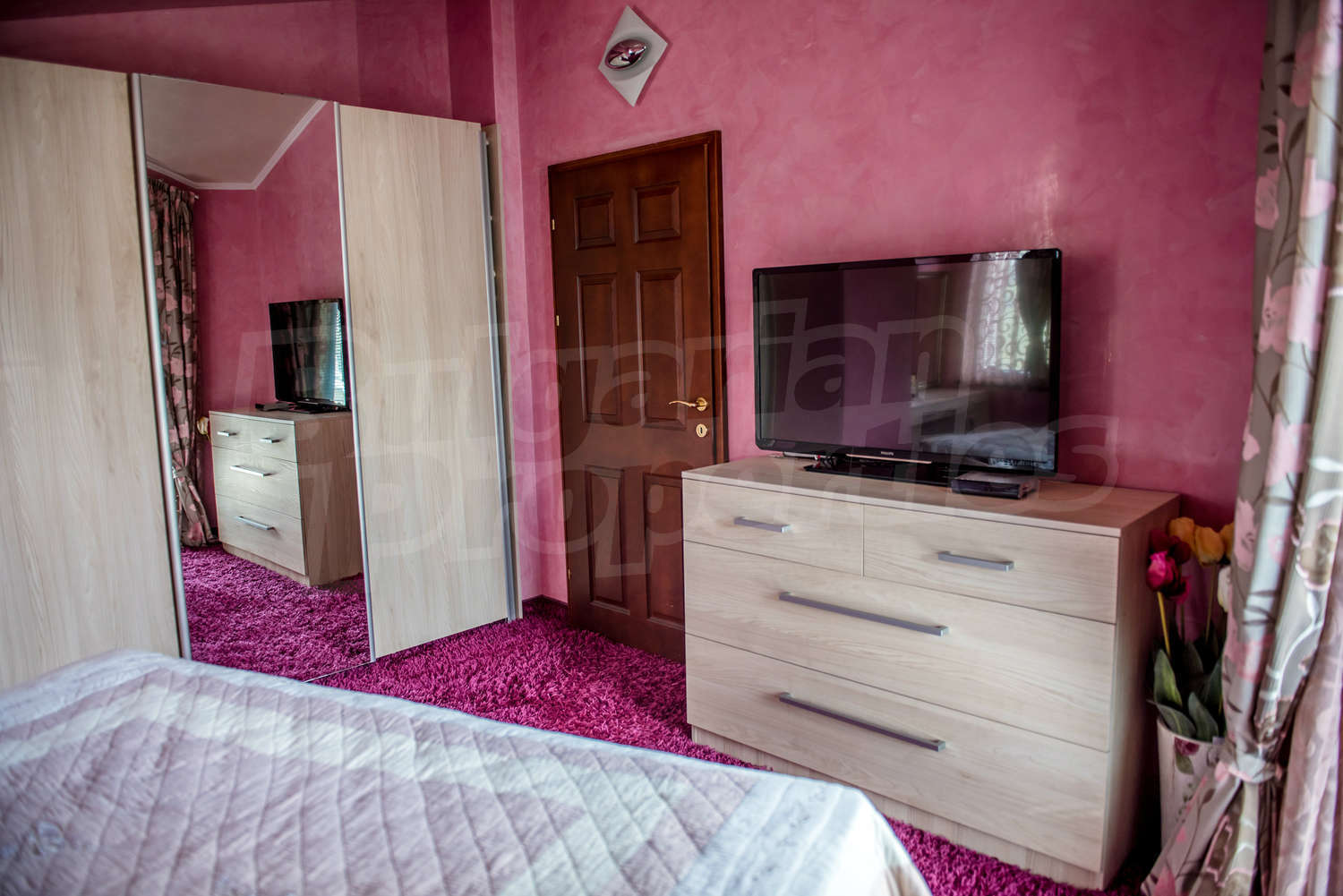 The three-storey luxury house spreads over 213.59 sq.m. (first floor - 47.26 sq.m., second floor - 82.30 sq.m. and third floor - 84.03 sq.m.). The garden has an area of 639 sq.m. The property has a two-car garage. The winery and the whole kitchen on the first floor are made of natural wood. An internal staircase leads to the second floor with a living room with dining area and kitchen and two balconies. The living room is equipped with sound system with integrated rear pillars at the ceiling. The third floor consists of four bedrooms, two bathrooms, a sauna and two terraces. The property is supplied with electricity, water inside and sewerage system. It has telephone, internet and digital TV. The heating is via diesel boiler (with an internally insulated container of stainless steel, filled with diesel fuel (500 liters)). There is an electricity aggregate, too.