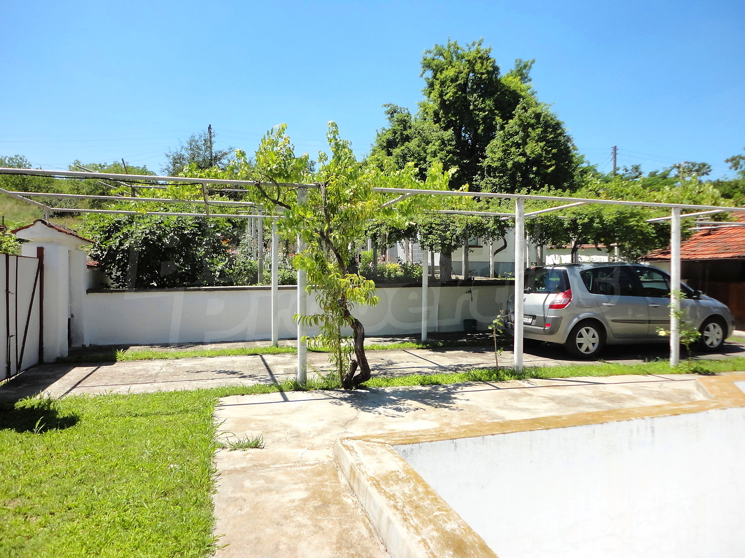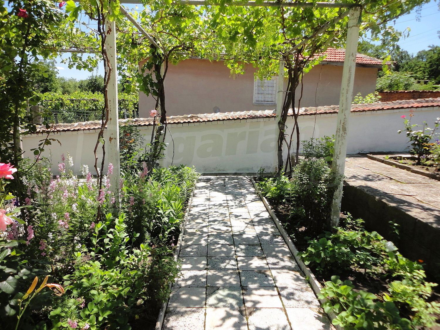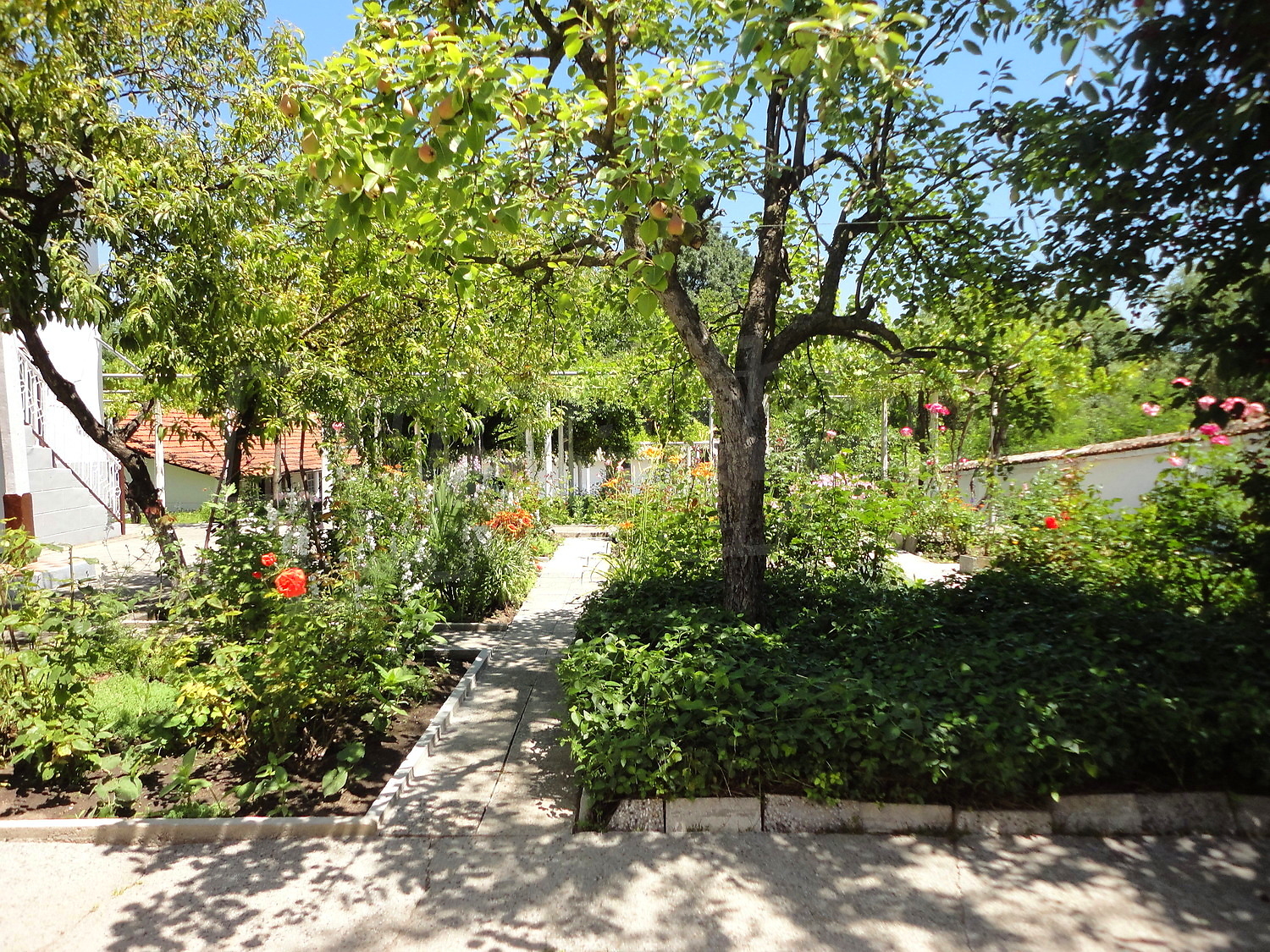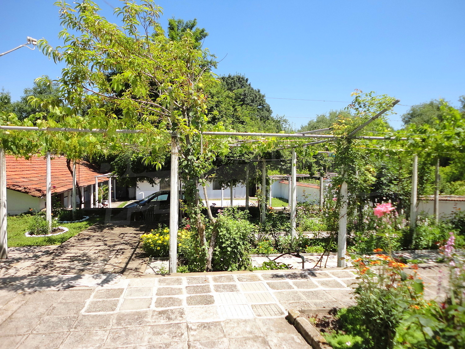 The garden is planted with fruit trees, flowers and trellis vine. There is also a swimming pool.