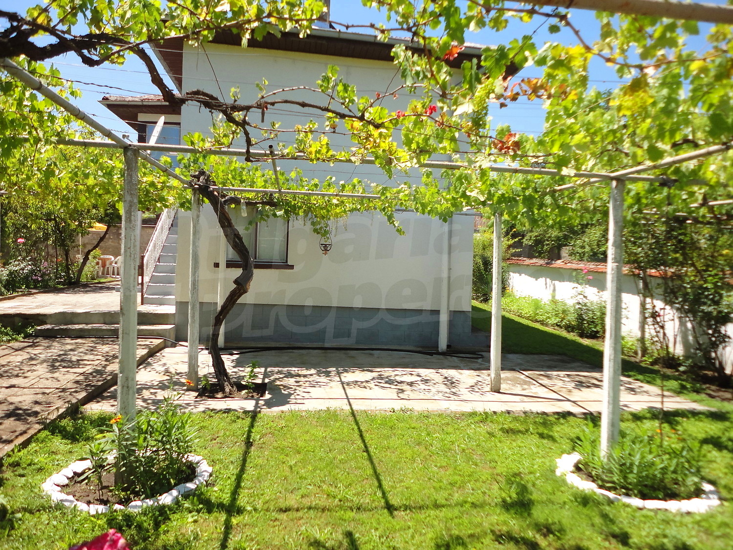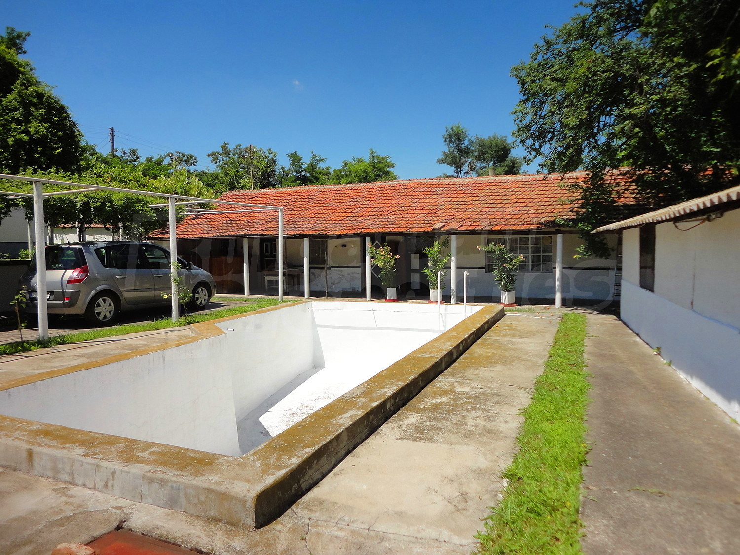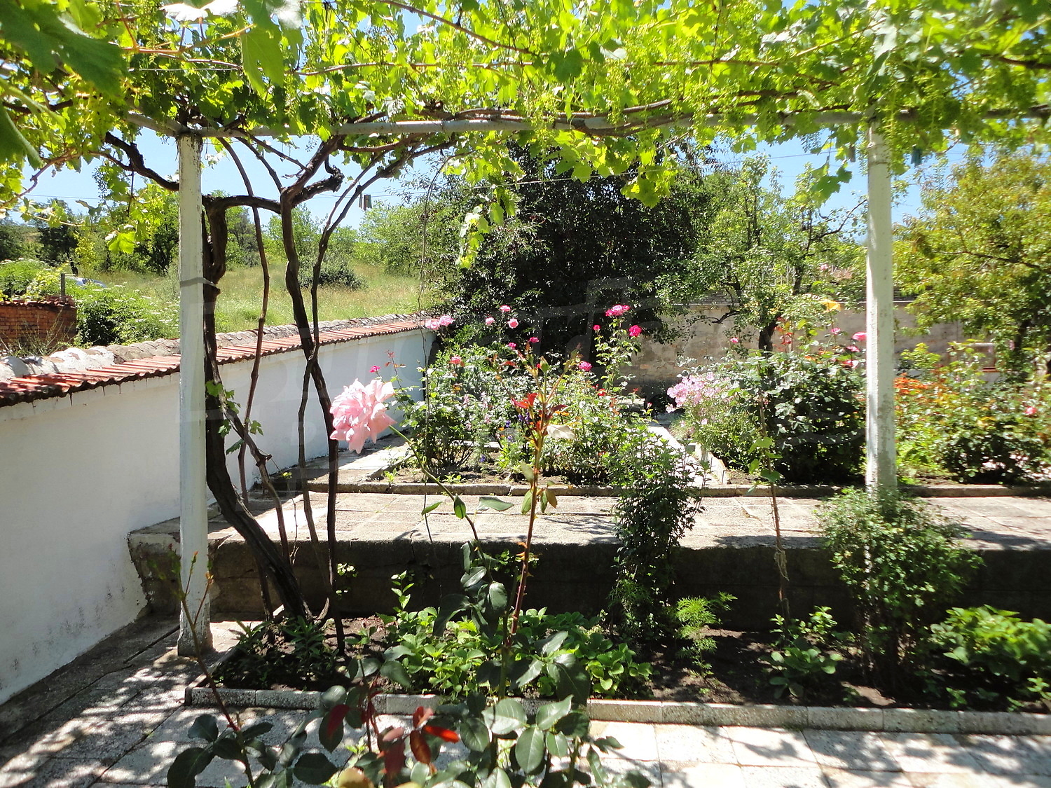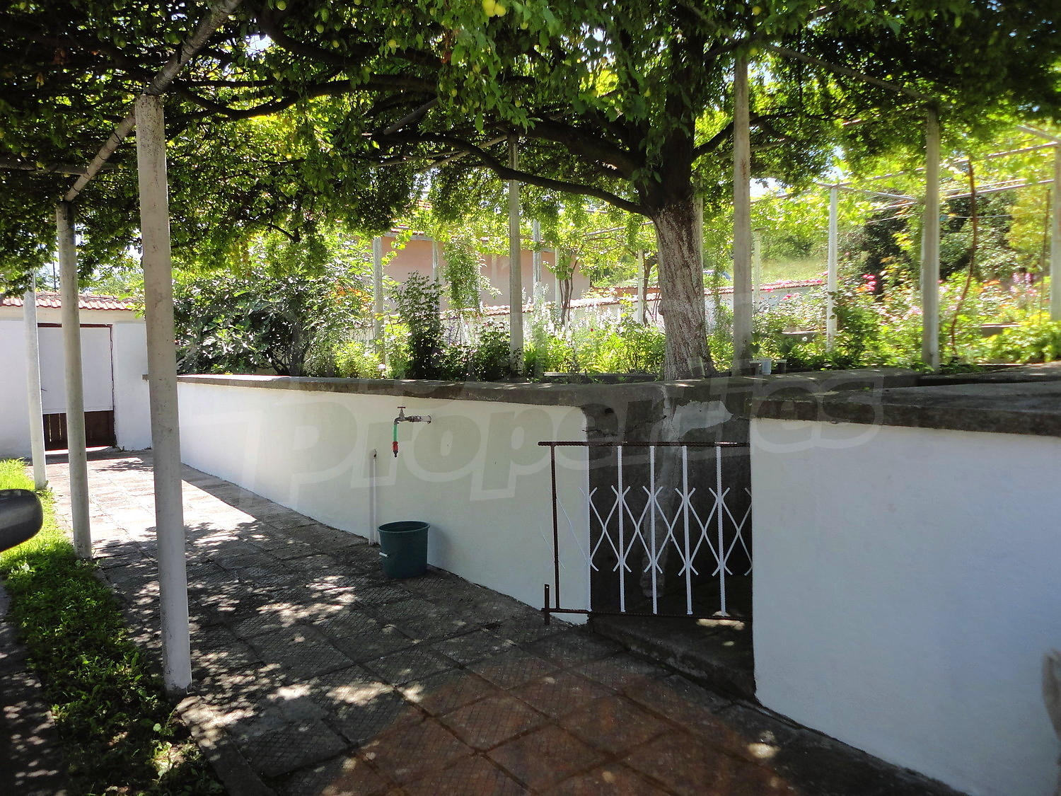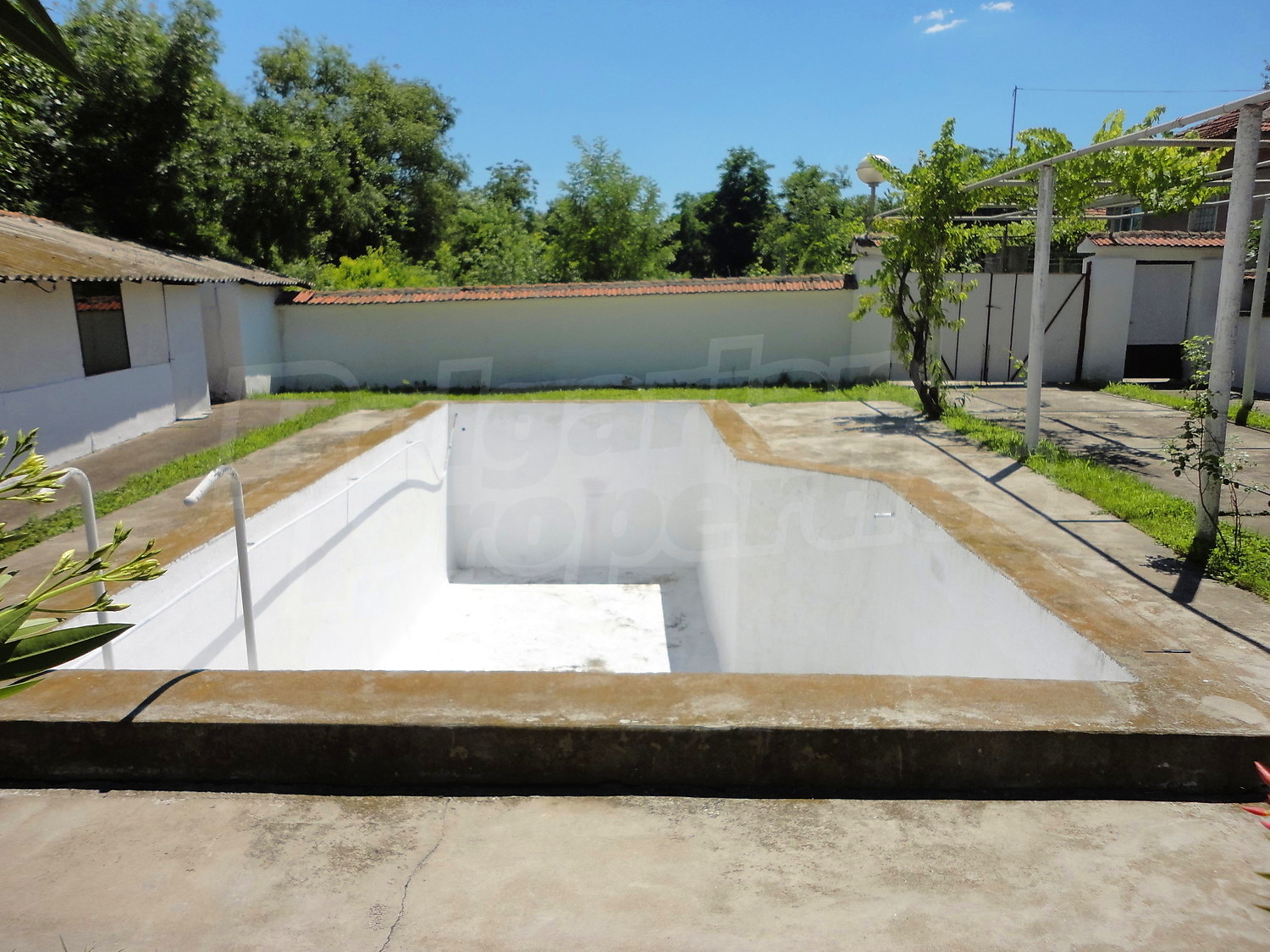 The garden is planted with fruit trees, flowers and trellis vine. There is also a swimming pool.