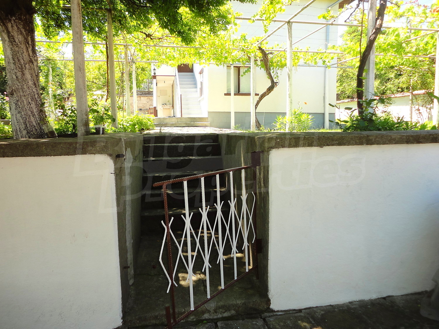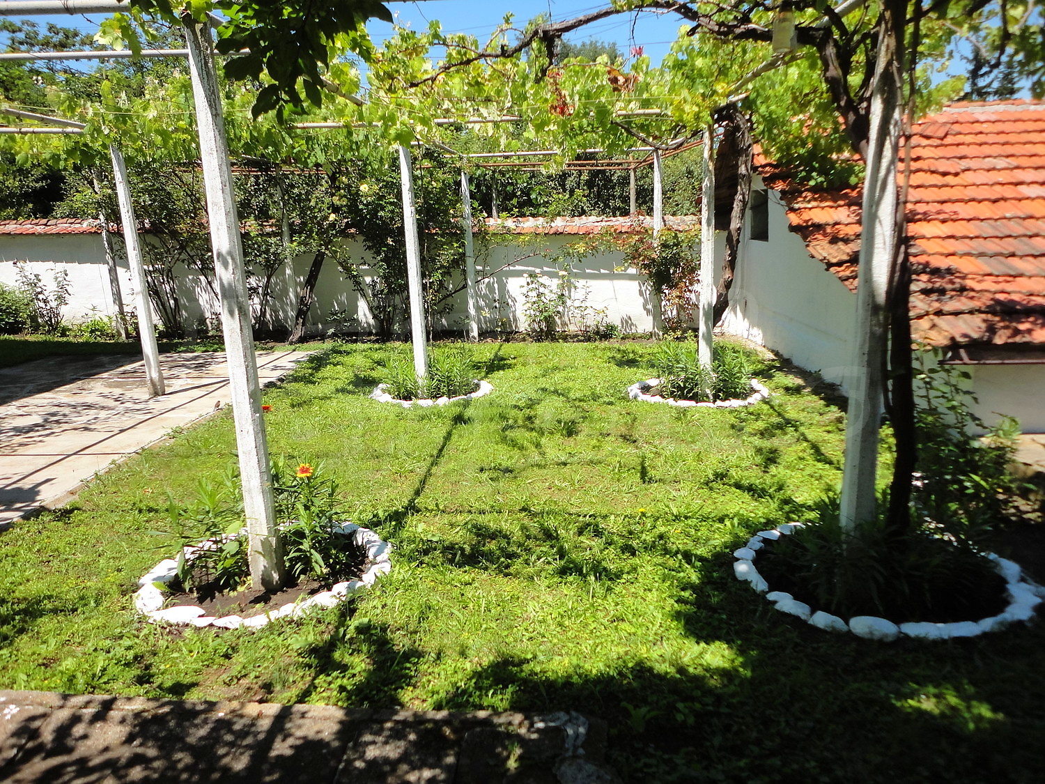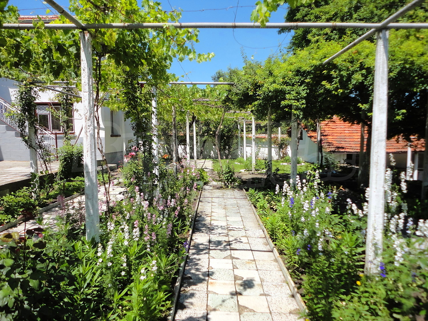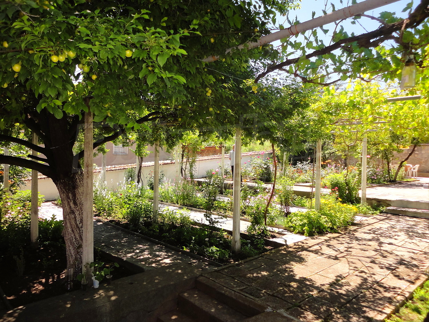 The garden is planted with fruit trees, flowers and trellis vine. There is also a swimming pool.