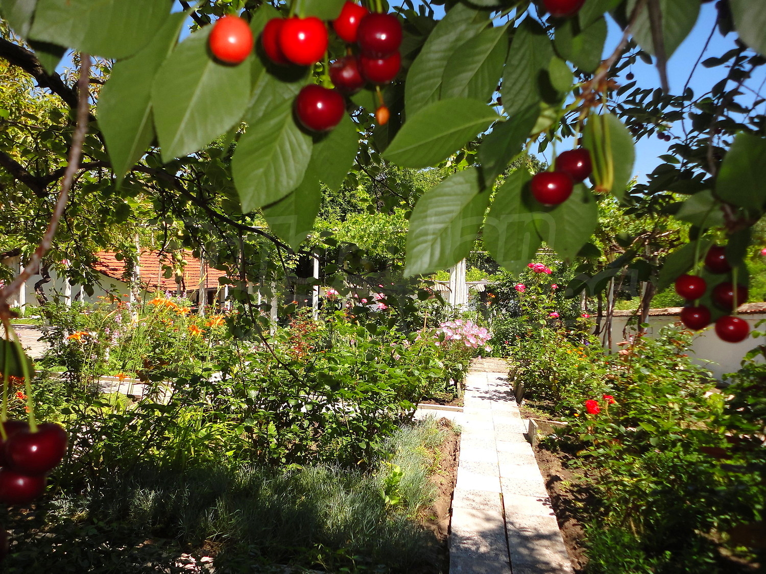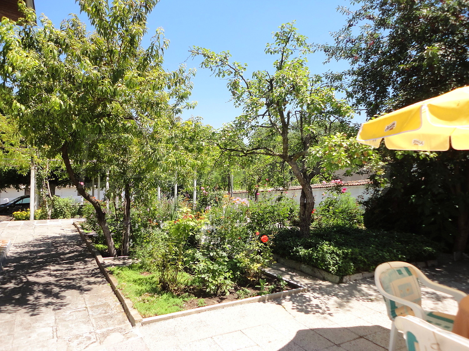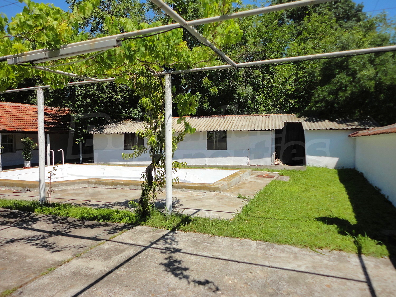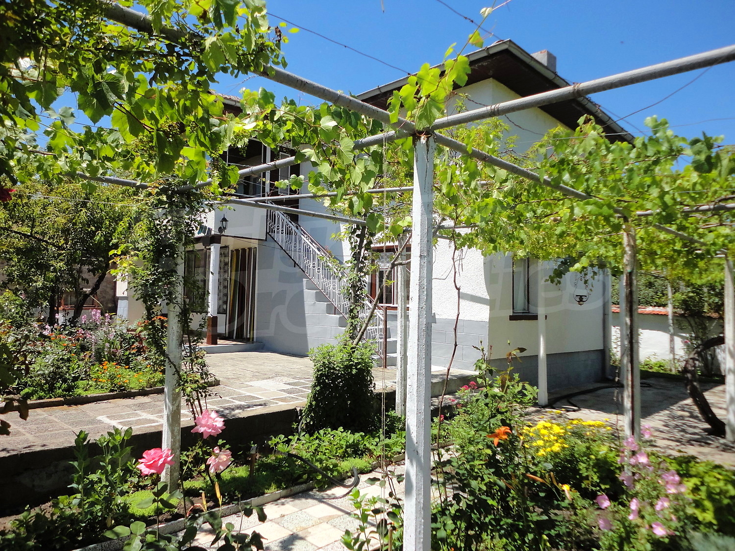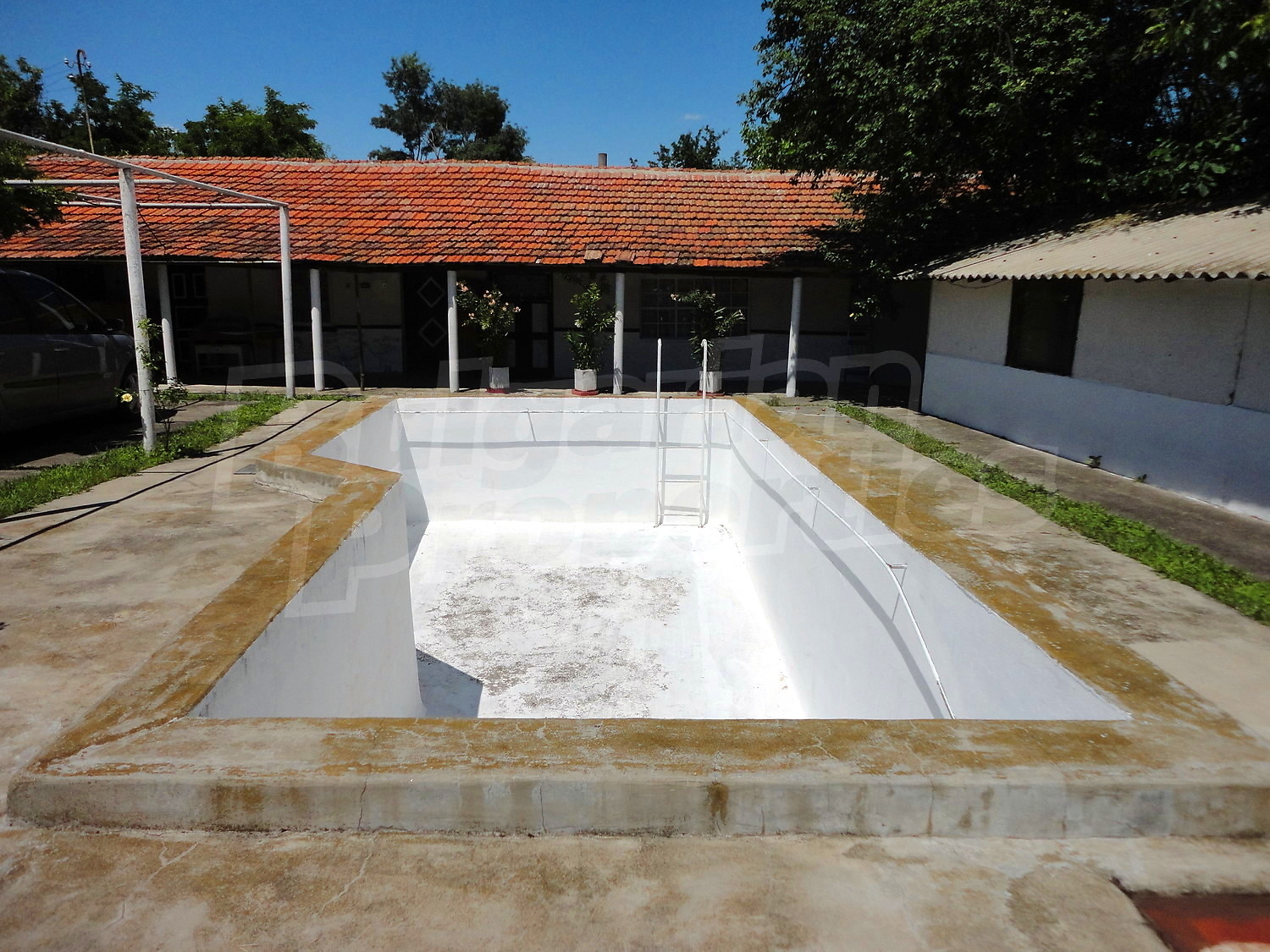 The garden is planted with fruit trees, flowers and trellis vine. There is also a swimming pool.