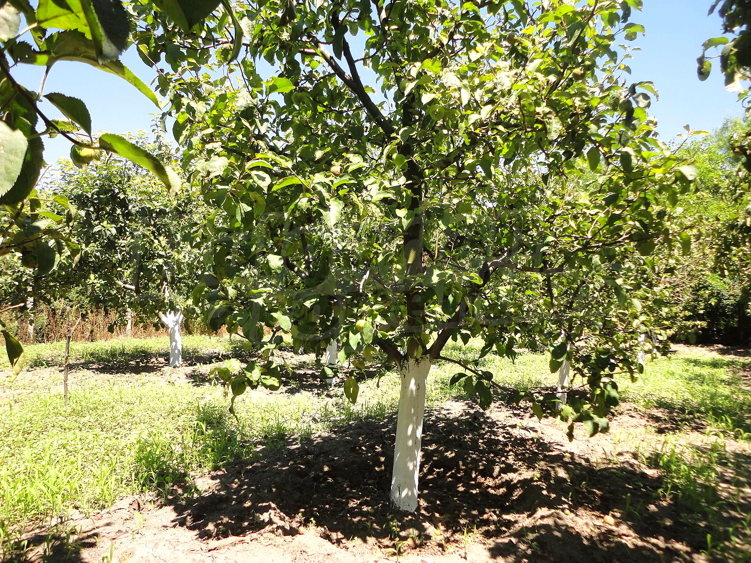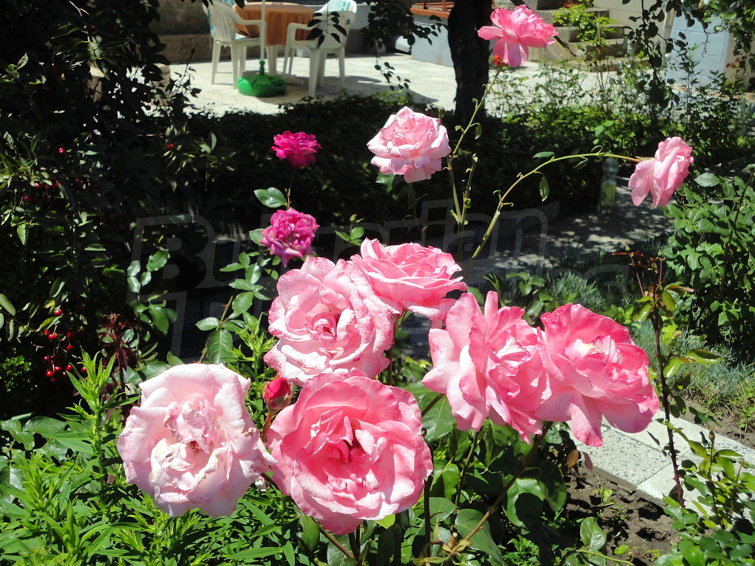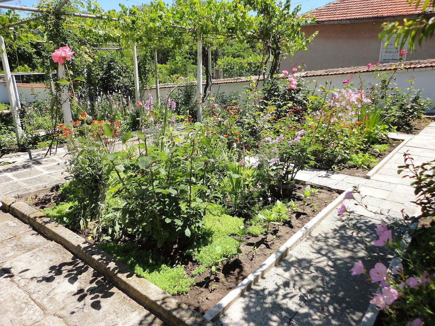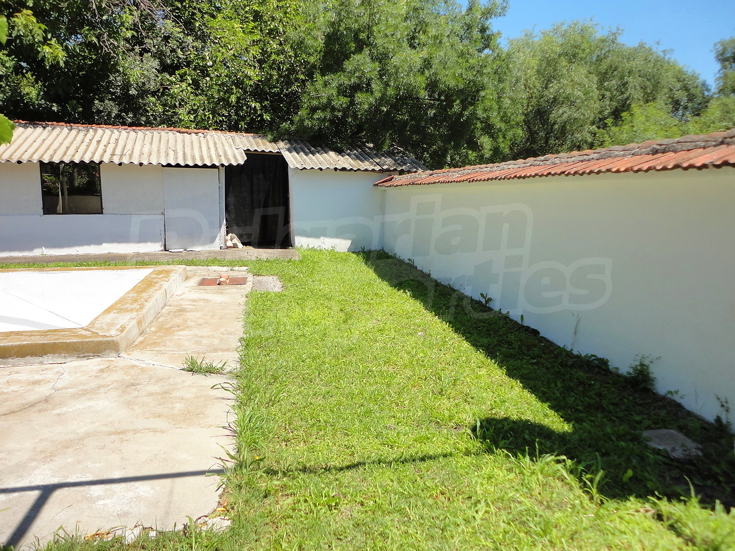 The garden is planted with fruit trees, flowers and trellis vine. There is also a swimming pool.