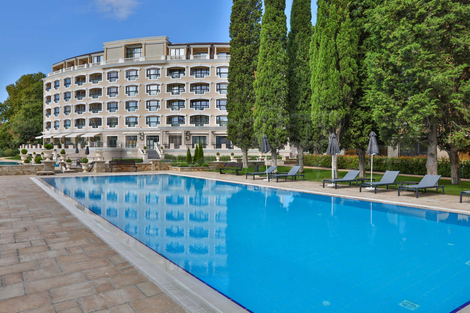 The resort of Sts Constantine and Helena is the oldest Bulgarian seaside resort, located in a picturesque natural park. The resort harmoniously merges ancient history, exotic nature and modern architecture. Gentle sunrays, sparkling waters of the sea together with fresh air of the woods and magic scent of the secular trees leave an unforgettable impression.Located in the central part of the resort, the place attracts with its convenient location, easy access to the sea and peace and quiet.