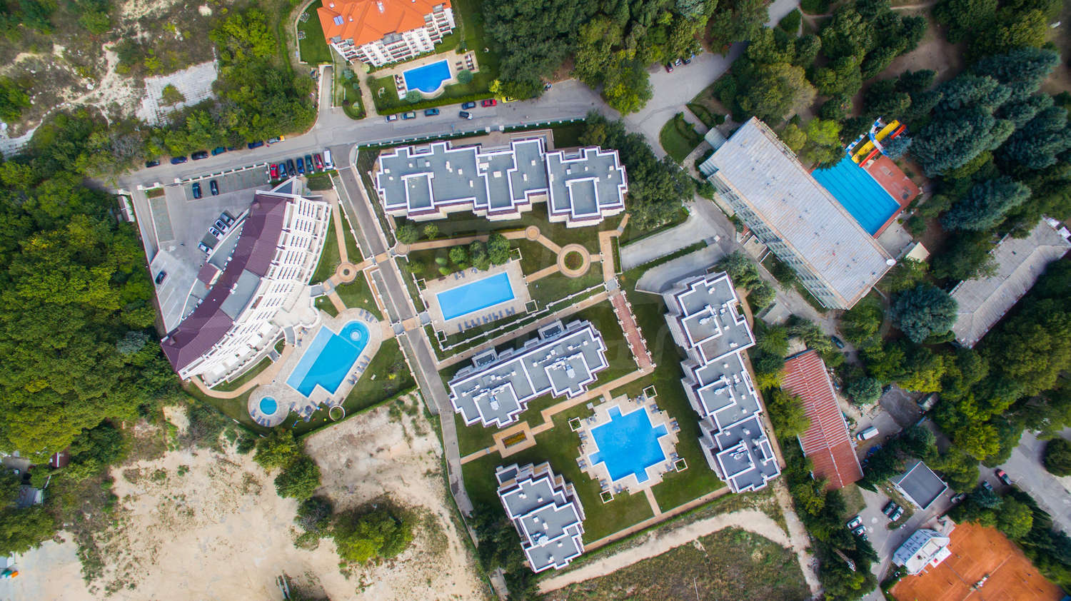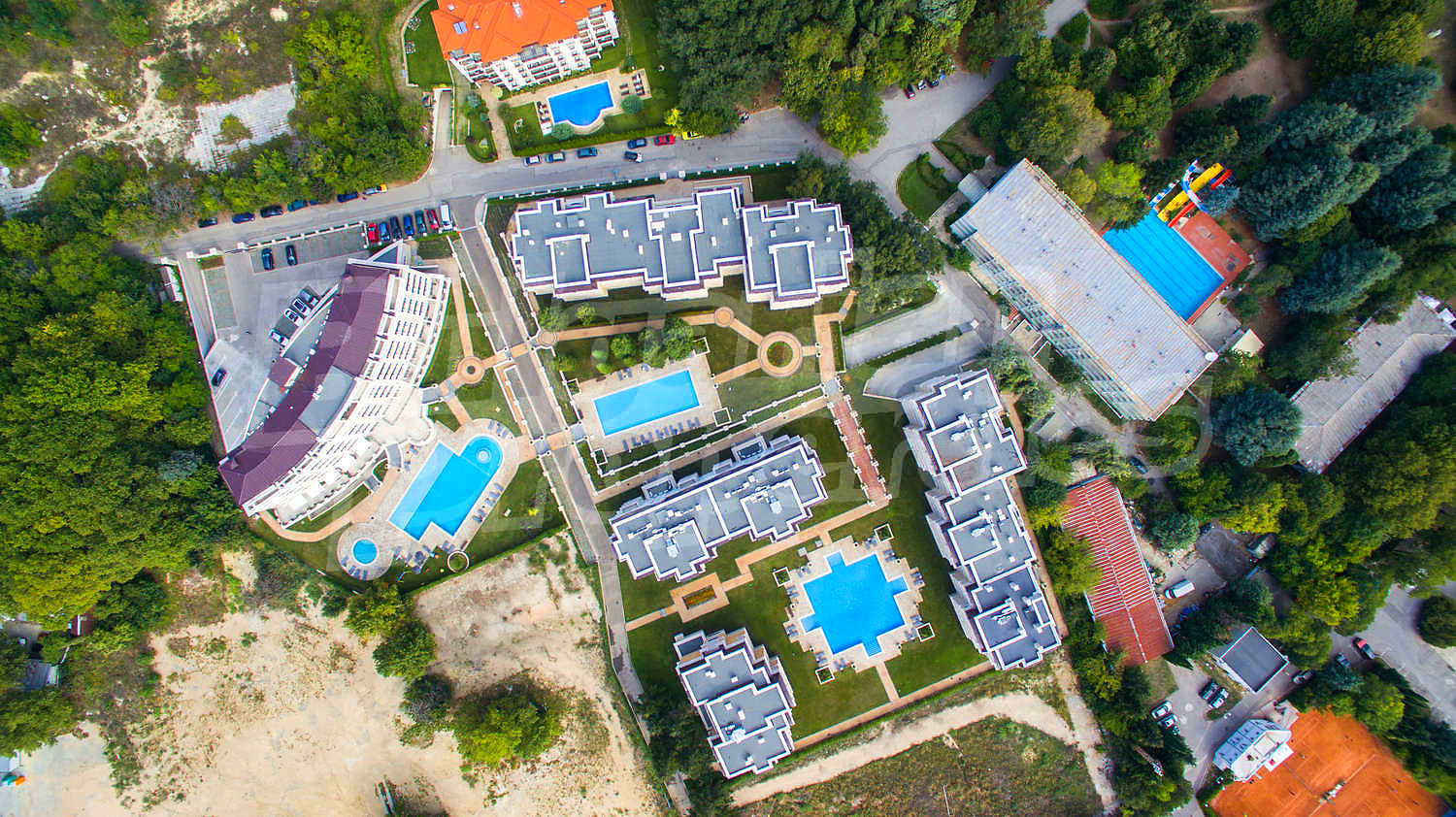 The complex consists of five buildings with studios, one- and two bedroom apartments, with an outdoor swimming pool, garden and recreation area, spa complex, restaurant, shop, playground and parking. Each of the luxury buildings offers turn-key apartments finished with natural materials (parquet and stone), with an air conditioner in each room.