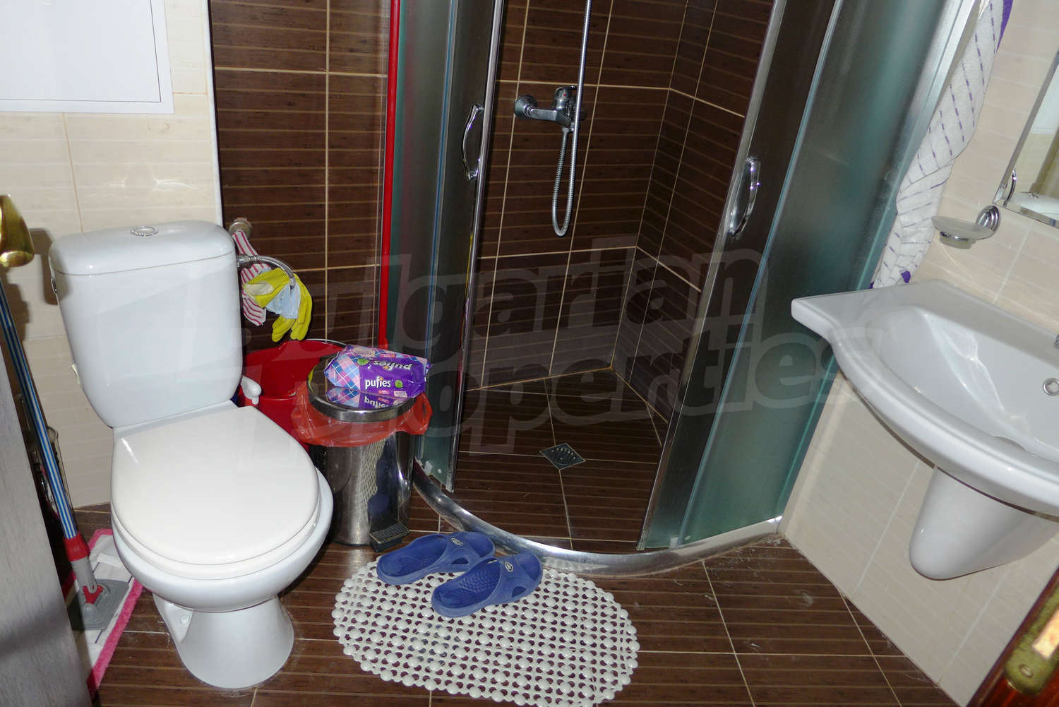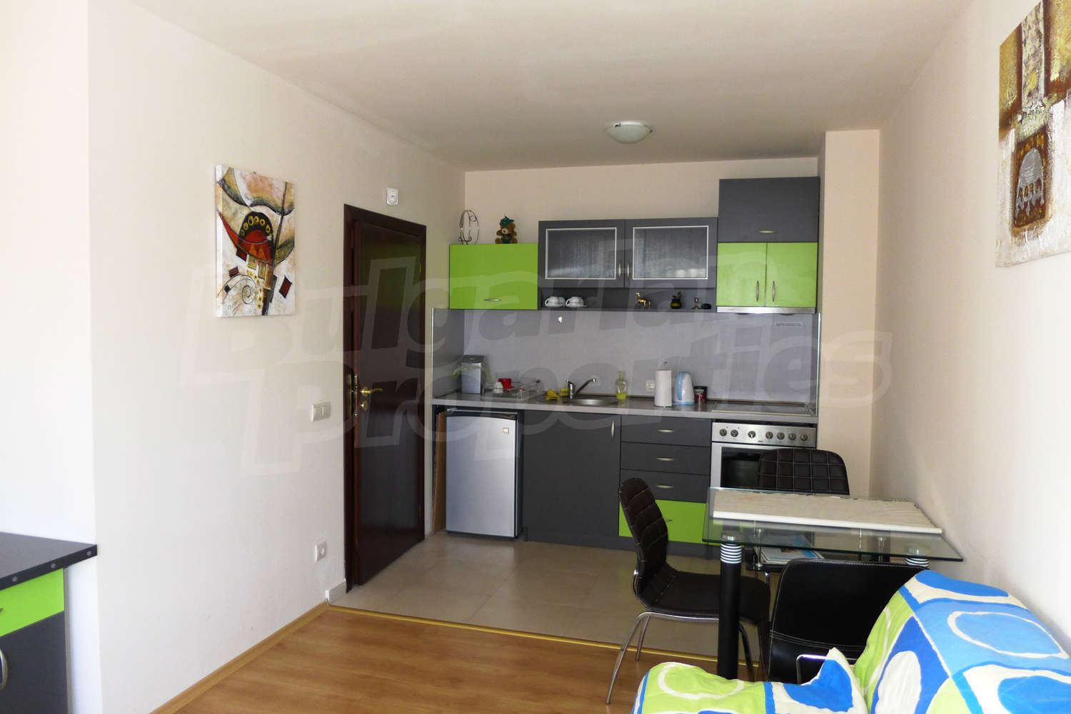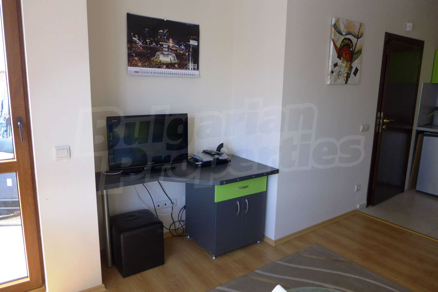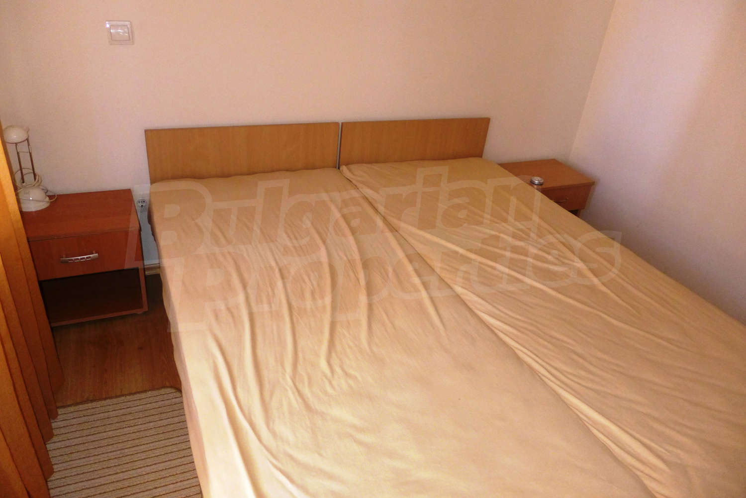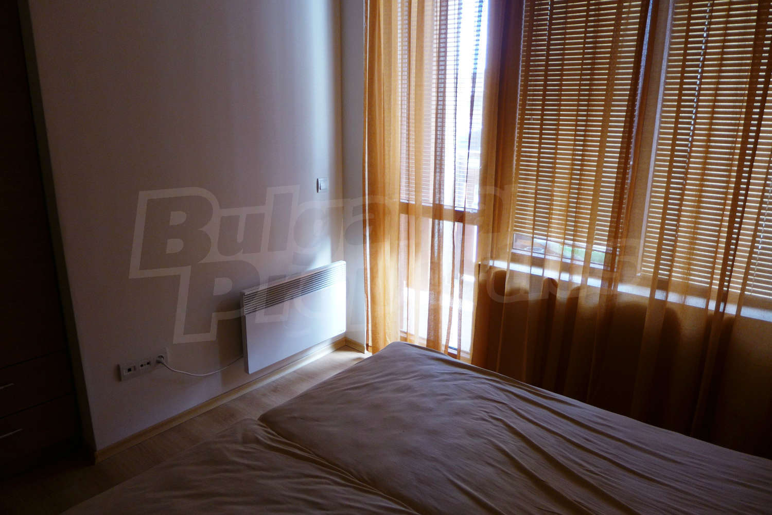 The newly-built apartment (54 sq.m., 2008) is located on the first floor, facing east with beautiful views of the mountains and the surrounding buildings. The joinery is PVC, the flooring - laminate and tiles, and the walls are painted. The apartment has one balcony (terracotta tiles and wooden railing). The kitchen comes with furniture and built-in oven, a refrigerator, a sink, a mixer. The living room - with a two-seat sofa with a coffee table, a desk, paintings. The bedroom – a double bed, tables, a wardrobe. The bathroom with WC - walls - faience, flooring - tiles, a shower box, a porcelain sink with mixer, an electric water heater. The heating is by electric radiators. The flat is equipped with cable TV and Internet.