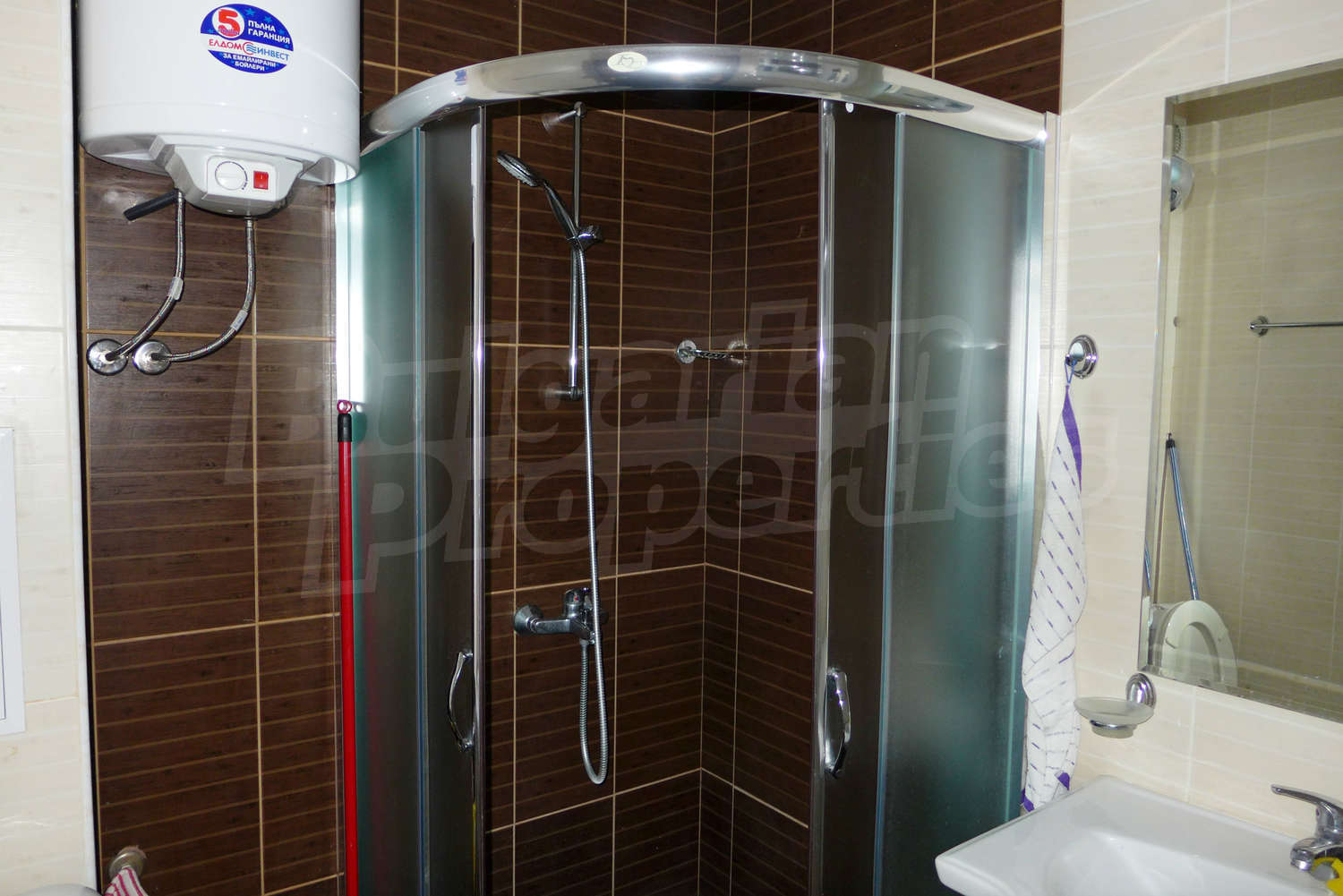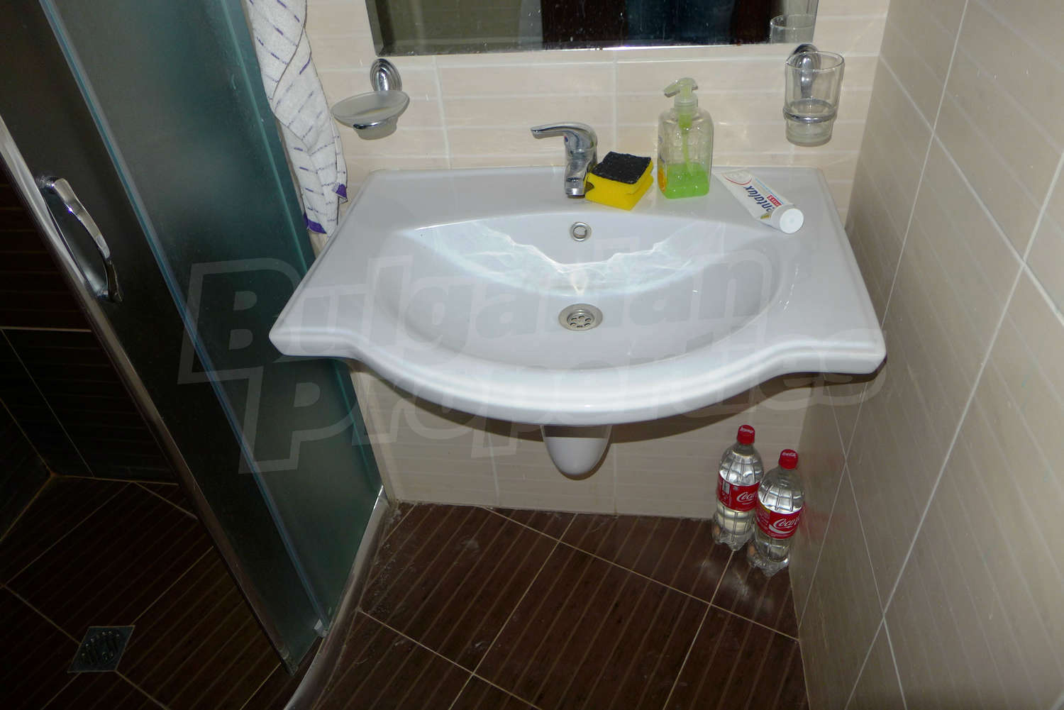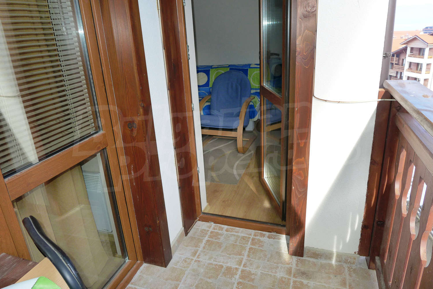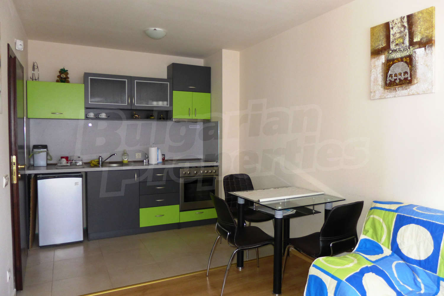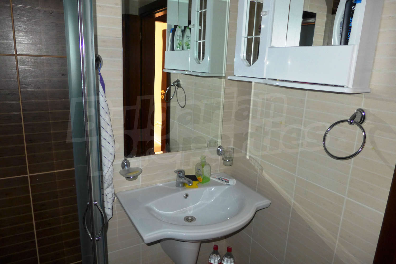The newly-built apartment (54 sq.m., 2008) is located on the first floor, facing east with beautiful views of the mountains and the surrounding buildings. The joinery is PVC, the flooring - laminate and tiles, and the walls are painted. The apartment has one balcony (terracotta tiles and wooden railing). The kitchen comes with furniture and built-in oven, a refrigerator, a sink, a mixer. The living room - with a two-seat sofa with a coffee table, a desk, paintings. The bedroom – a double bed, tables, a wardrobe. The bathroom with WC - walls - faience, flooring - tiles, a shower box, a porcelain sink with mixer, an electric water heater. The heating is by electric radiators. The flat is equipped with cable TV and Internet.