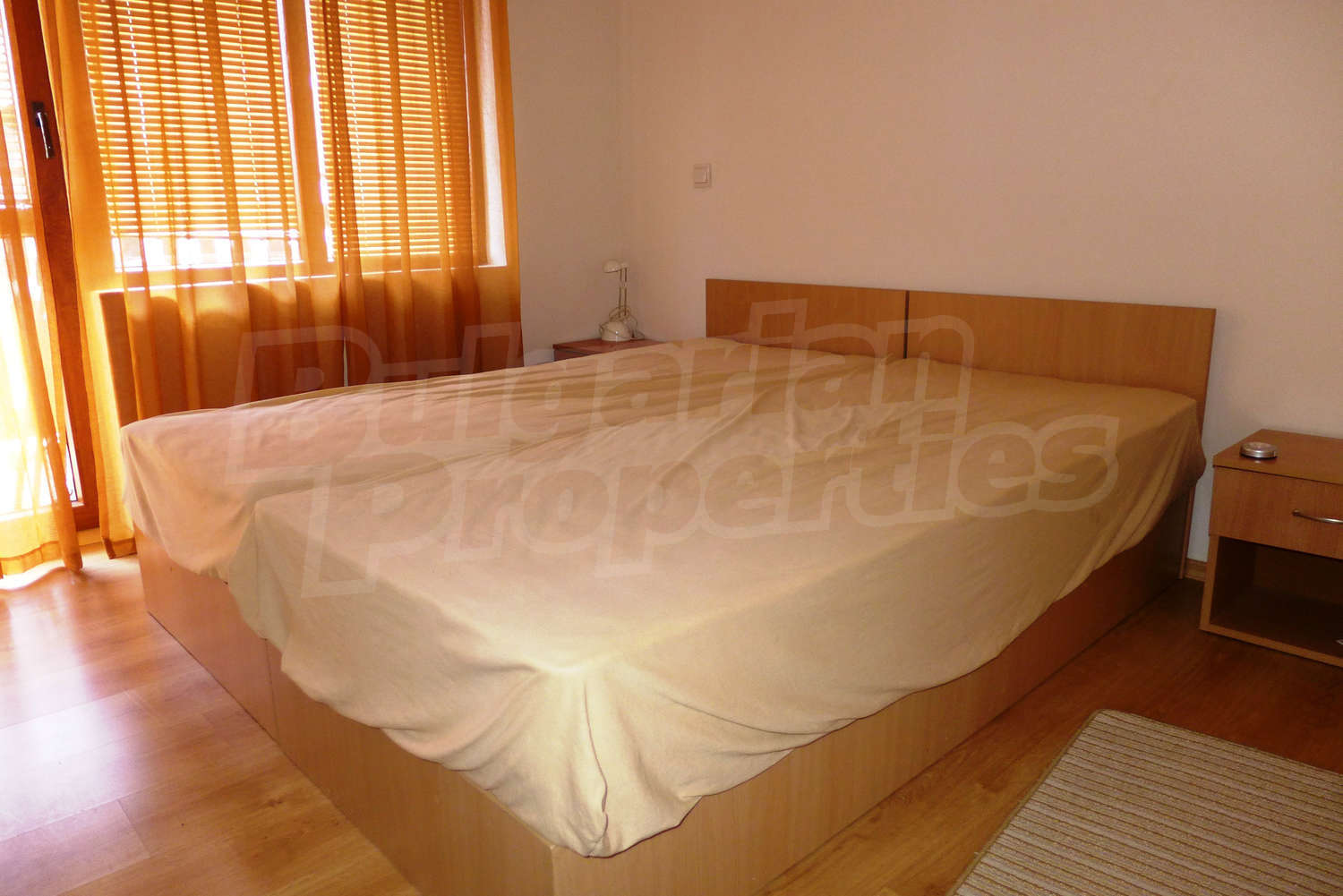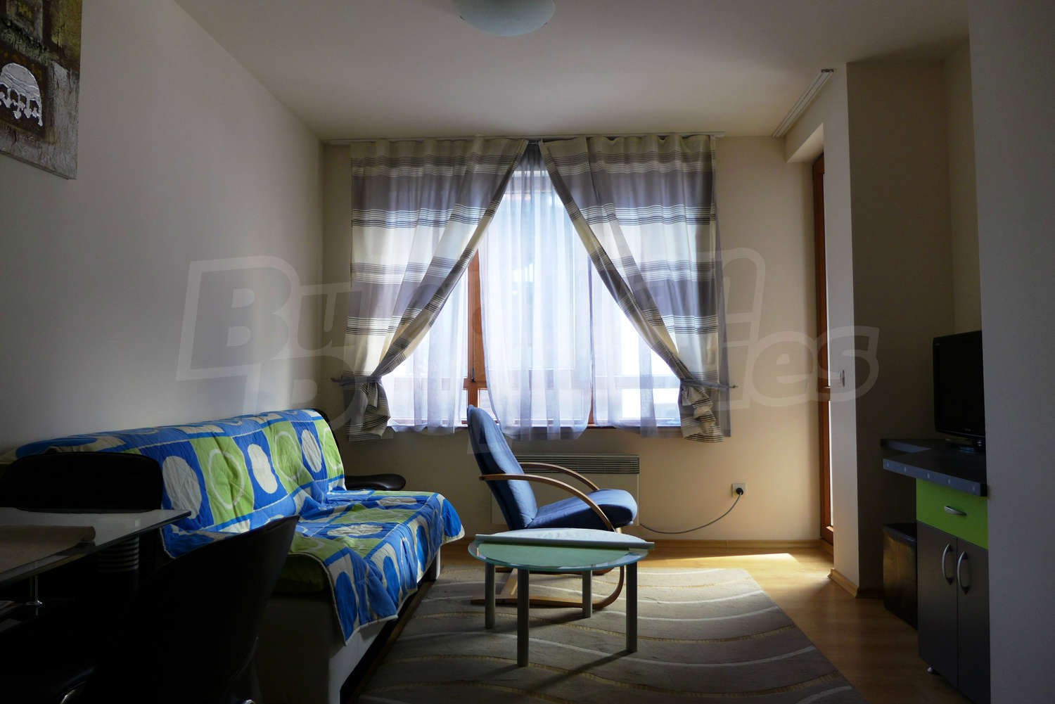 The newly-built apartment (54 sq.m., 2008) is located on the first floor, facing east with beautiful views of the mountains and the surrounding buildings. The joinery is PVC, the flooring - laminate and tiles, and the walls are painted. The apartment has one balcony (terracotta tiles and wooden railing). The kitchen comes with furniture and built-in oven, a refrigerator, a sink, a mixer. The living room - with a two-seat sofa with a coffee table, a desk, paintings. The bedroom – a double bed, tables, a wardrobe. The bathroom with WC - walls - faience, flooring - tiles, a shower box, a porcelain sink with mixer, an electric water heater. The heating is by electric radiators. The flat is equipped with cable TV and Internet.