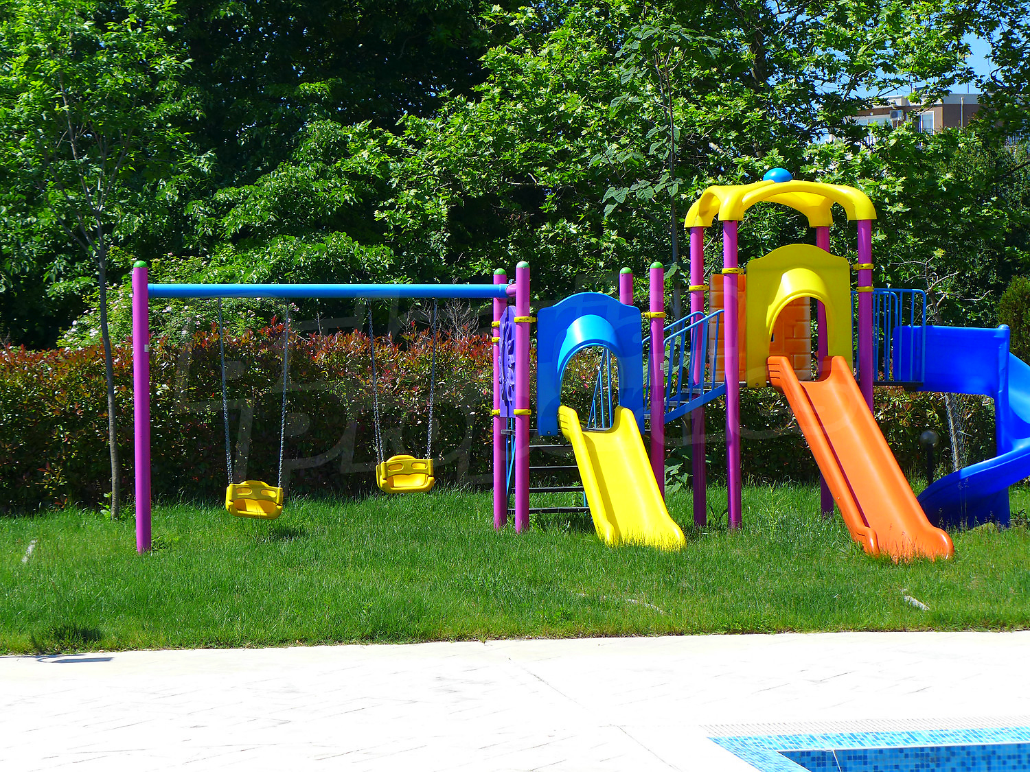 7. Swimming pool with water ramps and deck chairs
