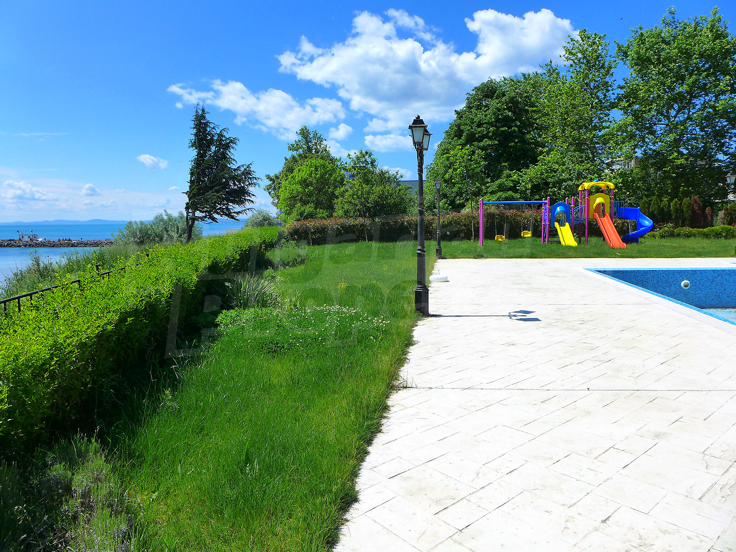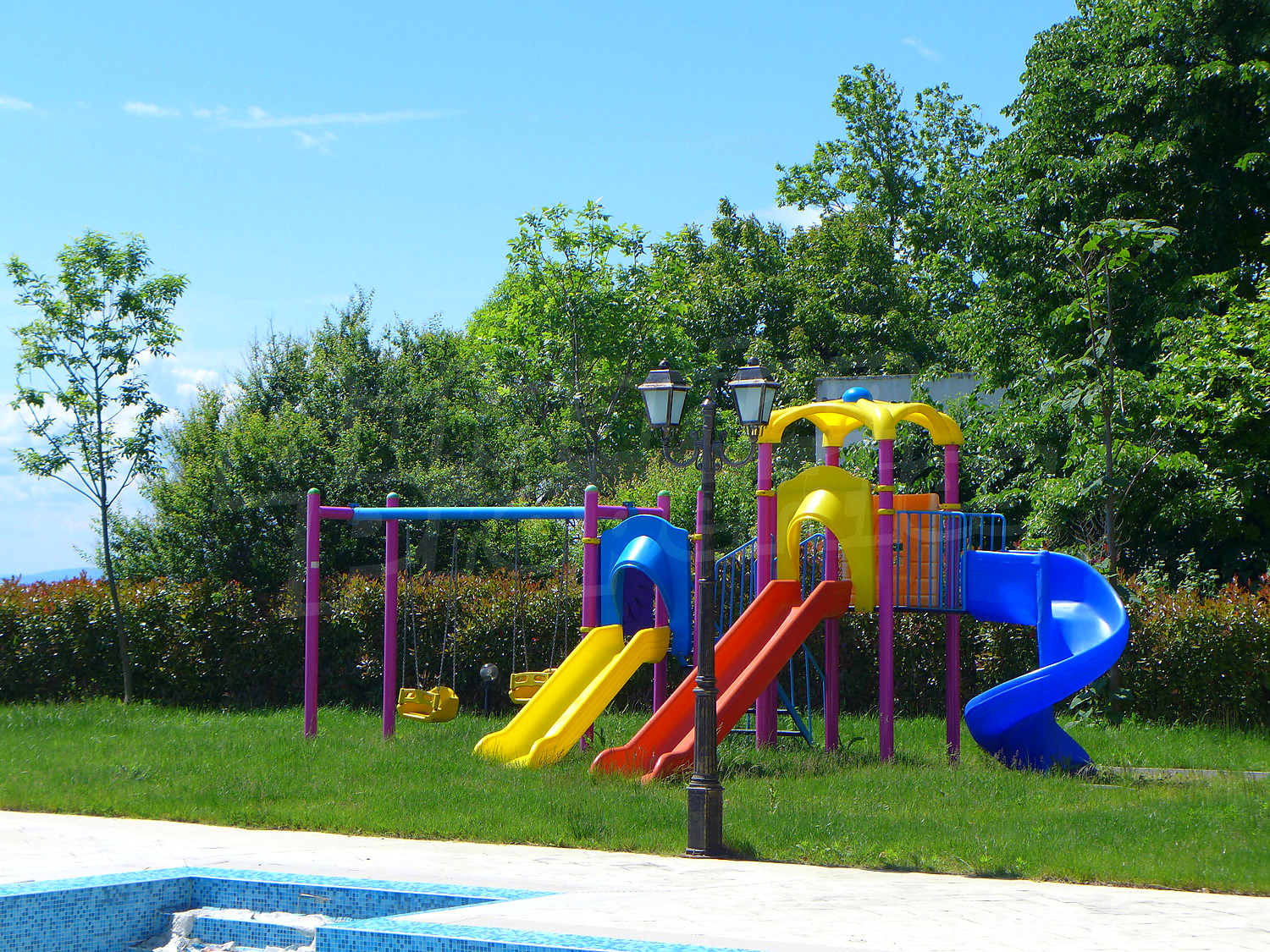 7. Swimming pool with water ramps and deck chairs