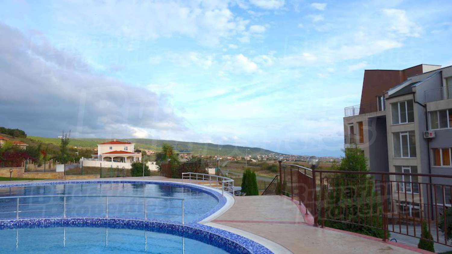One bedroom apartment on the third floor in Sunset Kosharitsa gated complex with a beautiful view towards the yard and pool. Sunset Kosharitsa is located among the beautiful nature, forests and hills, with panoramic sea views, 6 km from the beach and 300 m to the bus stop. The area offers combination between fresh mountain air and cooling sea breeze for your unforgettable summer holidays.