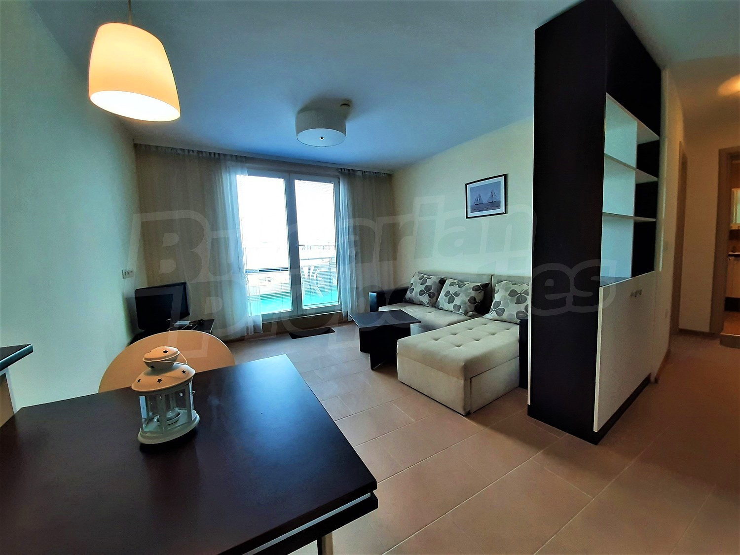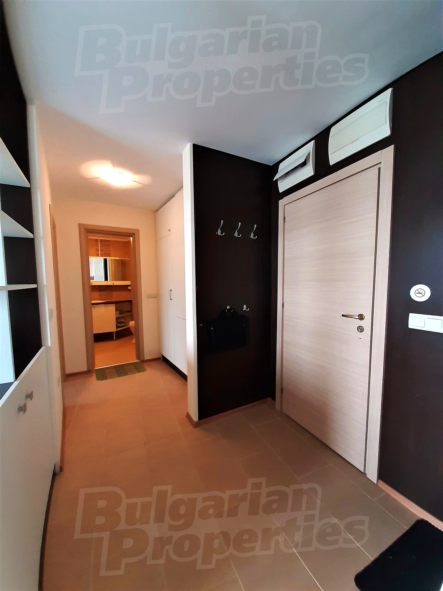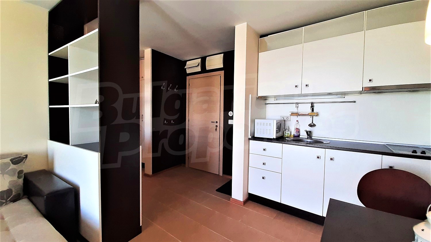 The apartment was built in 2013. The flat is located on the fifth floor and has a total area of 68.03 sq.m., net area of 58.87 sq.m. and 9.16 sq.m. common parts. It is divided between a living room with kitchenette, a hallway, a bedroom, a bathroom with WC and a terrace. The apartment is finished with luxury furniture. The kitchen has all necessary electrical appliances - an extractor fan, a ceramic hob, a sink, a microwave, a built-in refrigerator and washing machine. The walls are painted, the floors - with granite tiles. The heating and cooling is with air conditioning. The bathroom is equipped with all necessary accessories, a shower box and a water heater. The apartment has cable TV, internet, wi-fi. The annual maintenance fee is 8 Euro per sq.m.