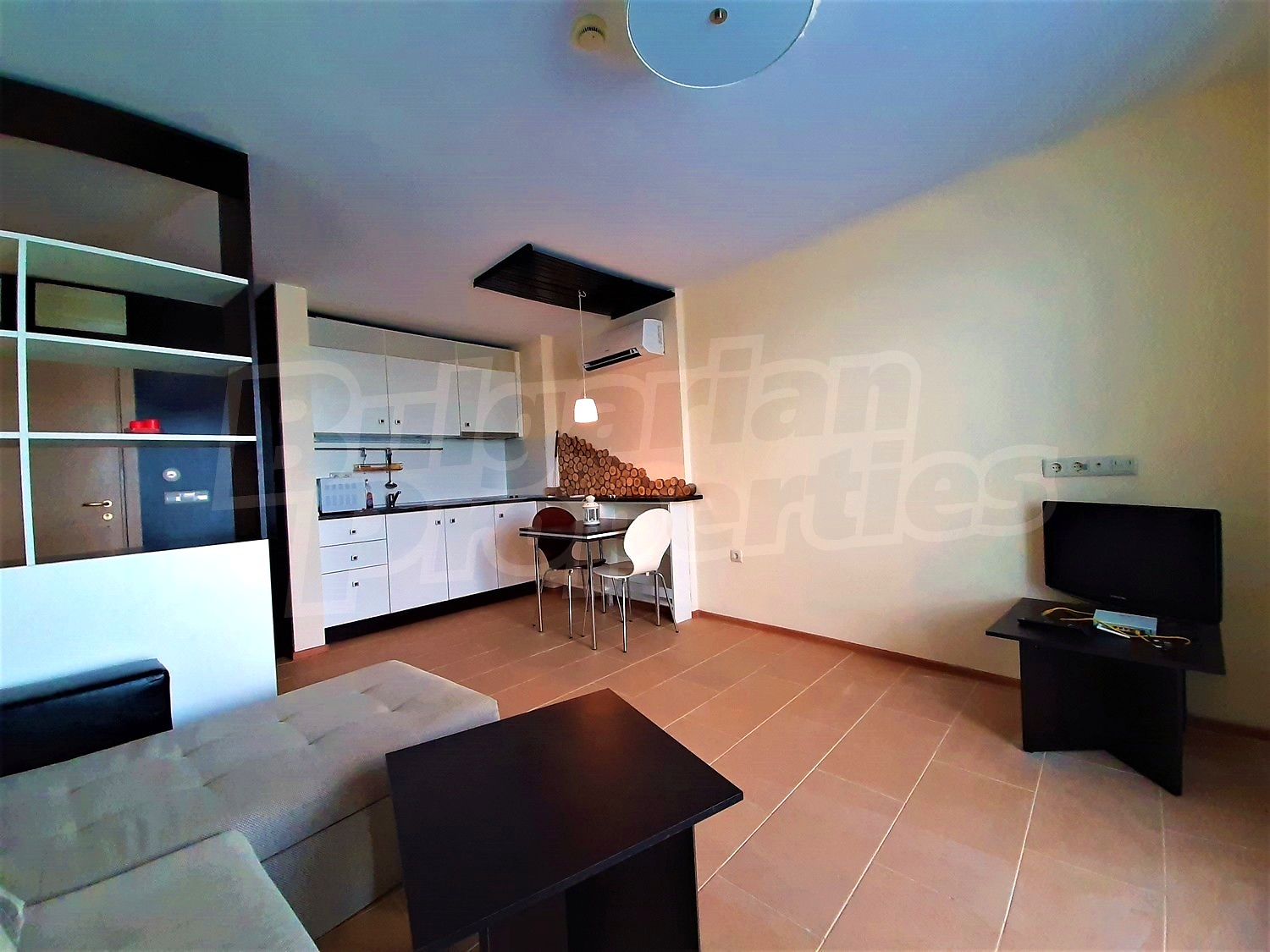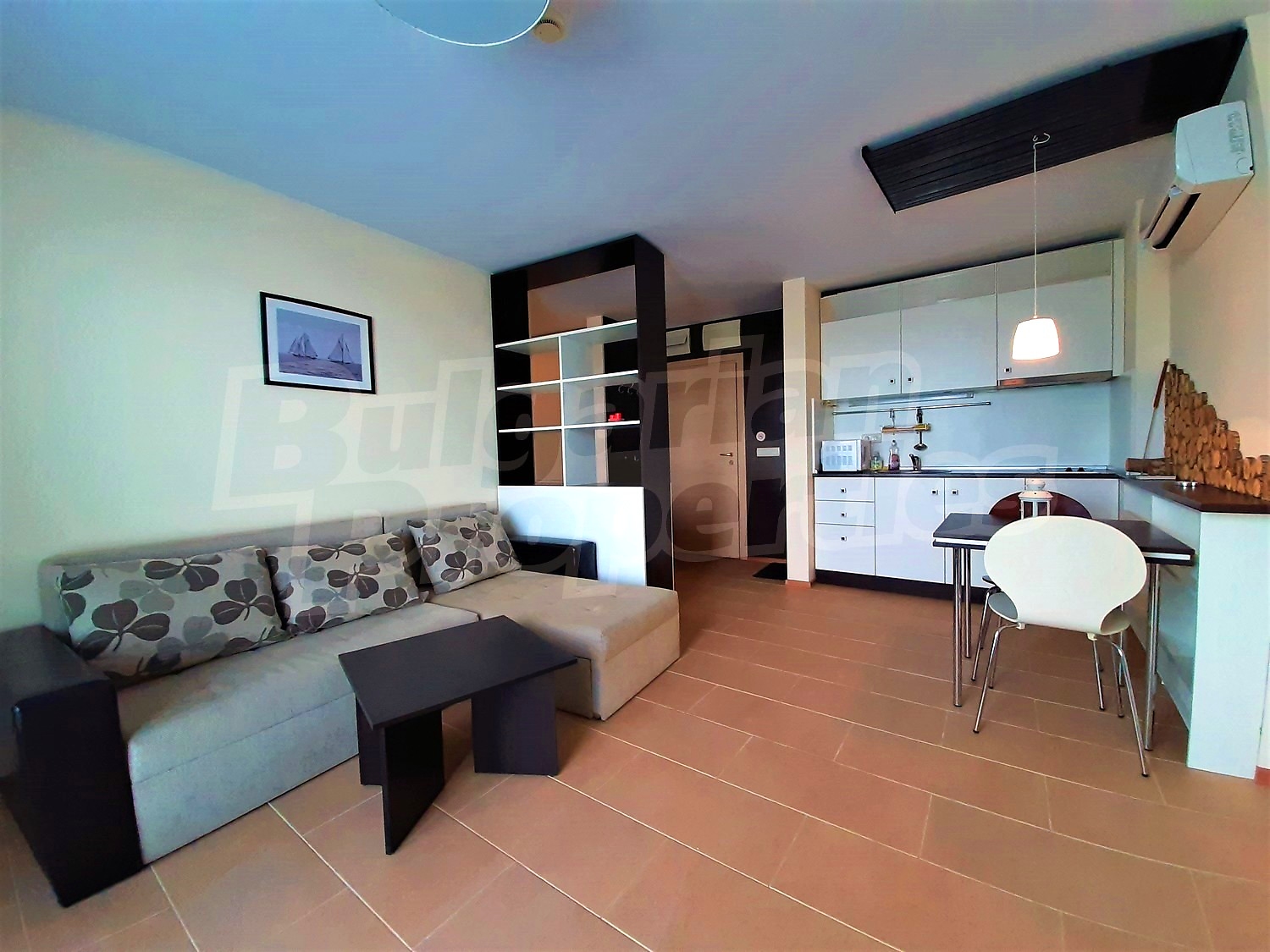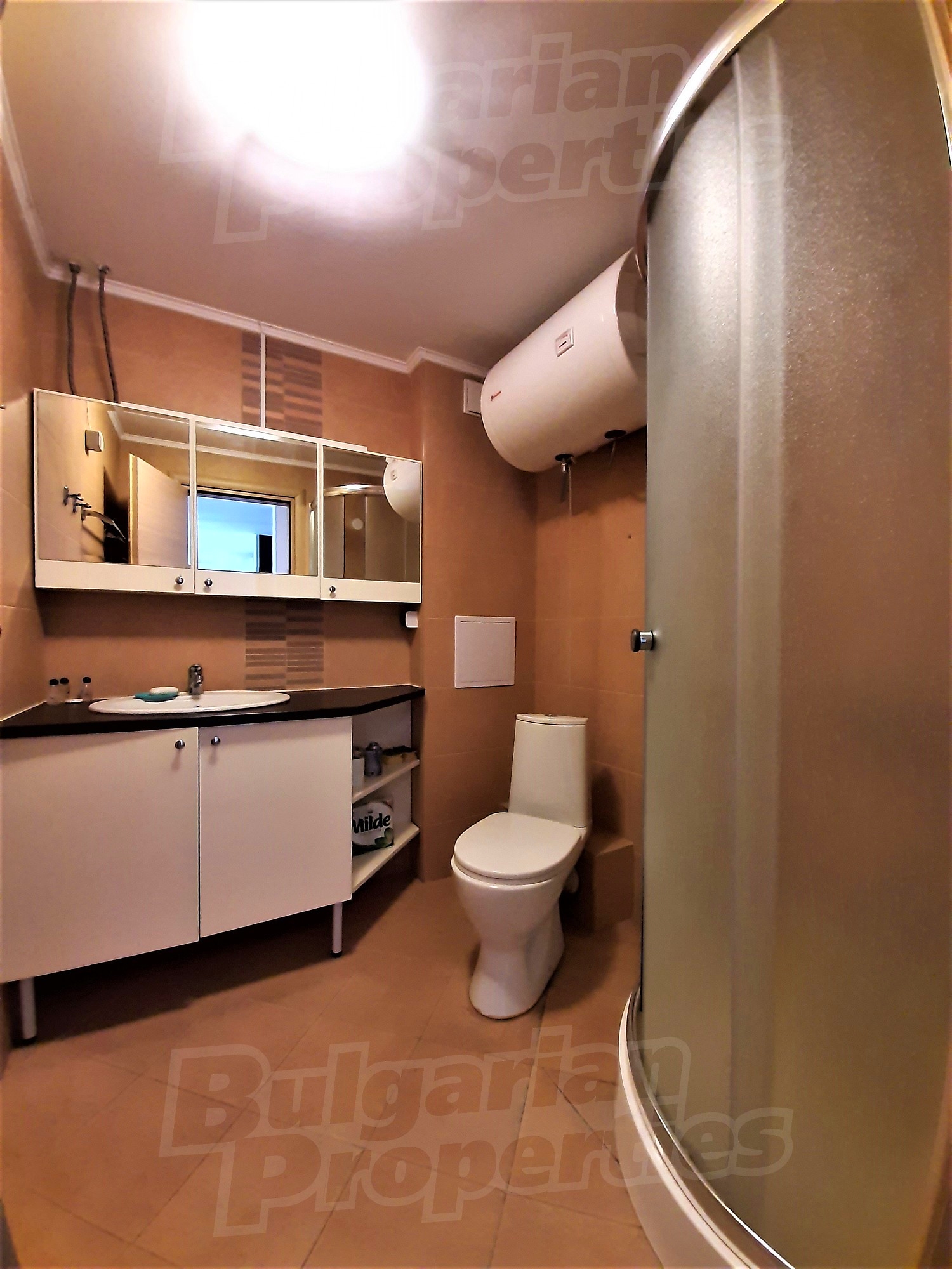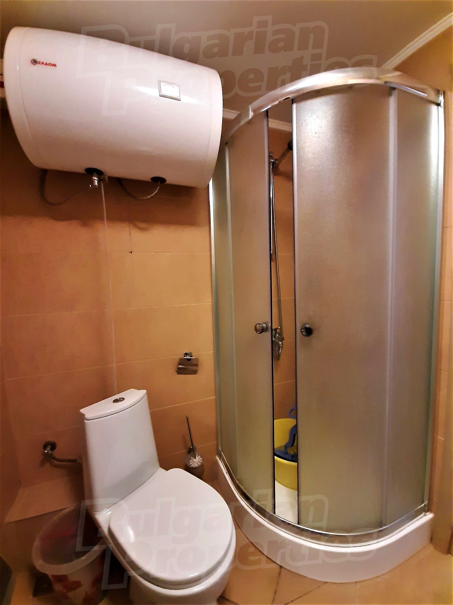 The apartment was built in 2013. The flat is located on the fifth floor and has a total area of 68.03 sq.m., net area of 58.87 sq.m. and 9.16 sq.m. common parts. It is divided between a living room with kitchenette, a hallway, a bedroom, a bathroom with WC and a terrace. The apartment is finished with luxury furniture. The kitchen has all necessary electrical appliances - an extractor fan, a ceramic hob, a sink, a microwave, a built-in refrigerator and washing machine. The walls are painted, the floors - with granite tiles. The heating and cooling is with air conditioning. The bathroom is equipped with all necessary accessories, a shower box and a water heater. The apartment has cable TV, internet, wi-fi. The annual maintenance fee is 8 Euro per sq.m.