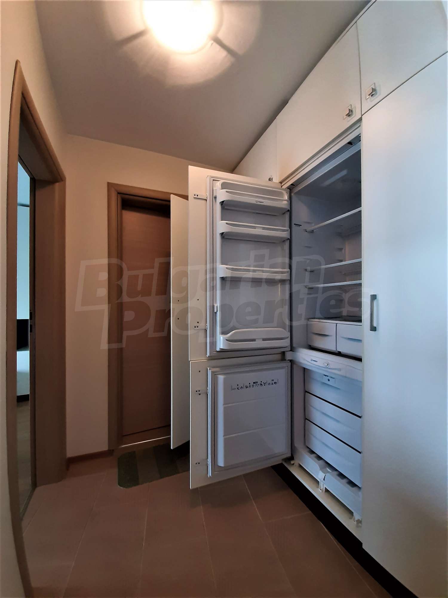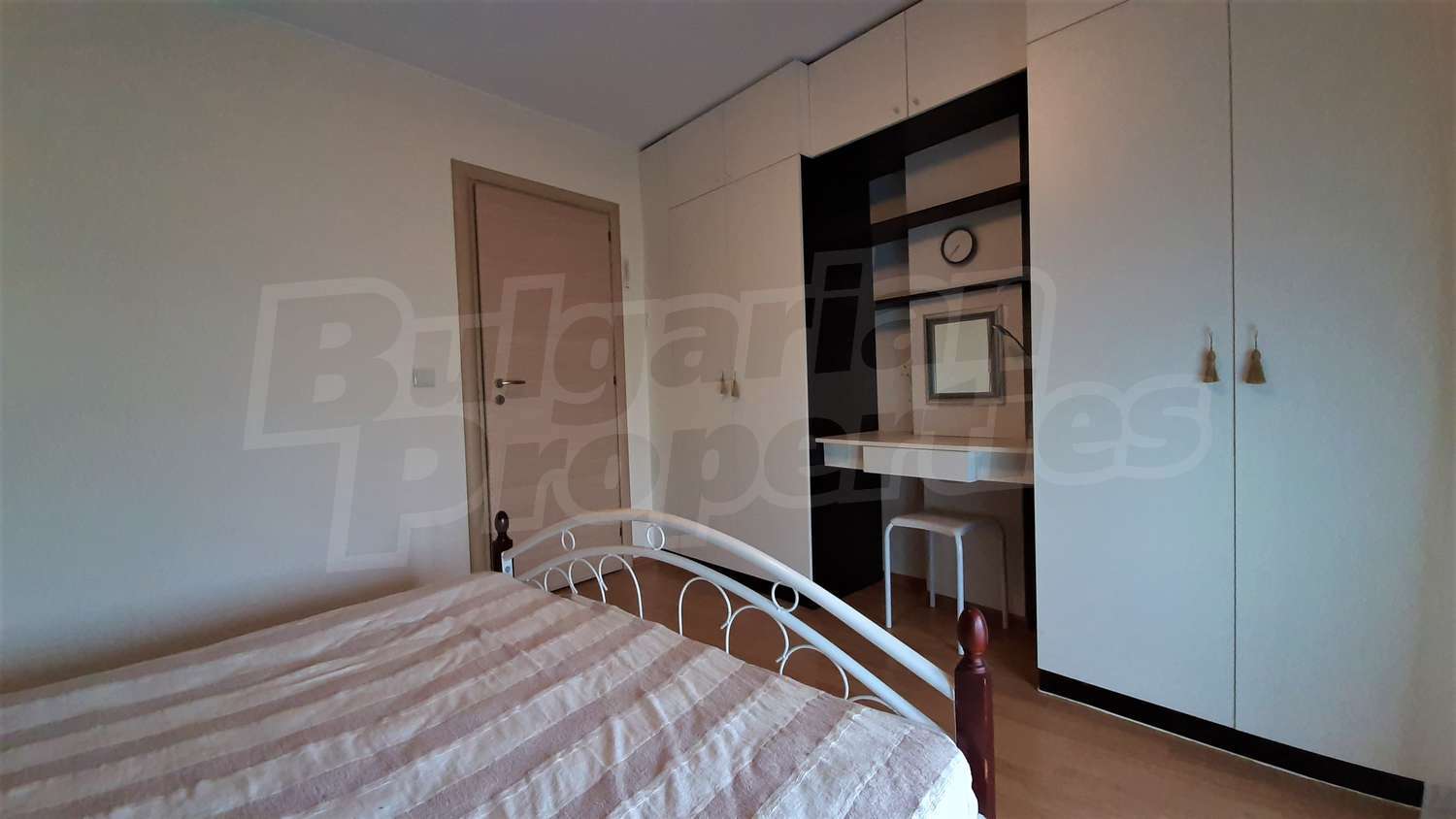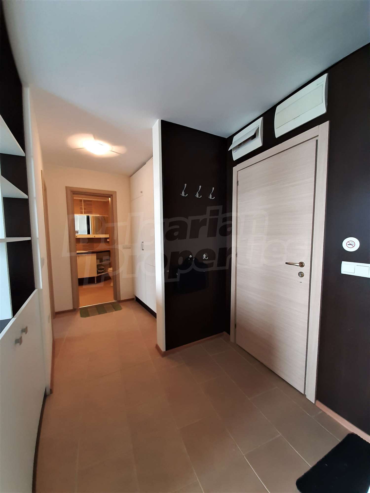 The apartment was built in 2013. The flat is located on the fifth floor and has a total area of 68.03 sq.m., net area of 58.87 sq.m. and 9.16 sq.m. common parts. It is divided between a living room with kitchenette, a hallway, a bedroom, a bathroom with WC and a terrace. The apartment is finished with luxury furniture. The kitchen has all necessary electrical appliances - an extractor fan, a ceramic hob, a sink, a microwave, a built-in refrigerator and washing machine. The walls are painted, the floors - with granite tiles. The heating and cooling is with air conditioning. The bathroom is equipped with all necessary accessories, a shower box and a water heater. The apartment has cable TV, internet, wi-fi. The annual maintenance fee is 8 Euro per sq.m.