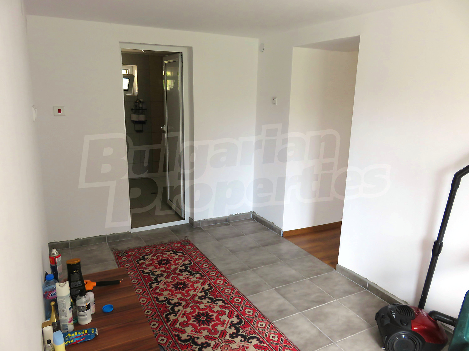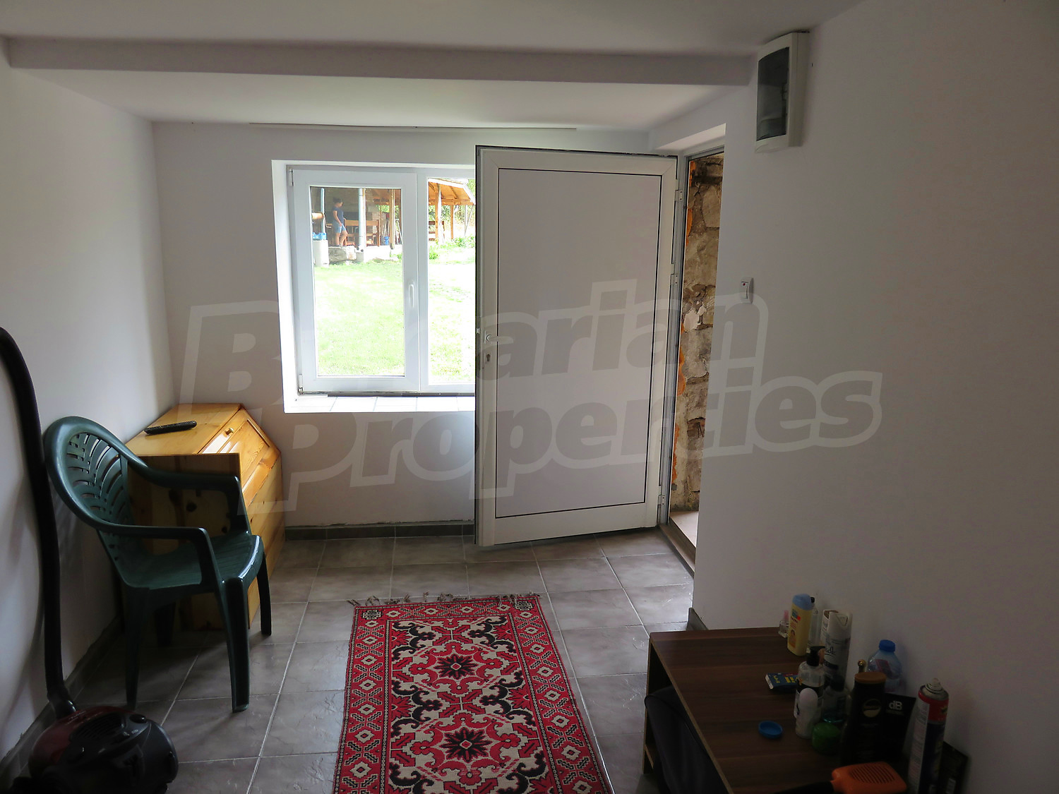 First floor: a living room with kitchen, a hallway, a storage room, a bathroom and toilet. The floors are with tiles and laminate, the windows are PVC. An external staircase.