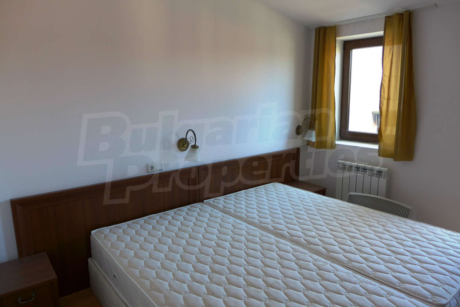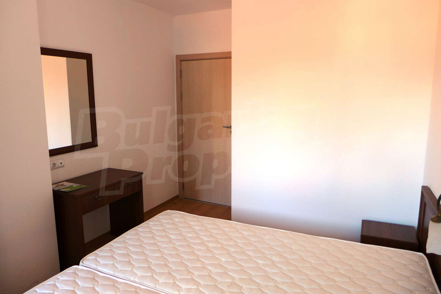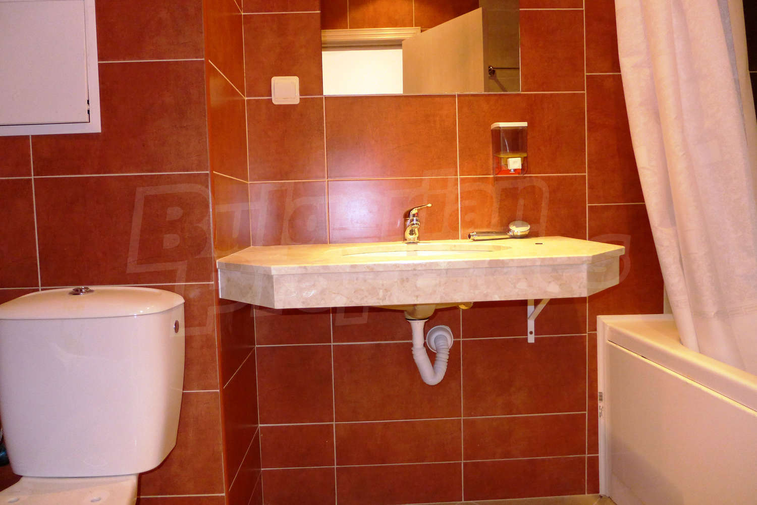 The property was built in 2006, facing west and it is set on the fourth floor. The area of 68 sq.m. is distributed between a living room with kitchenette, a bedroom, a bathroom with WC and a balcony with mountain views. The modern kitchen includes a double hob, an extractor fan, a sink. Living room - a L-Shaped sofa bed, a coffee table, a tv stand, a dining table and 4 chairs, a wardrobe, curtains. Bedroom - a double bed, 2x bedside cabinet, a wardrobe, a dressing table and mirror, curtains. Bathroom with toilet and a bathtub with shower, a sink, a mirror, a water heater. The heating is by electric radiators. The apartment is wired for telephone, cable TV and Internet. The annual maintenance fee is 200 EUR.