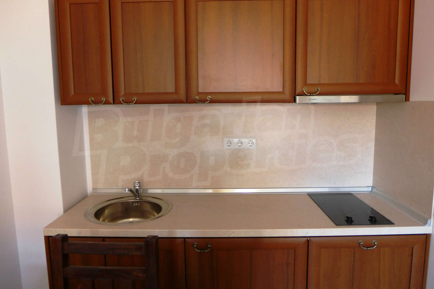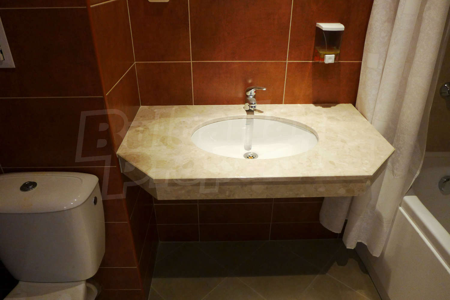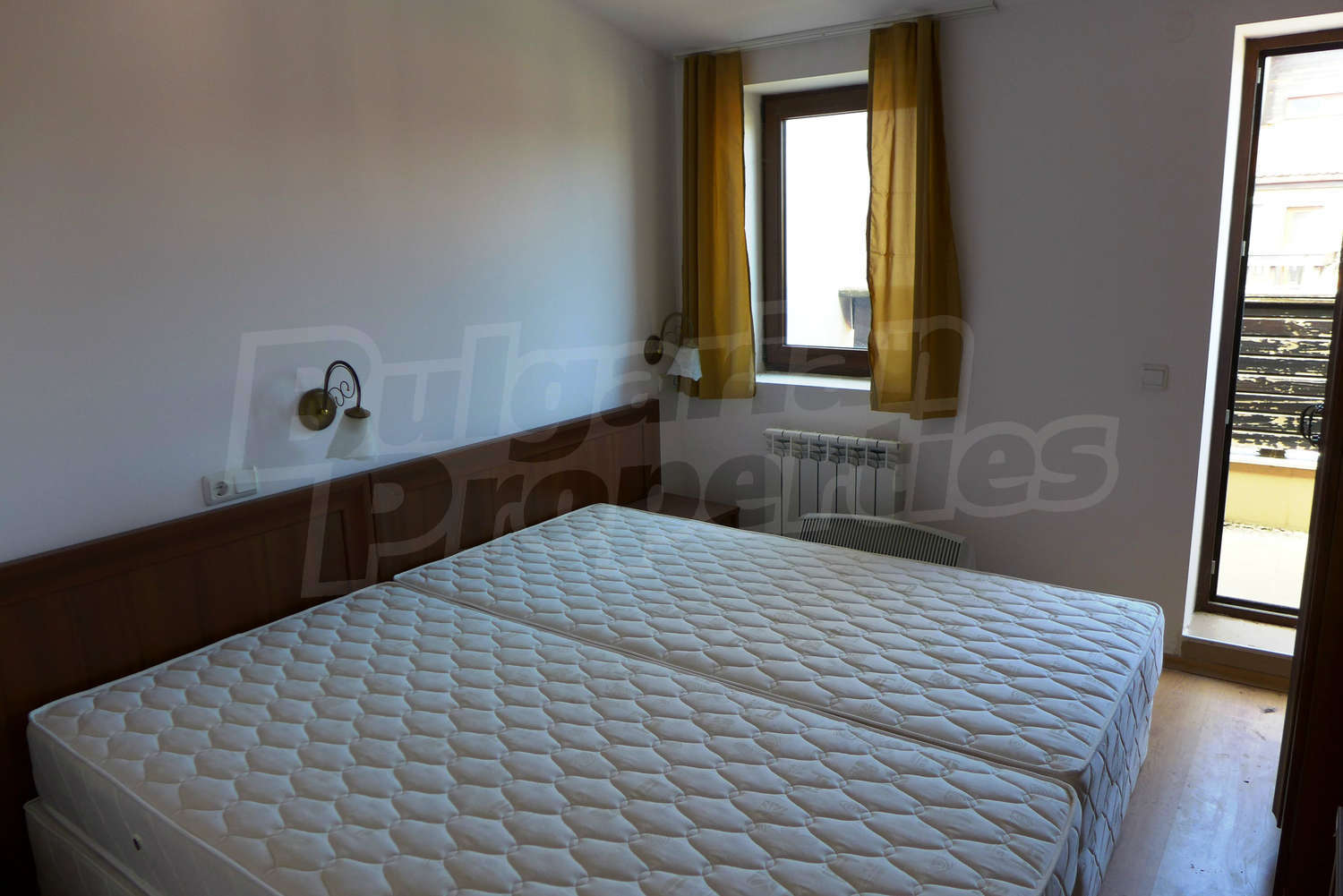 The property was built in 2006, facing west and it is set on the fourth floor. The area of 68 sq.m. is distributed between a living room with kitchenette, a bedroom, a bathroom with WC and a balcony with mountain views. The modern kitchen includes a double hob, an extractor fan, a sink. Living room - a L-Shaped sofa bed, a coffee table, a tv stand, a dining table and 4 chairs, a wardrobe, curtains. Bedroom - a double bed, 2x bedside cabinet, a wardrobe, a dressing table and mirror, curtains. Bathroom with toilet and a bathtub with shower, a sink, a mirror, a water heater. The heating is by electric radiators. The apartment is wired for telephone, cable TV and Internet. The annual maintenance fee is 200 EUR.
