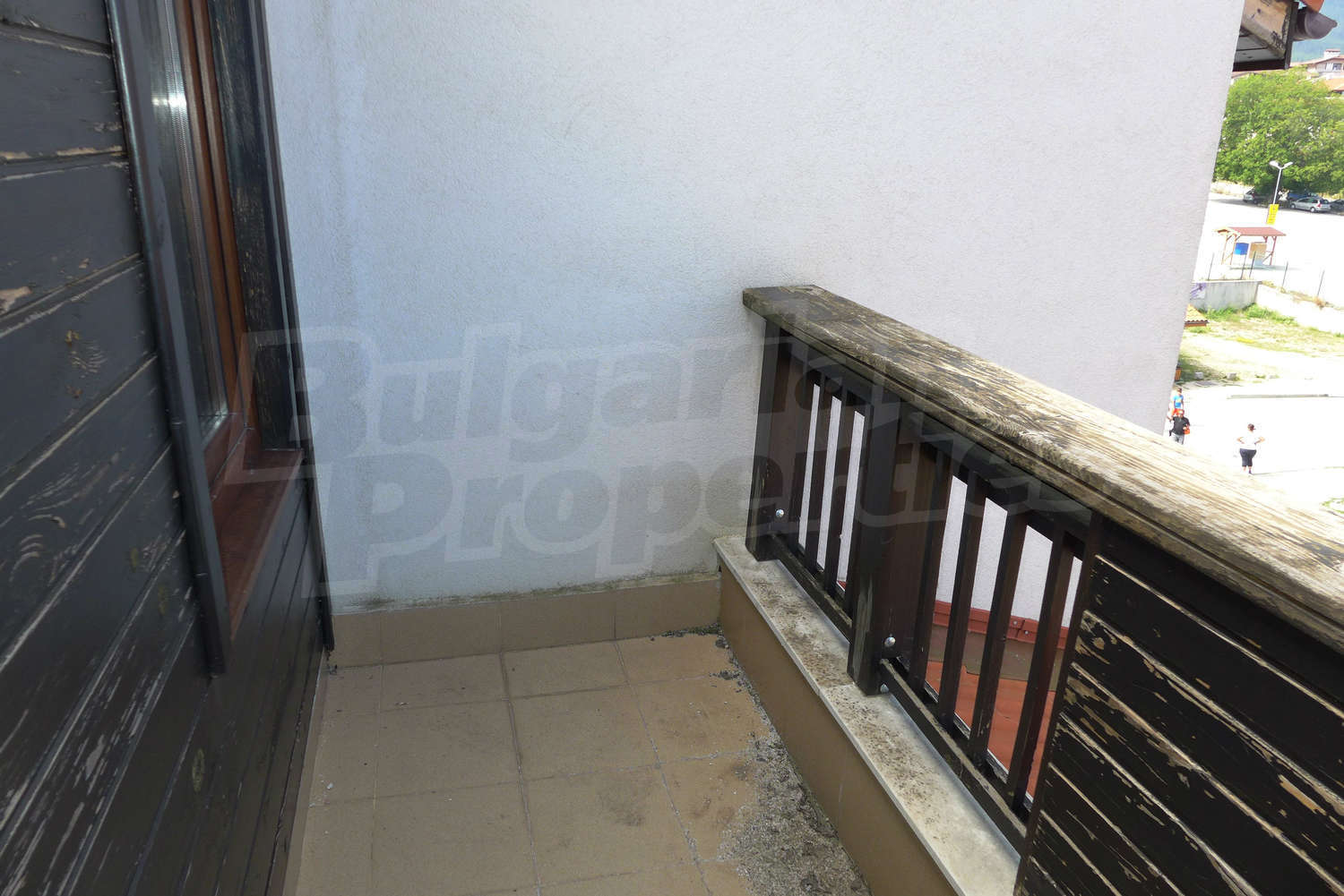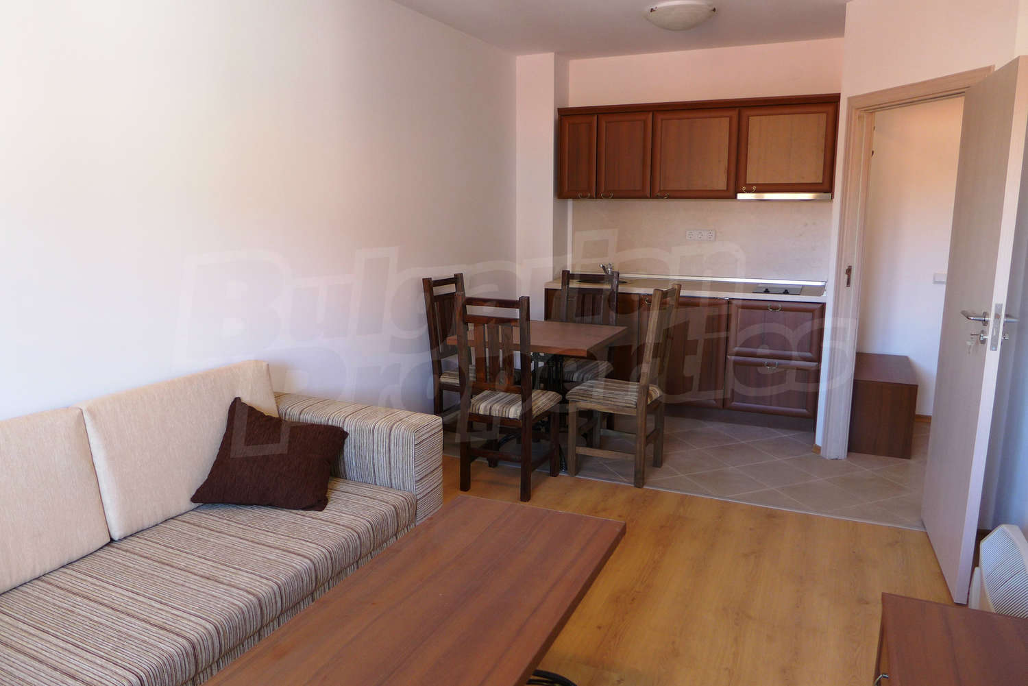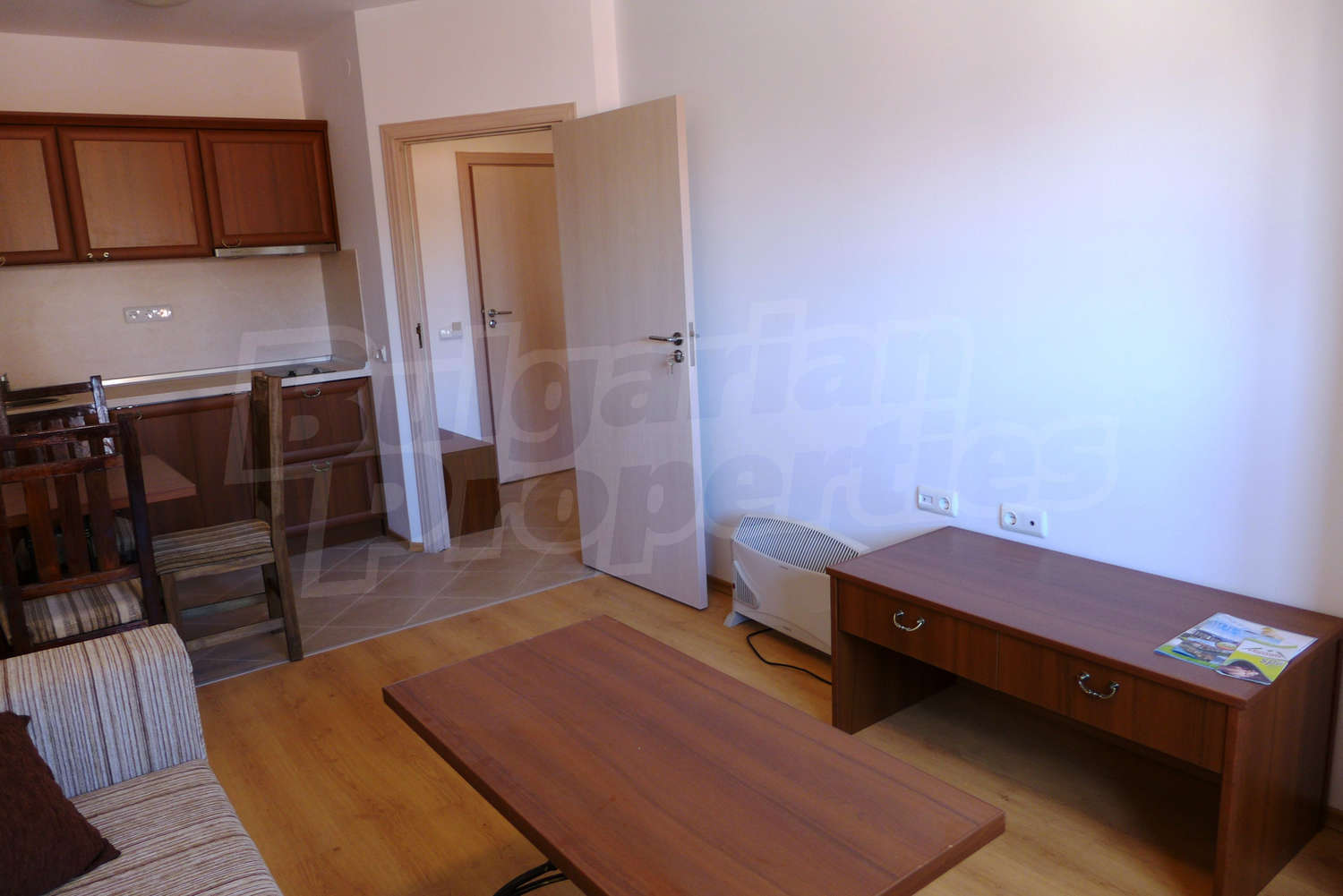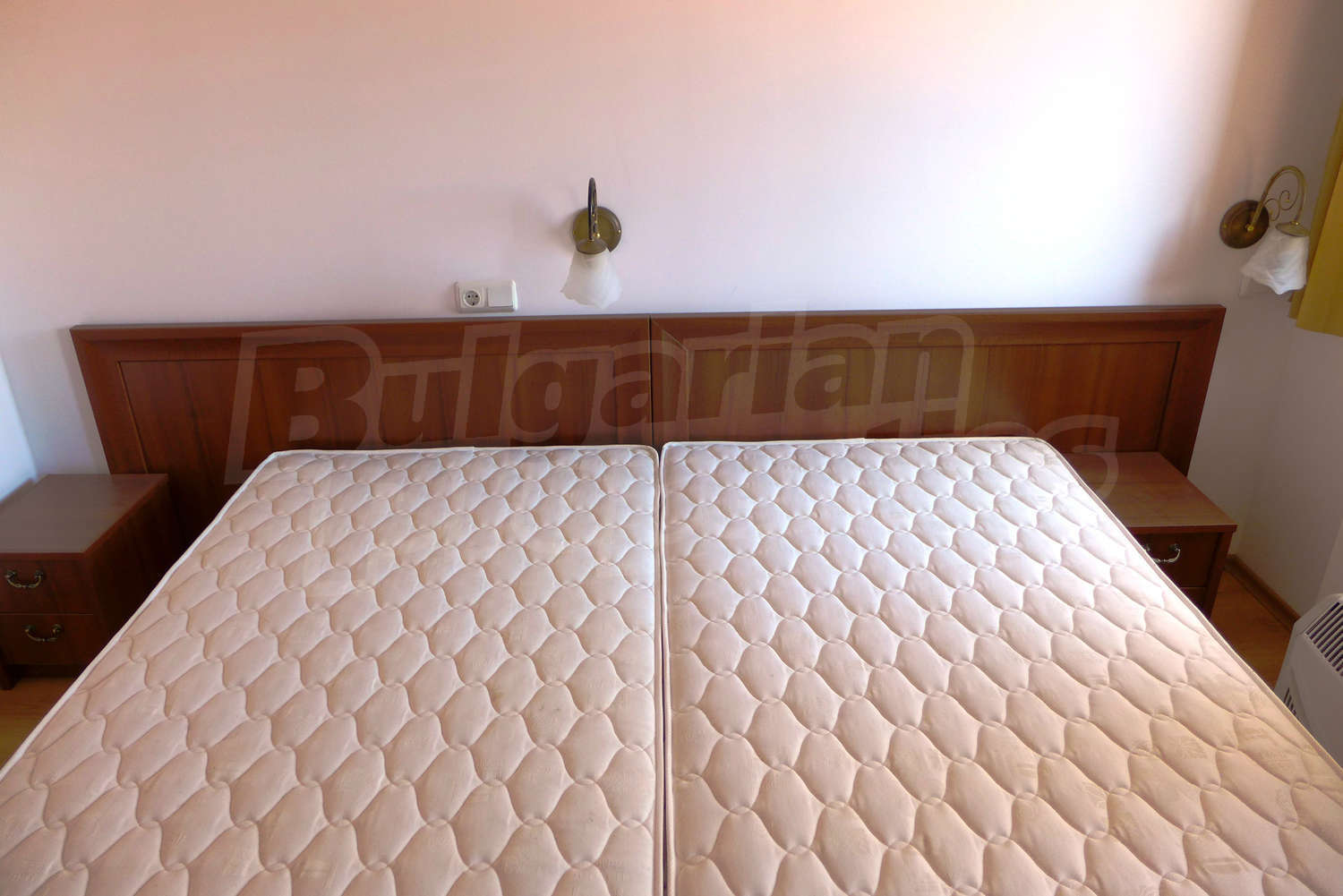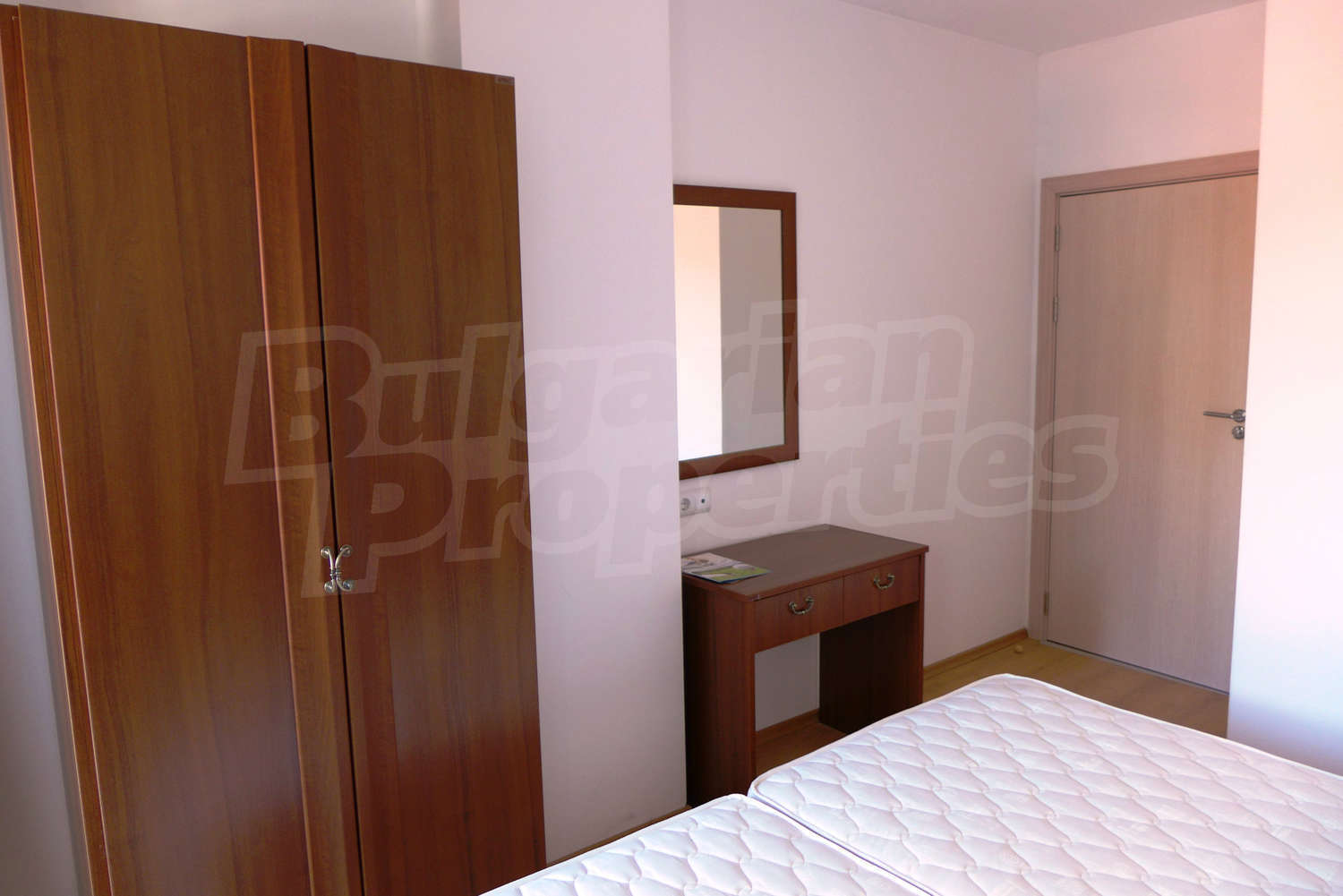 The property was built in 2006, facing west and it is set on the fourth floor. The area of 68 sq.m. is distributed between a living room with kitchenette, a bedroom, a bathroom with WC and a balcony with mountain views. The modern kitchen includes a double hob, an extractor fan, a sink. Living room - a L-Shaped sofa bed, a coffee table, a tv stand, a dining table and 4 chairs, a wardrobe, curtains. Bedroom - a double bed, 2x bedside cabinet, a wardrobe, a dressing table and mirror, curtains. Bathroom with toilet and a bathtub with shower, a sink, a mirror, a water heater. The heating is by electric radiators. The apartment is wired for telephone, cable TV and Internet. The annual maintenance fee is 200 EUR.