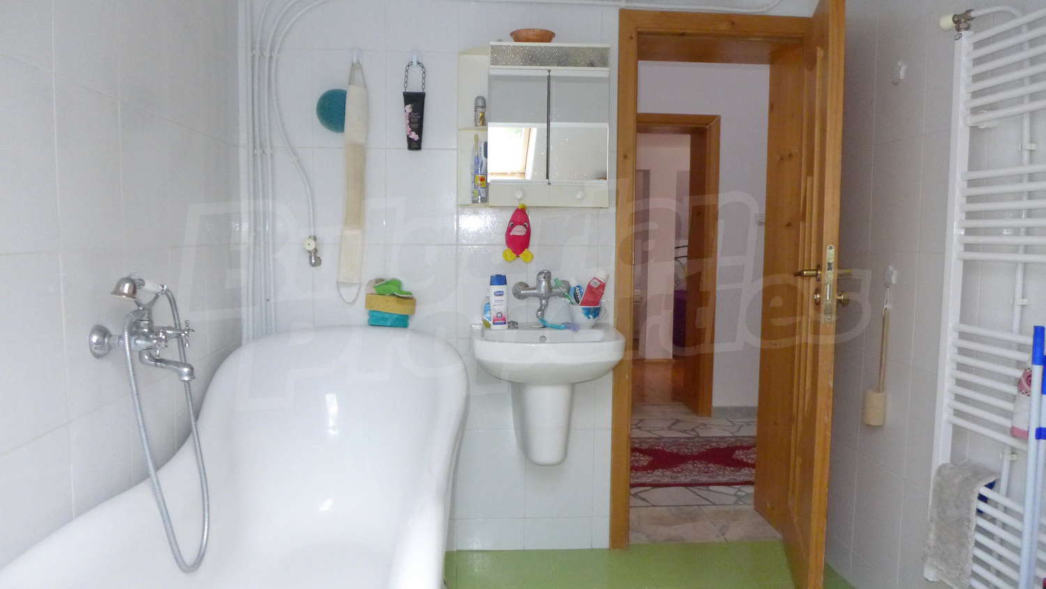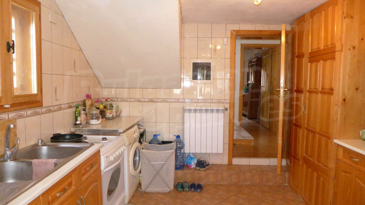 Ground floor: The living area here is distributed between a veranda, two corridors, a living room with a fireplace, a kitchen, a sitting room with a fireplace, a toilet and a bathroom. There is a central heating in the property - through a caldron, which is connected with radiators in all the rooms. There are also solar panels on the roof for heating of the water. The walls are latex painted, the flooring is with natural parquet, except the kitchen /terracotta tiles/ and the windows wooden frames contains triple glazing. There is a floor heating in the kitchen.