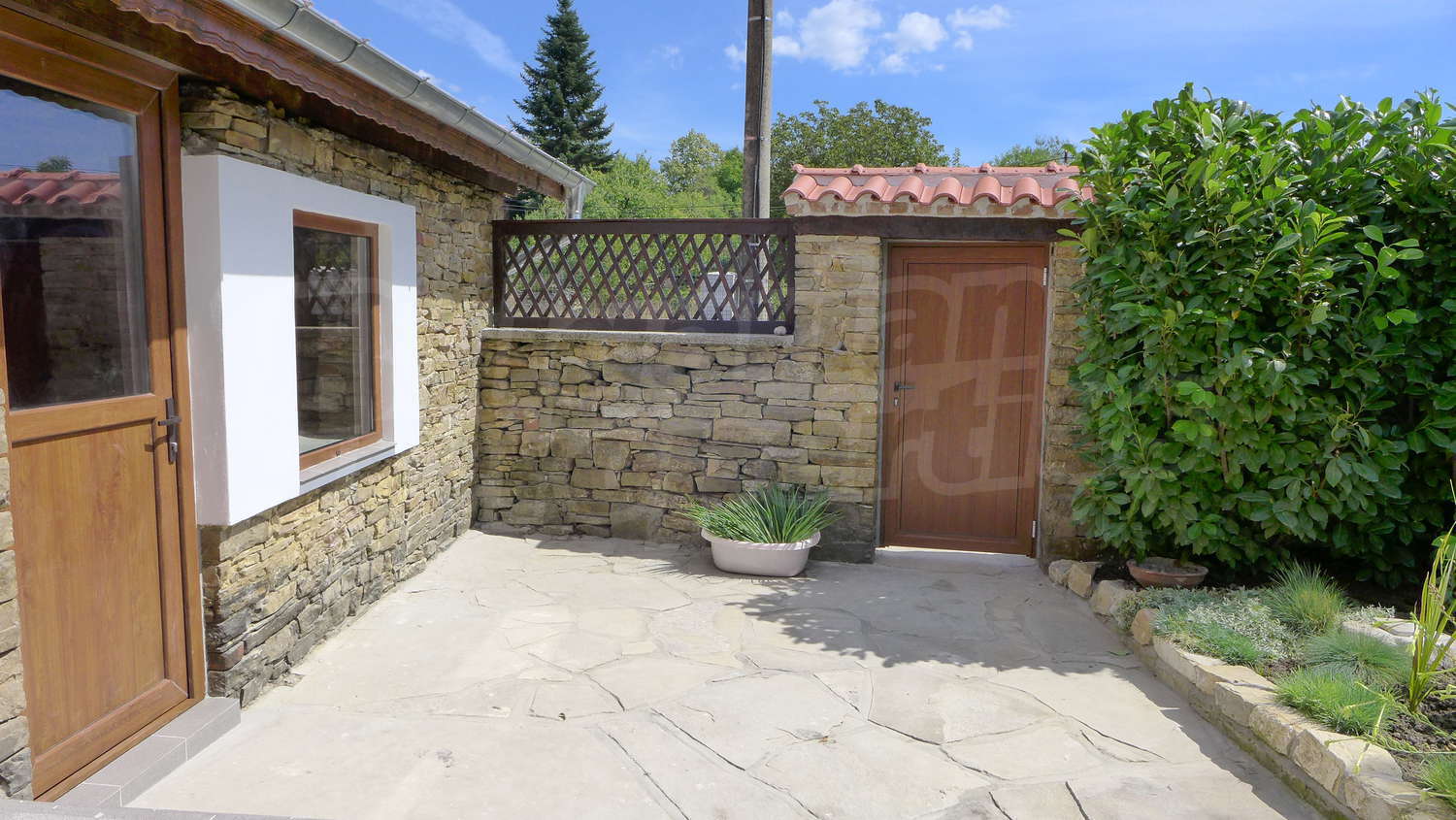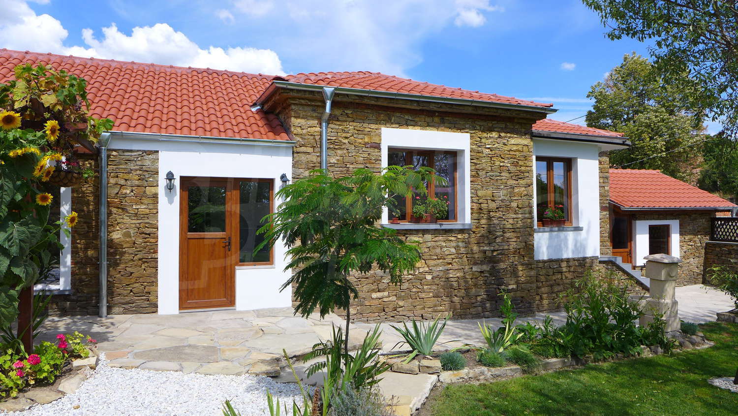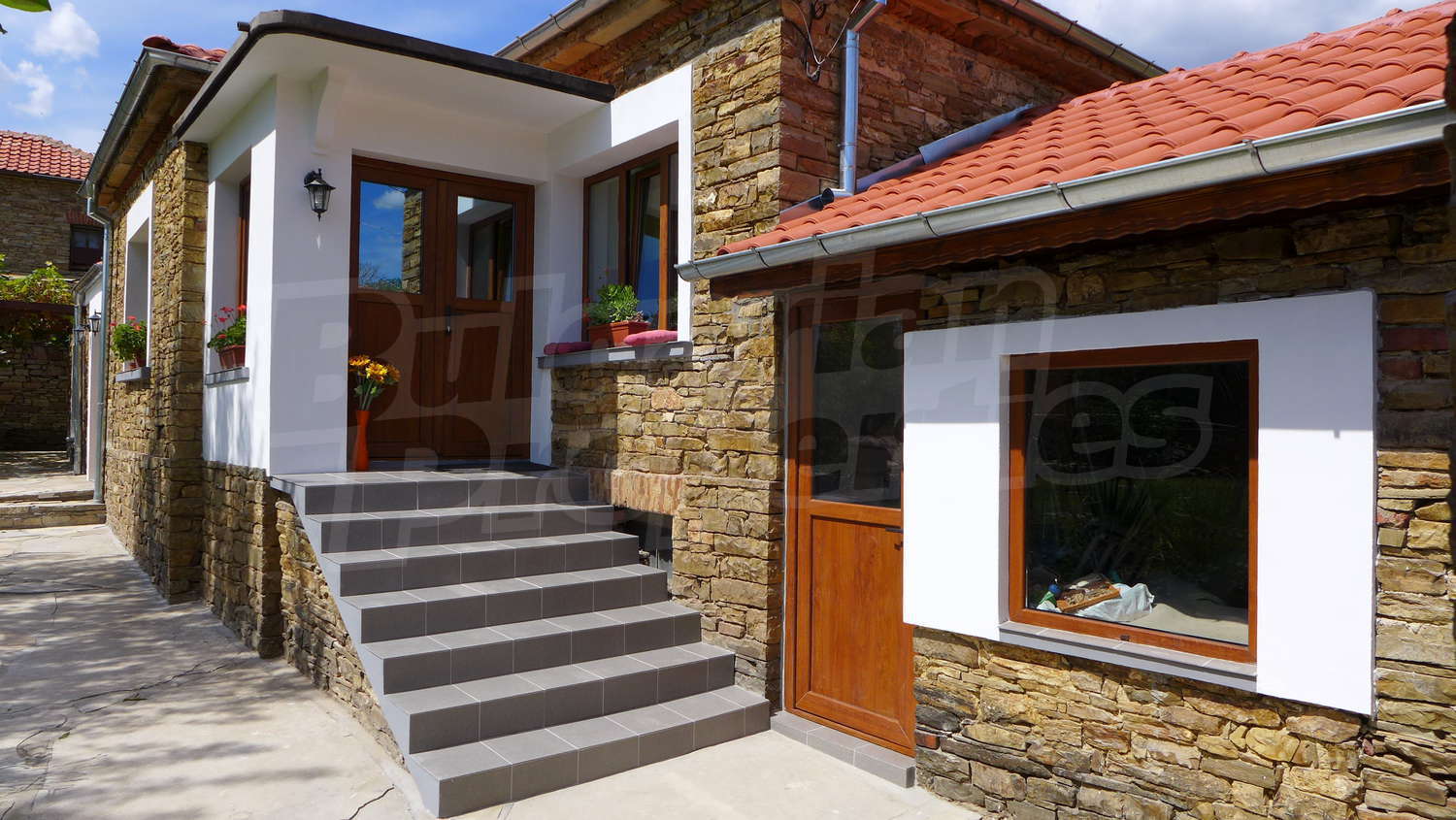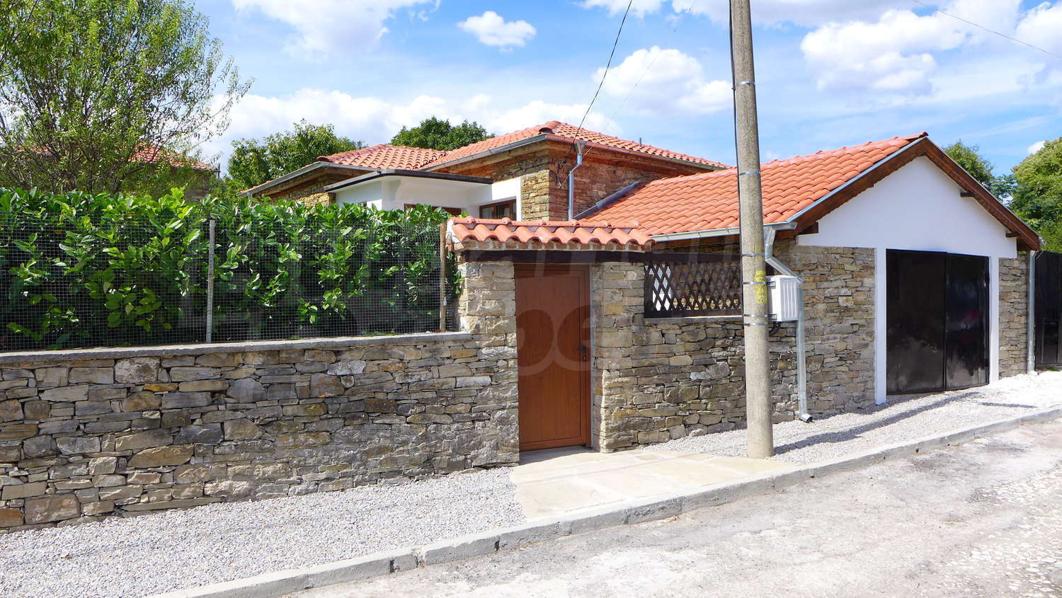 The property consists of one storied house with area 80 sq. m, a garden 580 sq. m and a garage. The living area is distributed between an entrance, a corridor, a living room, a kitchen, 2 bedrooms and 2 WC/bathrooms. The floorings are finished with laminate parquet and terracotta tiles, and the windows have PVC frames. The house itself is built from bricks and stones.