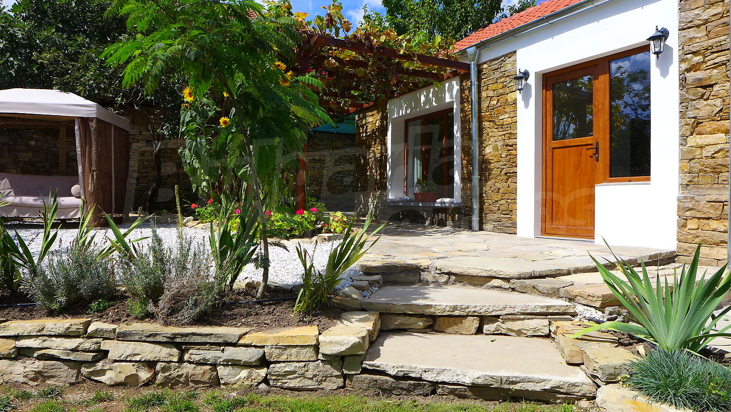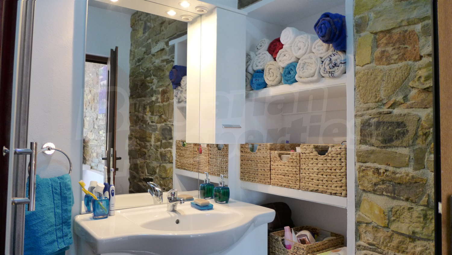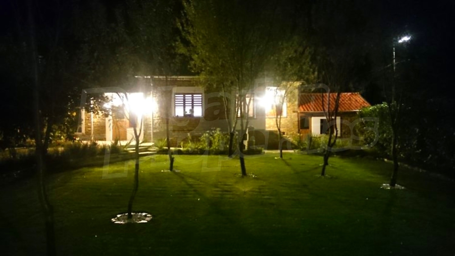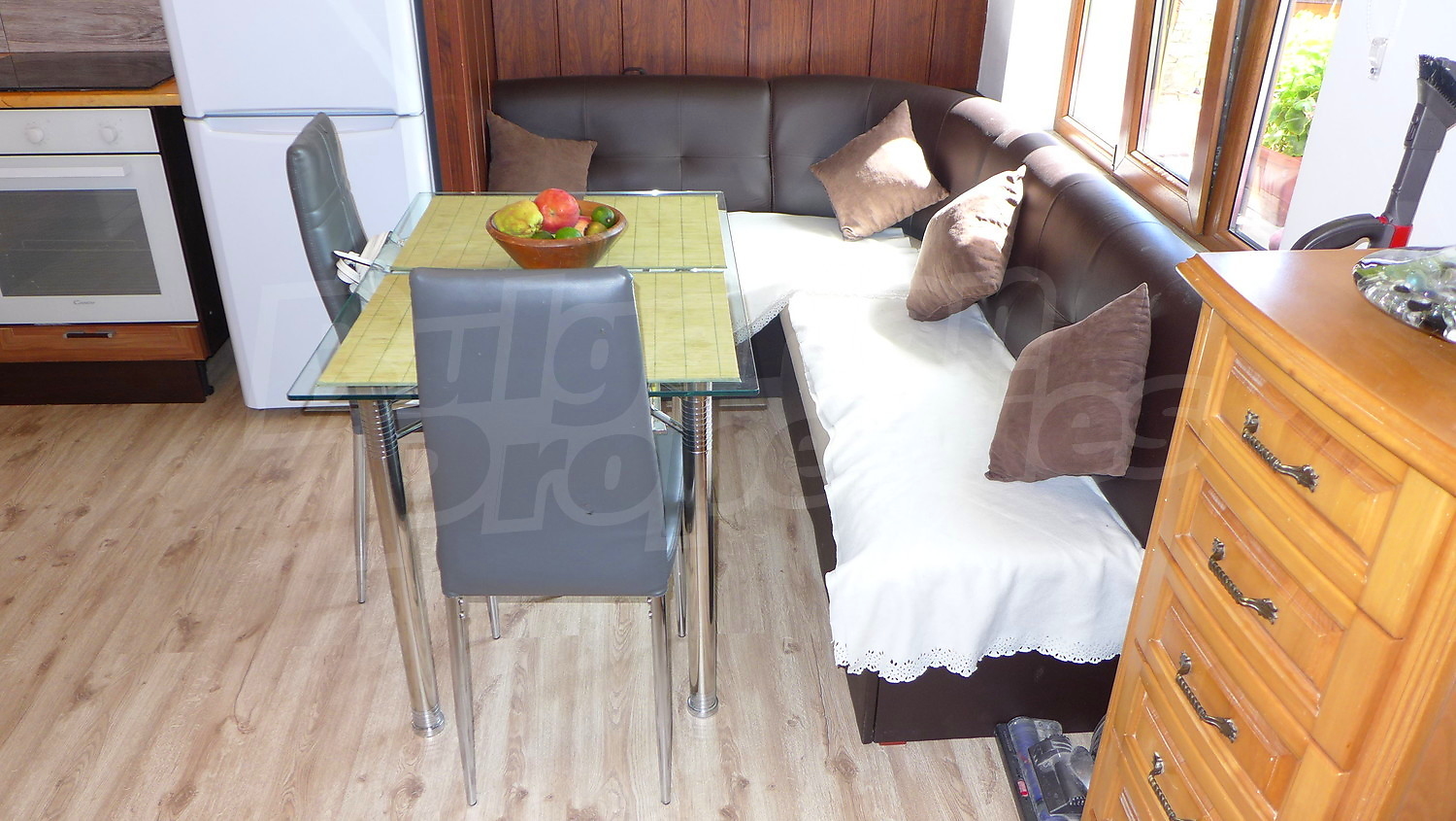 The property consists of one storied house with area 80 sq. m, a garden 580 sq. m and a garage. The living area is distributed between an entrance, a corridor, a living room, a kitchen, 2 bedrooms and 2 WC/bathrooms. The floorings are finished with laminate parquet and terracotta tiles, and the windows have PVC frames. The house itself is built from bricks and stones.