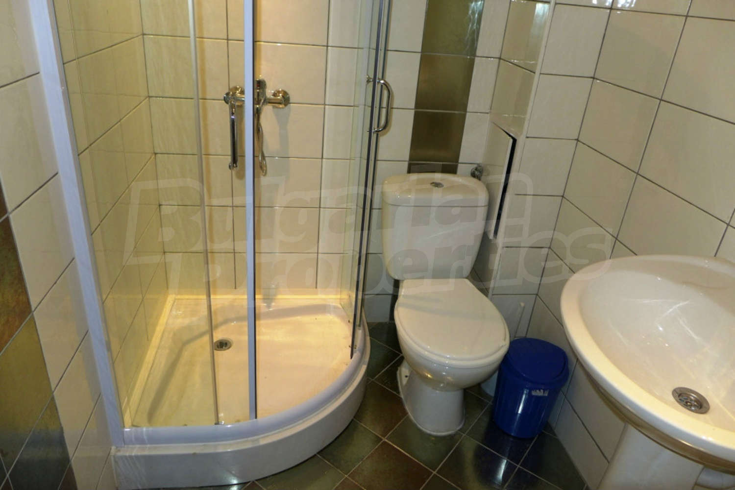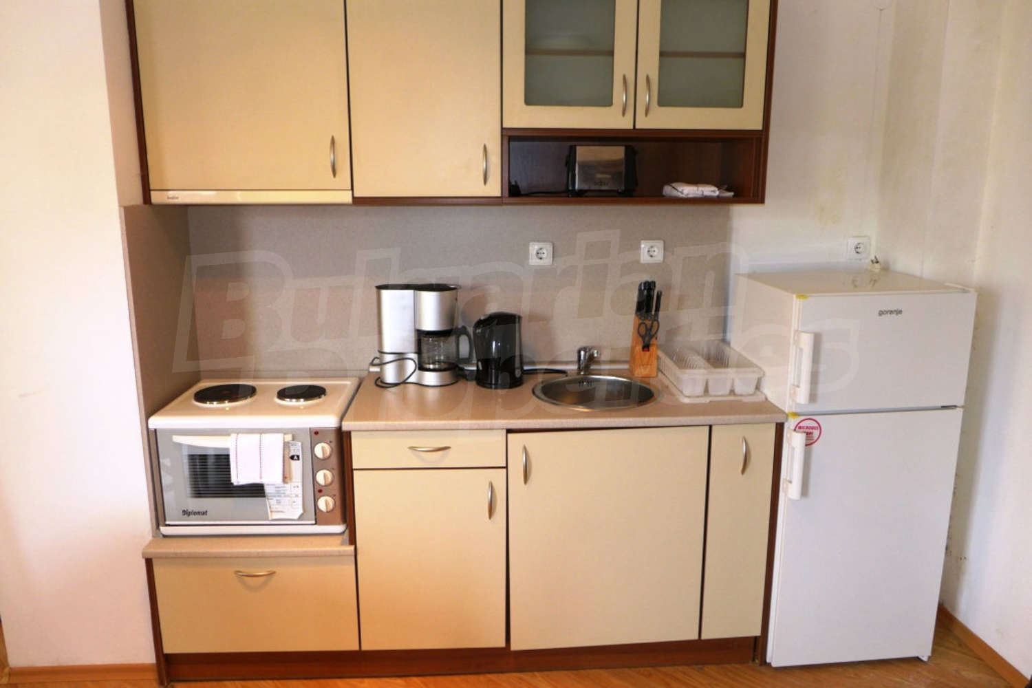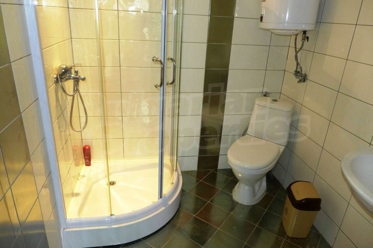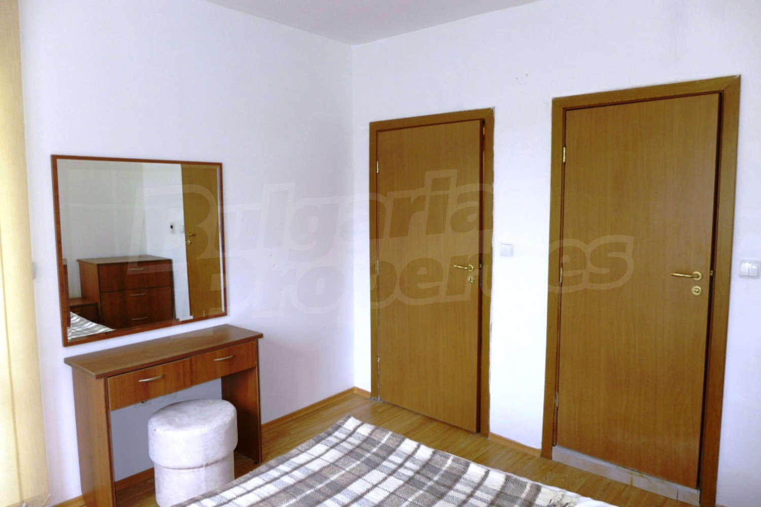 The apartment is located on the ground floor in a quiet residential complex (2006). It is facing west and has a total area - 75.63 sq.m. (net area - 57.31 sq.m.). The flat consists of a living room with kitchenette (a hob, an extractor fan, a sink, a fridge, a kettle, a toaster); a bedroom; two bathrooms with toilet and shower box and a balcony. The furniture includes 2x single beds, a double wardrobe, a double sofa-bed, 2x stools, Tv, Tv Stand, a dining table, 2 dining chairs, blinds. The heating is with electric radiators. The property is equipped with telephone, cable TV, internet. The annual maintenance fee is 8 euros / sq.m. The complex has fitness and Wi-fi internet.