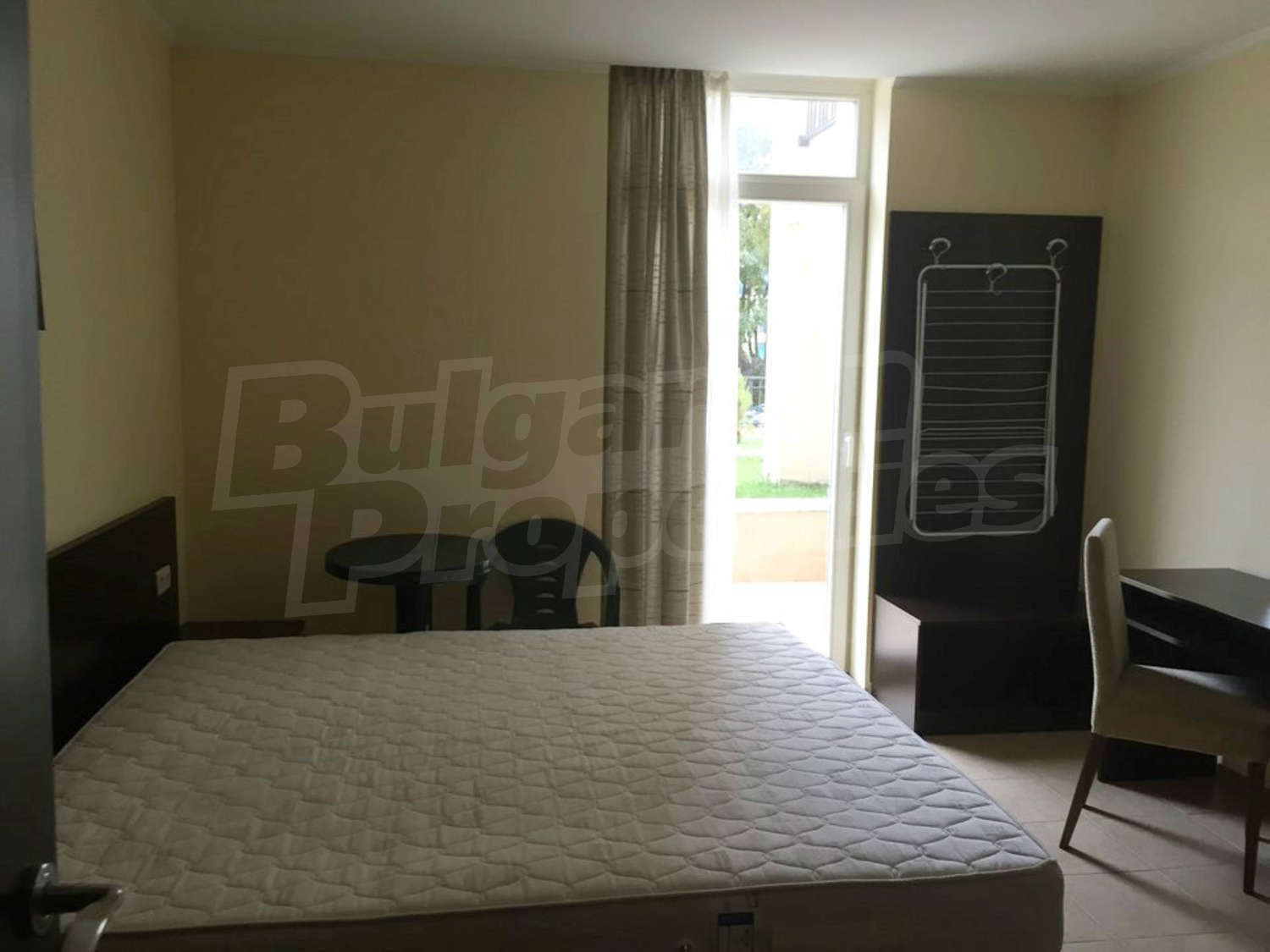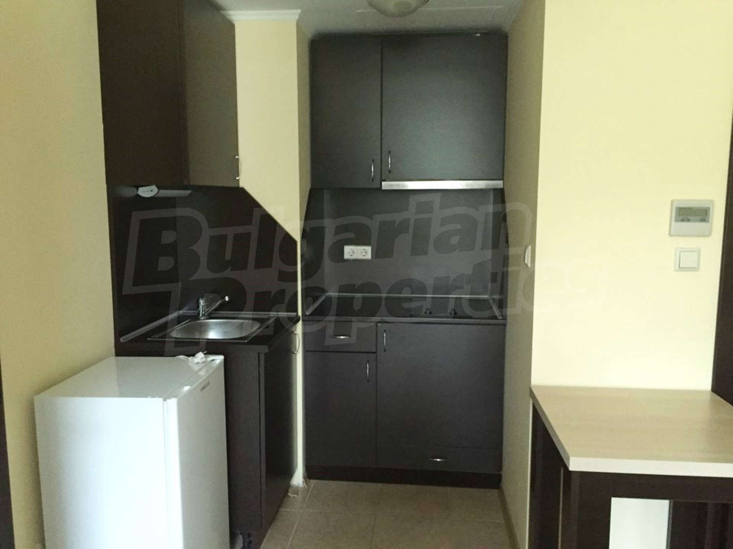 The studio consists of a single room with dining area and kitchen, bedroom and bathroom with toilet and a shower. The equipment of the apartment includes electric hob, extractor fan, refrigerator, table, double bed, wardrobe, desk, bedside tables. The apartment is fully furnished and ready for direct move in or for rent. Located on the ground floor. The annual fee for maintenance of the complex is 16 Euro per sq.m.