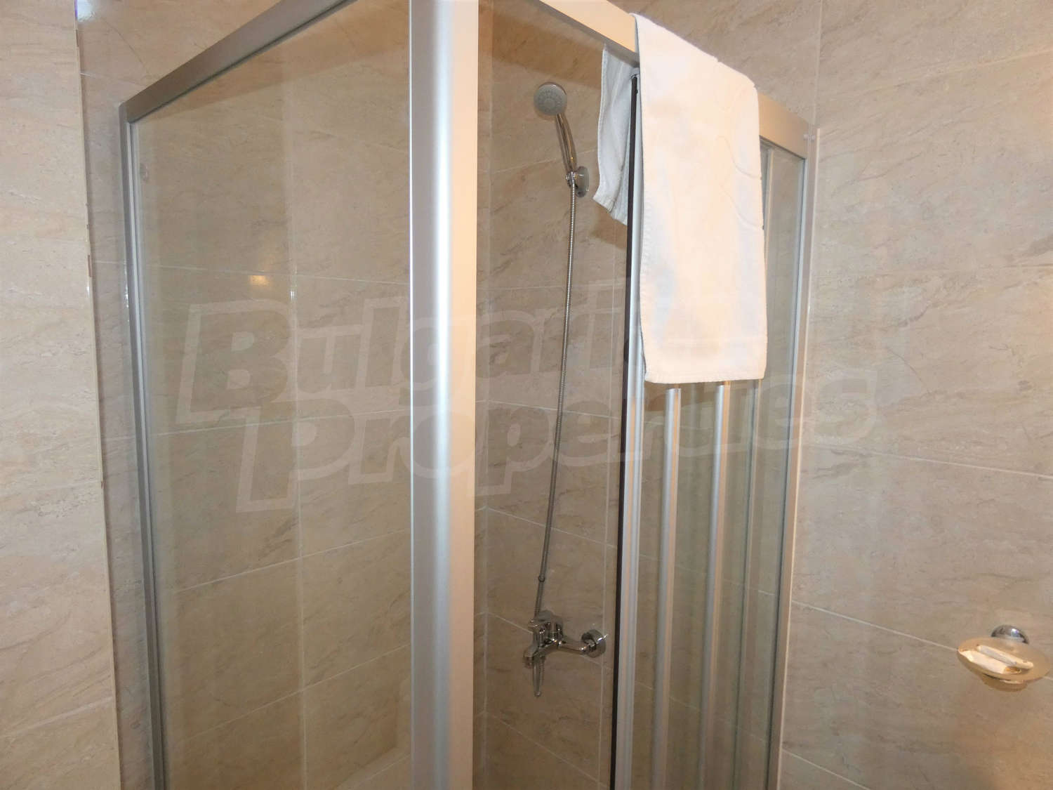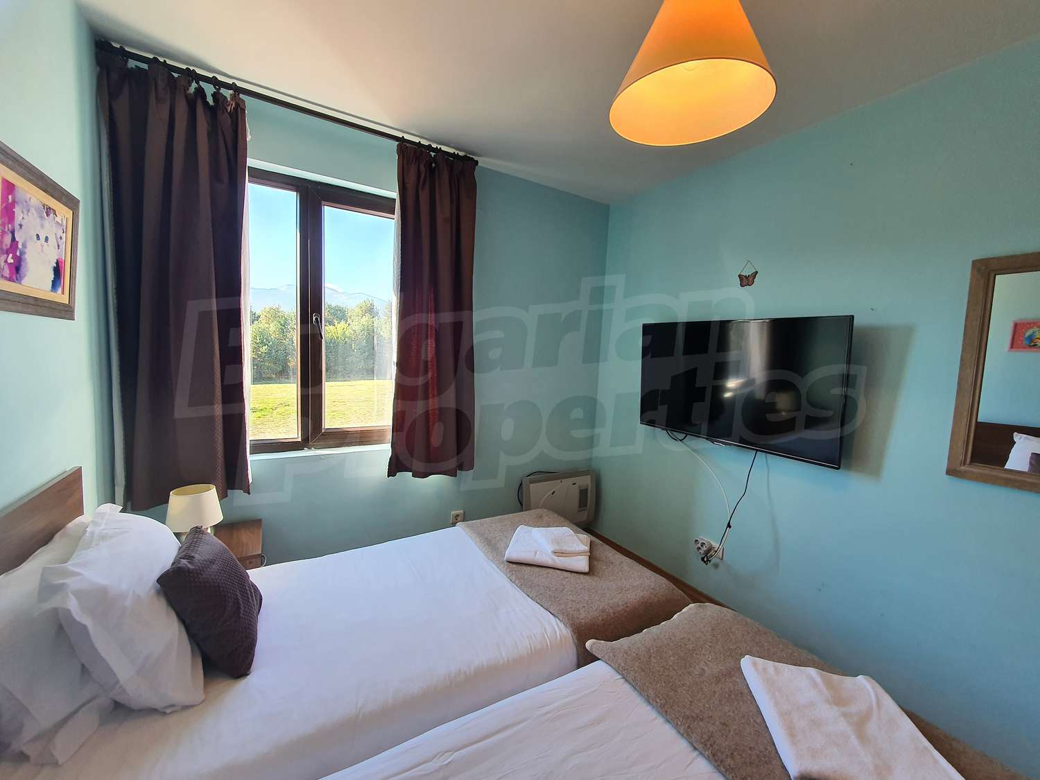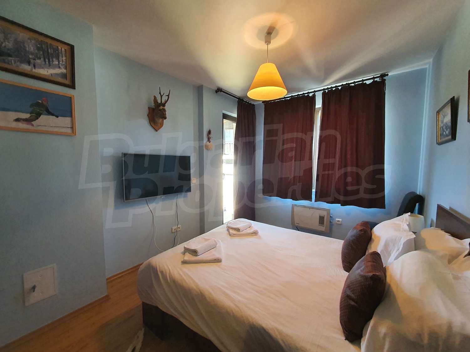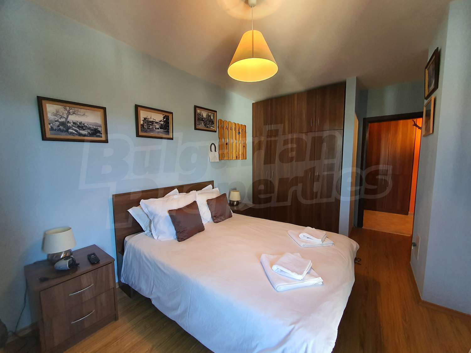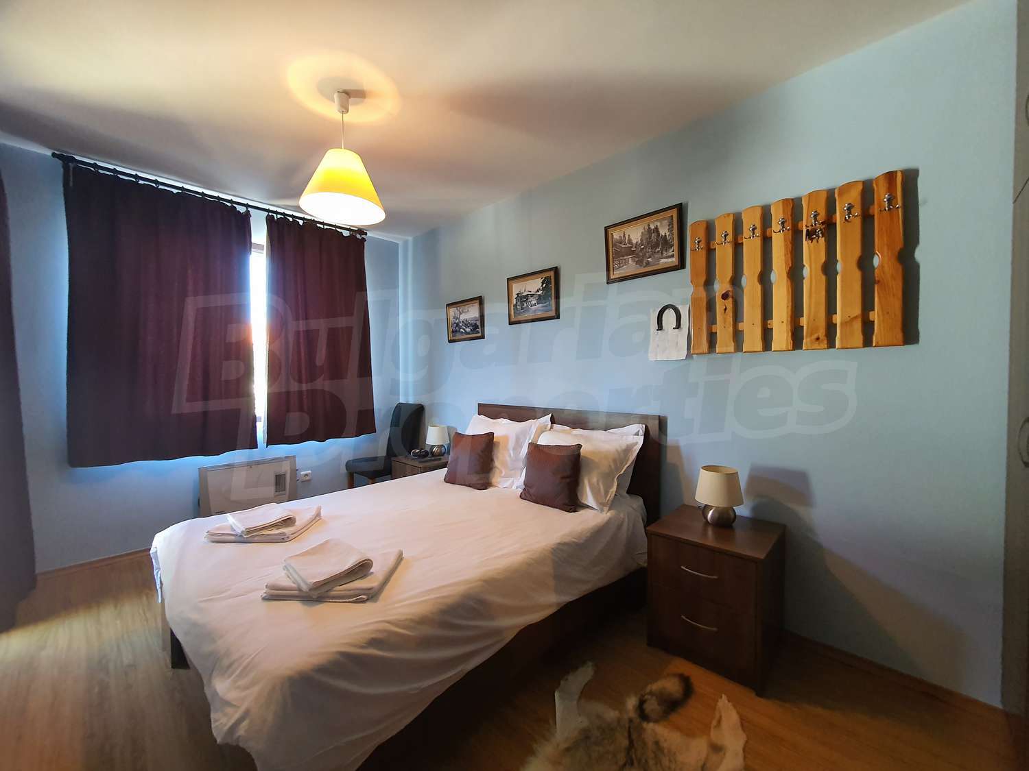The flat is set on the third floor, with an area of 94.18 sq.m., facing south / west. The rooms have laminate floors, painted walls, windows - PVC. The kitchen is equipped with a ceramic hob, a sink, cabinets, hot plates, a toaster, a kettle, a fridge, a table with five chairs, a microwave; living room - with a sofa, a TV set, a DVD, a coffee table, a fireplace; bedroom 1 - a double bed, two bedside tables, a wardrobe, a TV set; bedroom 2 - a double bed, two bedside tables, a wardrobe, a TV set; bathroom with WC 1 - a bathtub, a washbasin with а mirror; bathroom with WC 2 - a shower box, a washbasin with a mirror. There are two balconies with beautiful views of the surrounding forests and mountains. The heating in the apartment is via electric convectors and a fireplace. The dwelling is wired for internet and cable TV. The complex has an elevator and a porter.