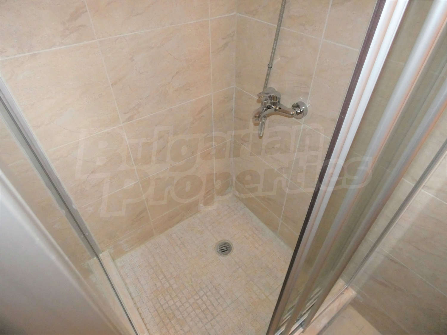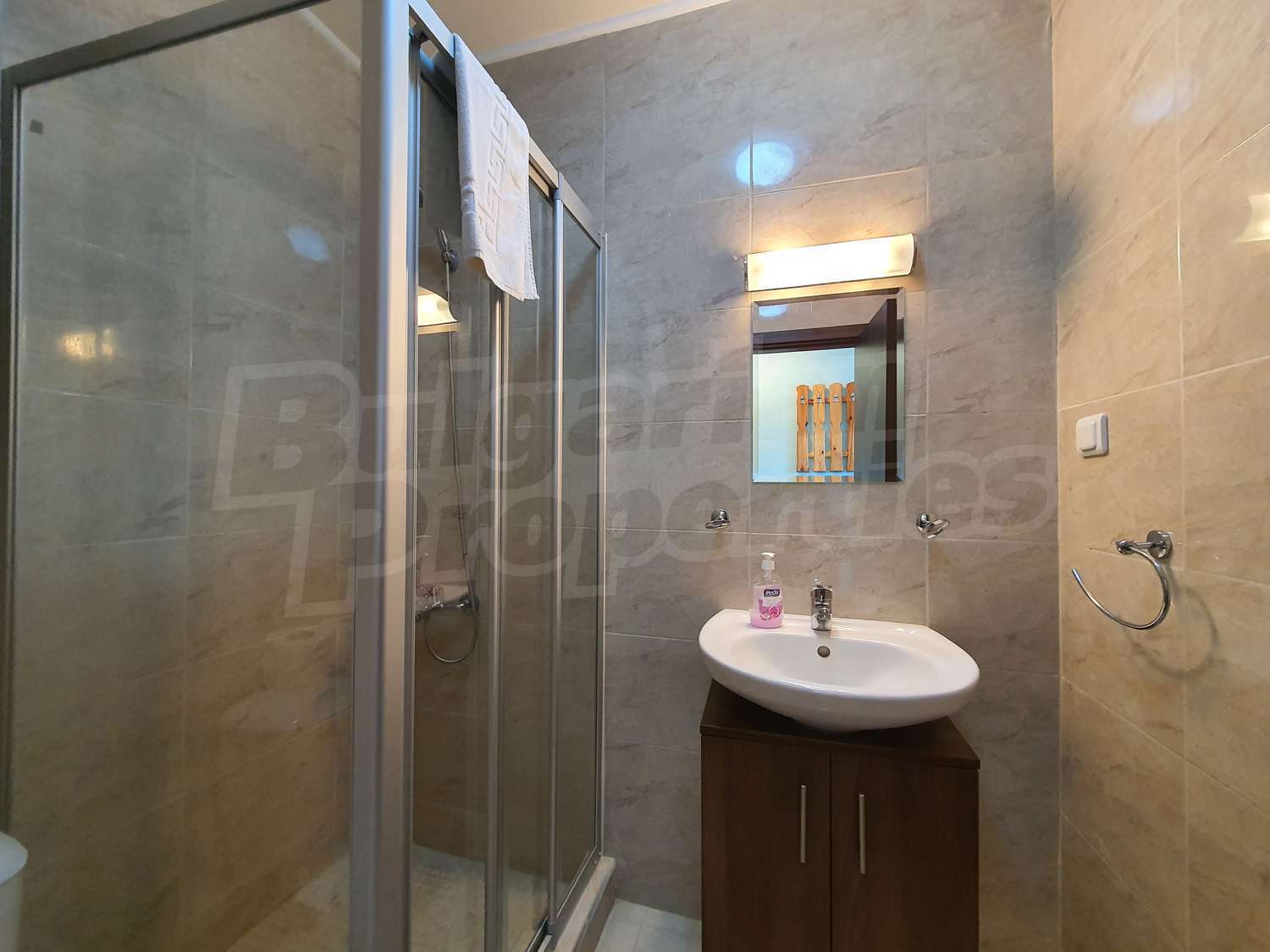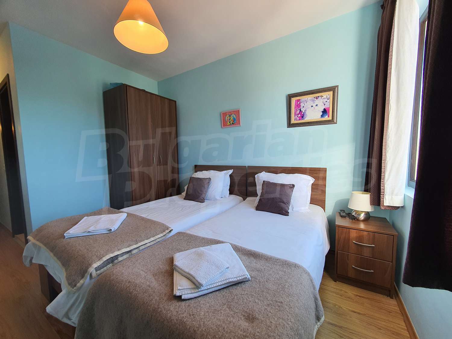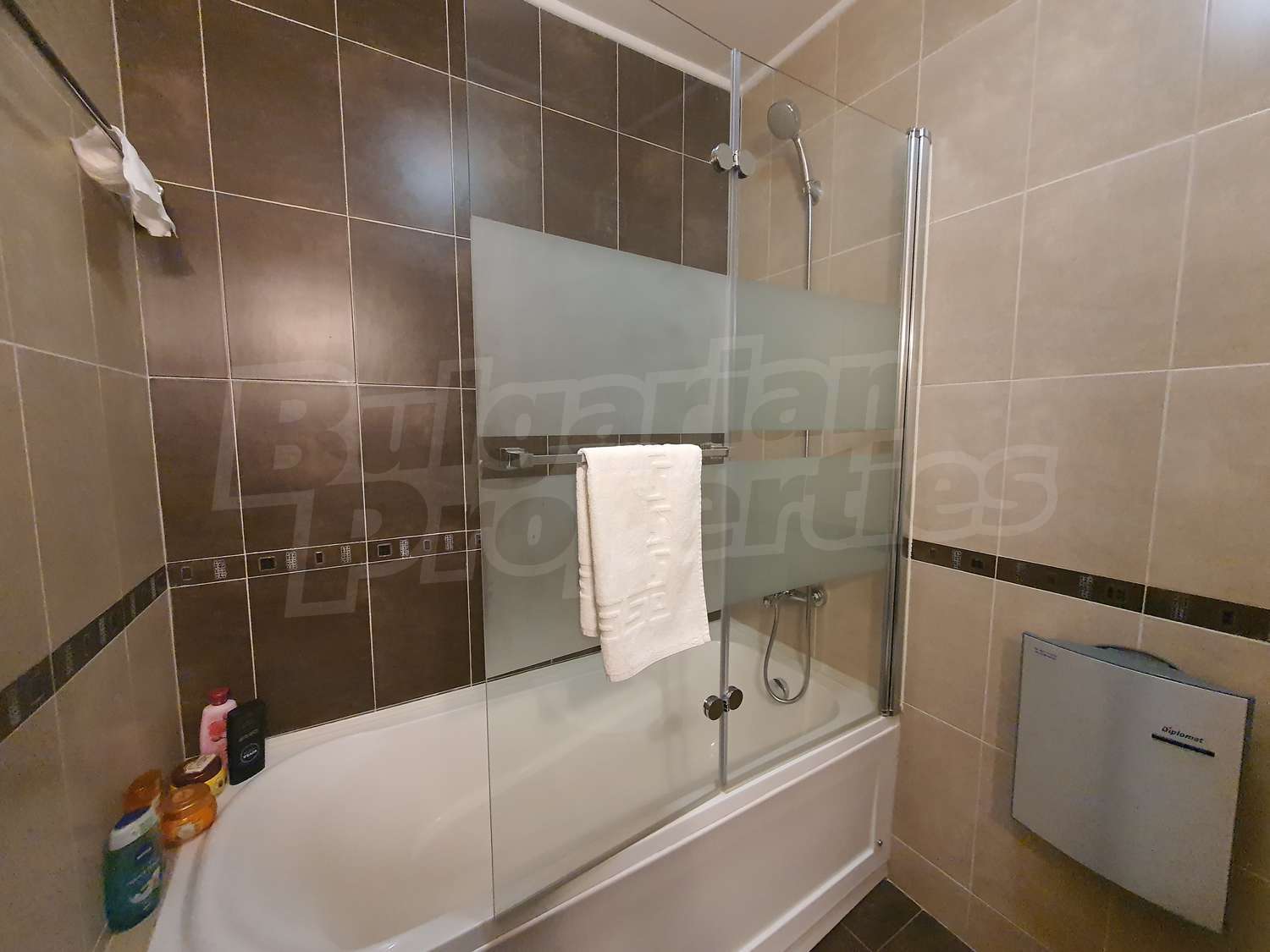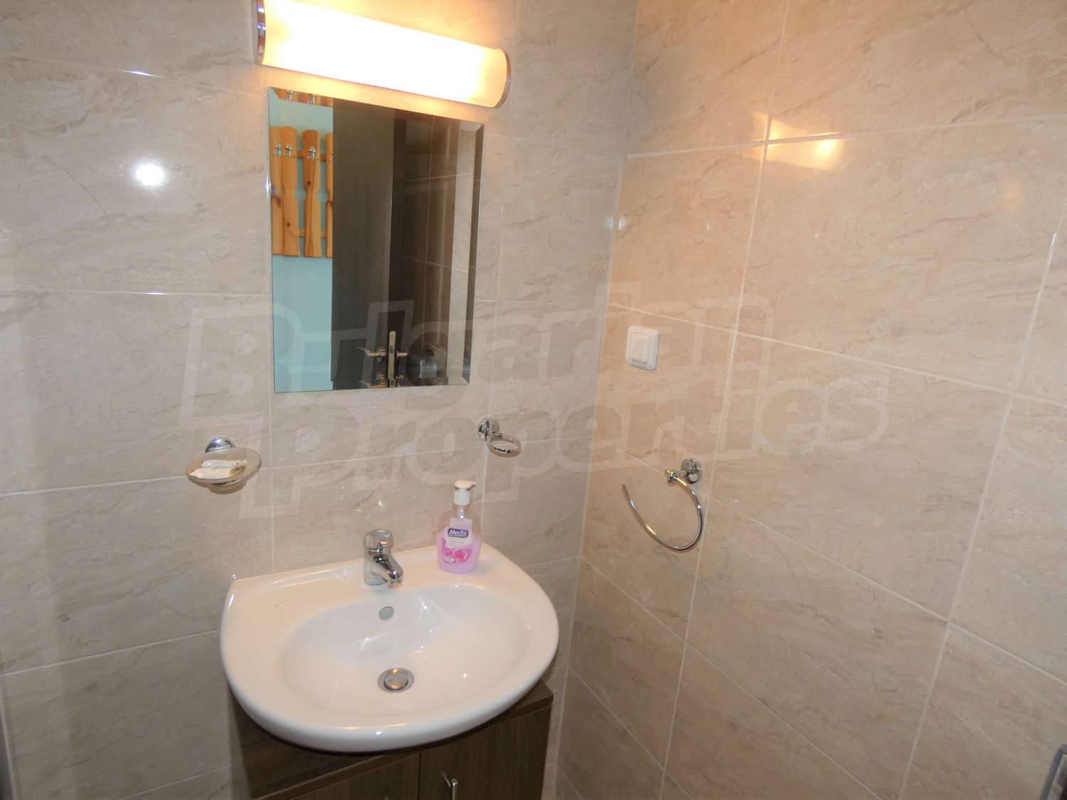 The flat is set on the third floor, with an area of 94.18 sq.m., facing south / west. The rooms have laminate floors, painted walls, windows - PVC. The kitchen is equipped with a ceramic hob, a sink, cabinets, hot plates, a toaster, a kettle, a fridge, a table with five chairs, a microwave; living room - with a sofa, a TV set, a DVD, a coffee table, a fireplace; bedroom 1 - a double bed, two bedside tables, a wardrobe, a TV set; bedroom 2 - a double bed, two bedside tables, a wardrobe, a TV set; bathroom with WC 1 - a bathtub, a washbasin with а mirror; bathroom with WC 2 - a shower box, a washbasin with a mirror. There are two balconies with beautiful views of the surrounding forests and mountains. The heating in the apartment is via electric convectors and a fireplace. The dwelling is wired for internet and cable TV. The complex has an elevator and a porter.