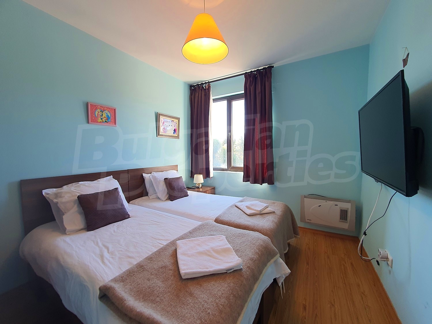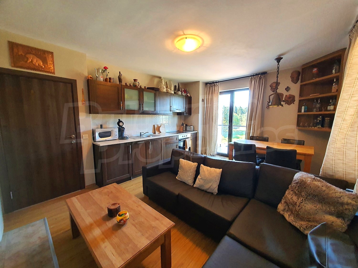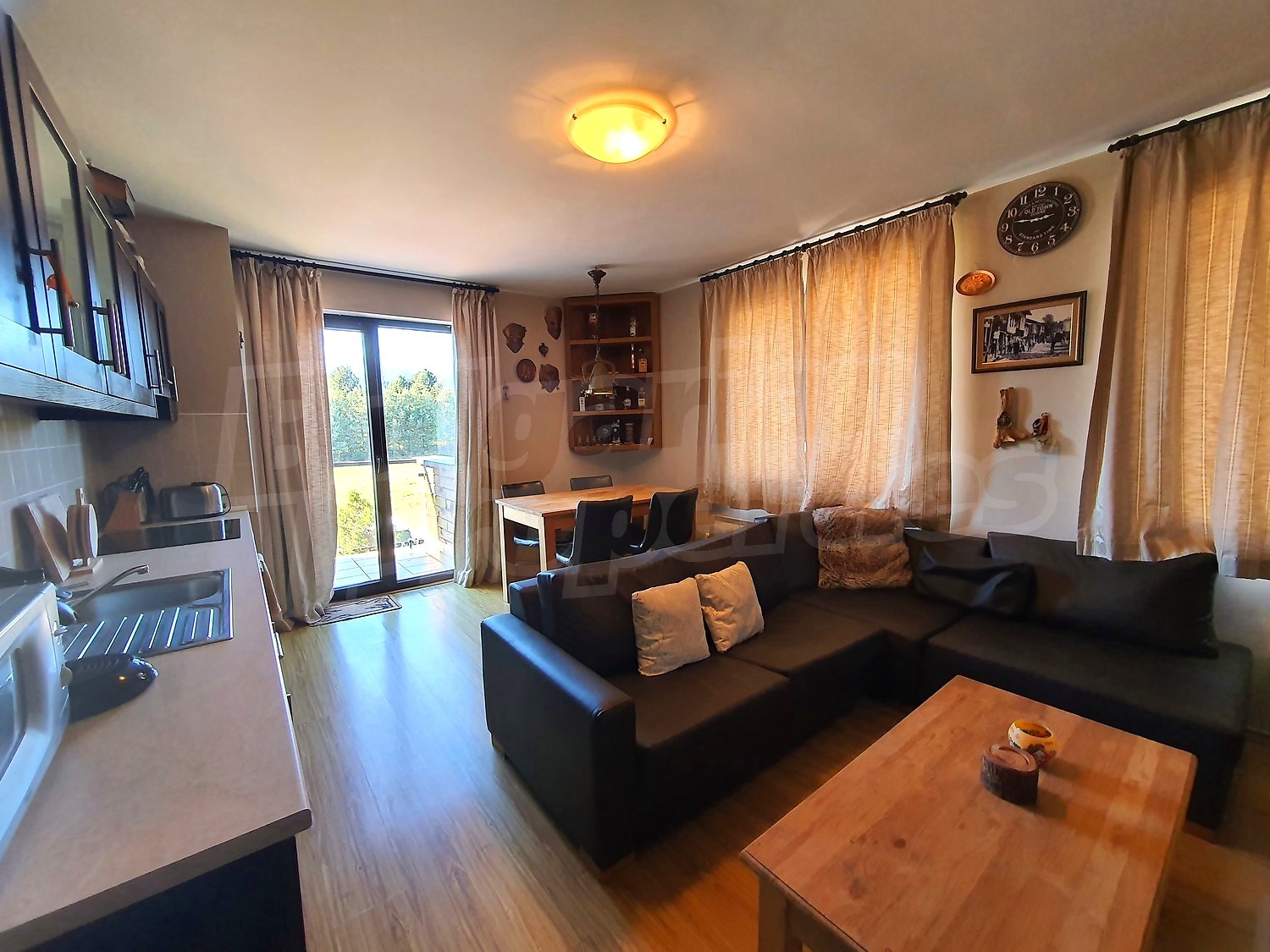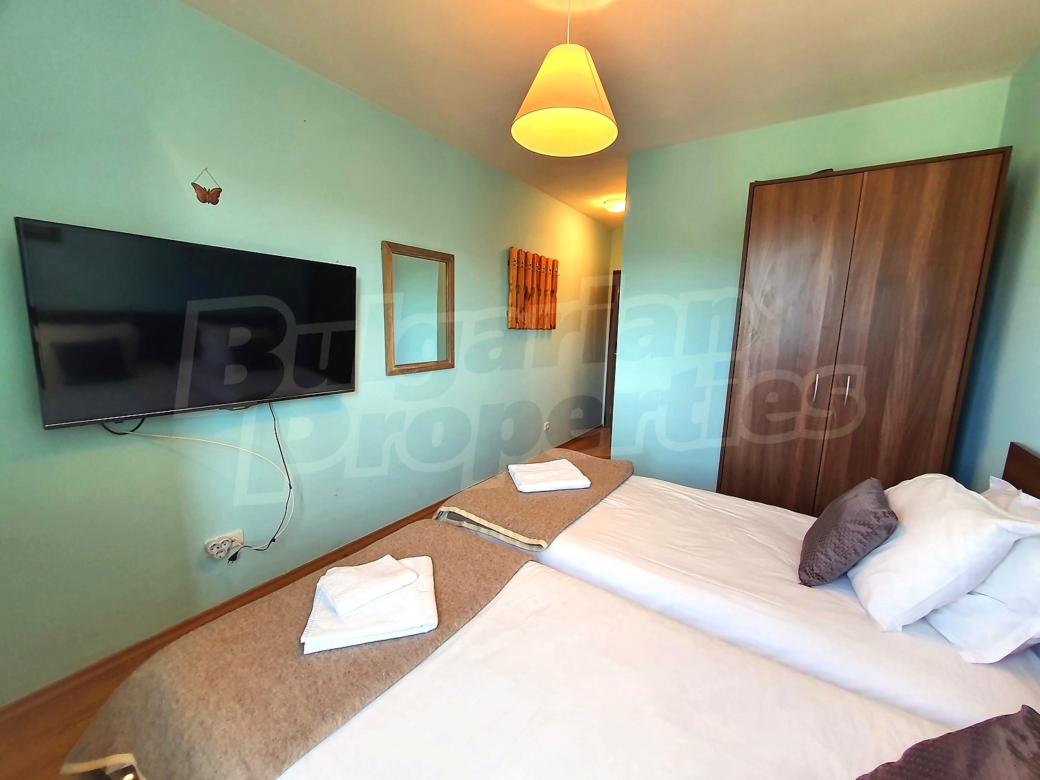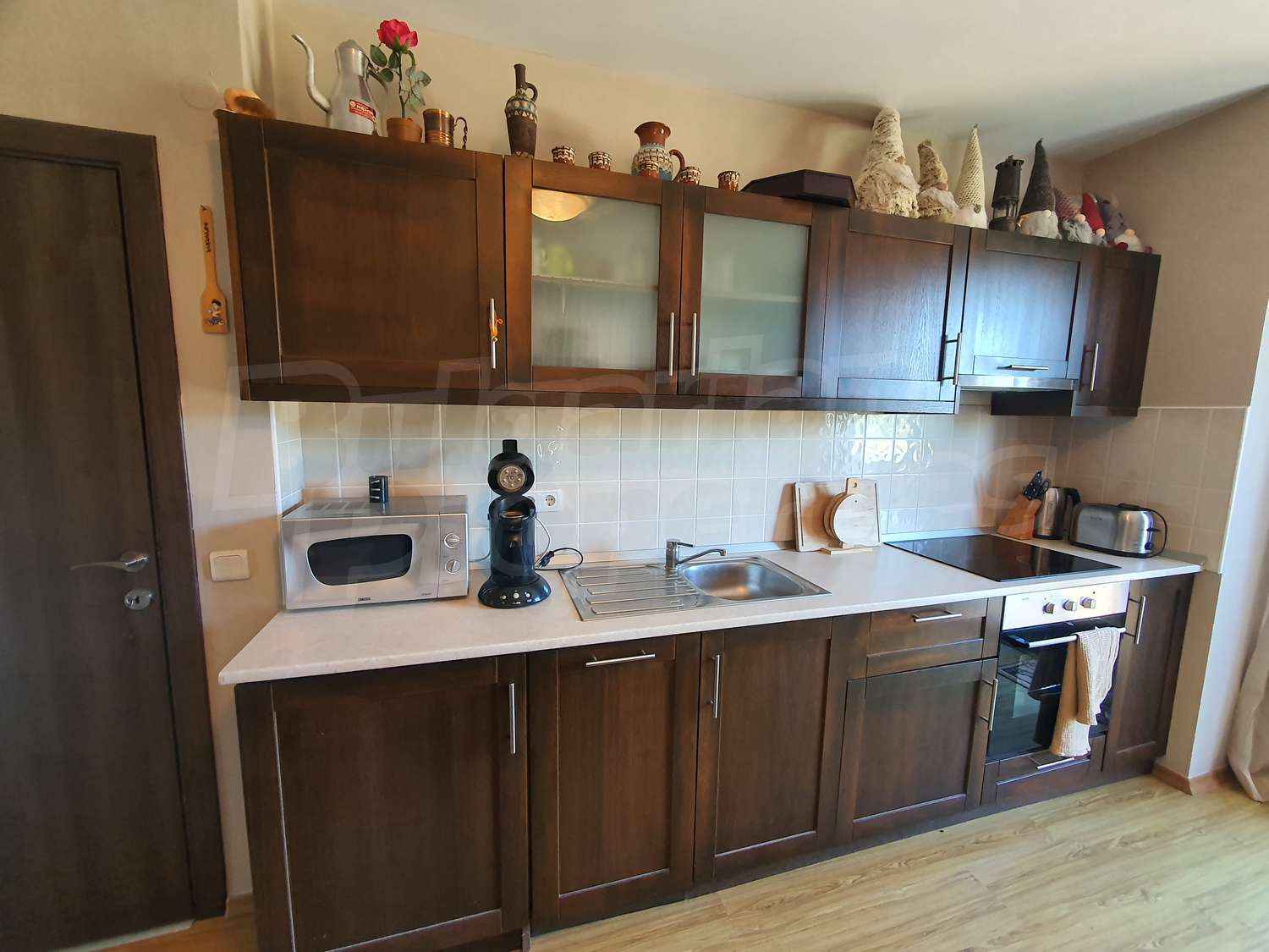 The flat is set on the third floor, with an area of 94.18 sq.m., facing south / west. The rooms have laminate floors, painted walls, windows - PVC. The kitchen is equipped with a ceramic hob, a sink, cabinets, hot plates, a toaster, a kettle, a fridge, a table with five chairs, a microwave; living room - with a sofa, a TV set, a DVD, a coffee table, a fireplace; bedroom 1 - a double bed, two bedside tables, a wardrobe, a TV set; bedroom 2 - a double bed, two bedside tables, a wardrobe, a TV set; bathroom with WC 1 - a bathtub, a washbasin with а mirror; bathroom with WC 2 - a shower box, a washbasin with a mirror. There are two balconies with beautiful views of the surrounding forests and mountains. The heating in the apartment is via electric convectors and a fireplace. The dwelling is wired for internet and cable TV. The complex has an elevator and a porter.