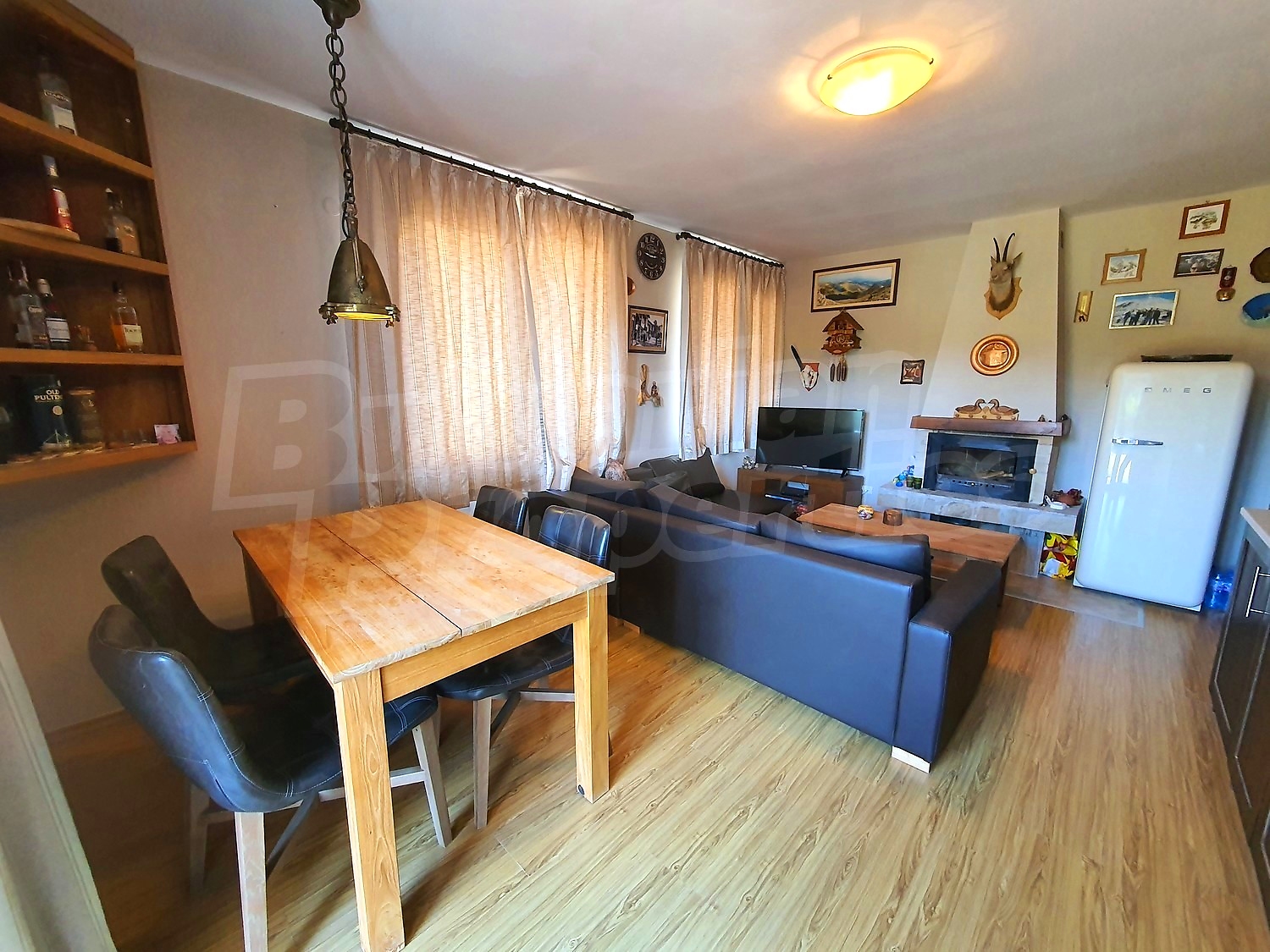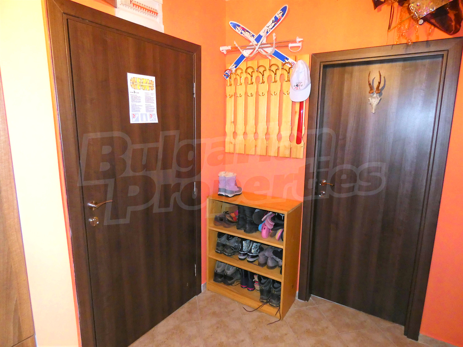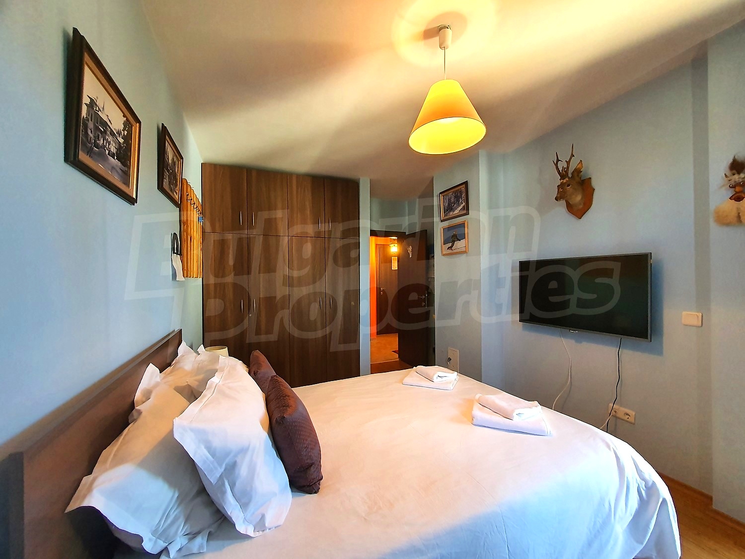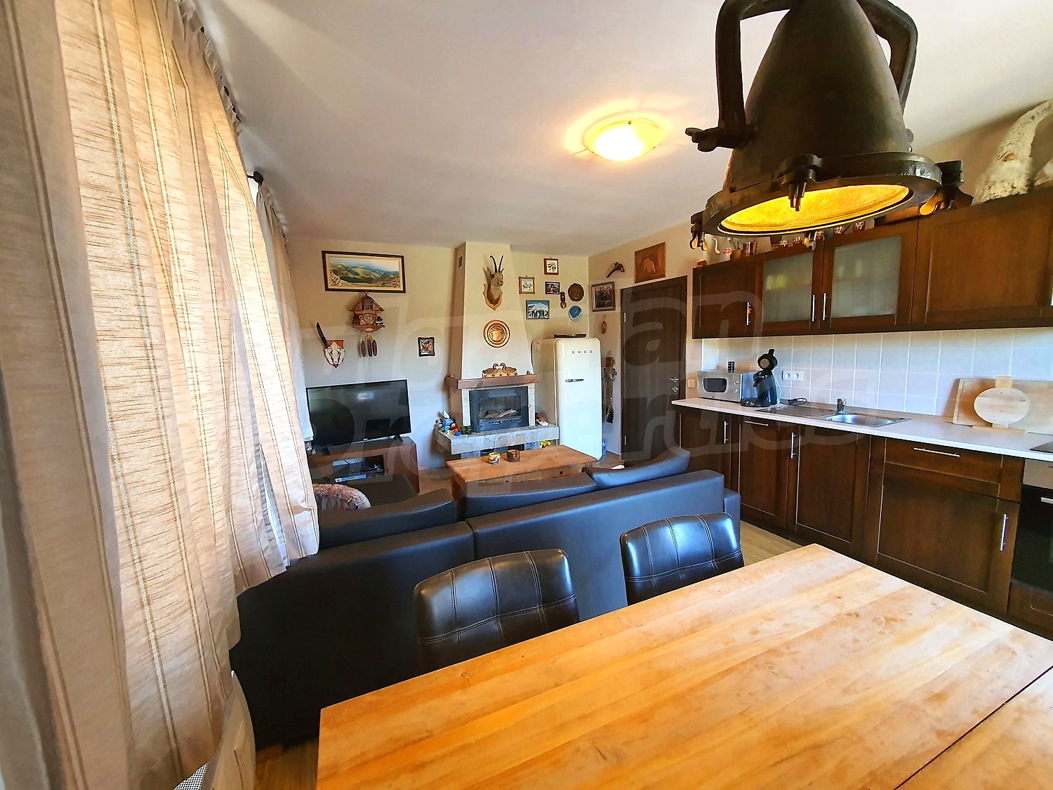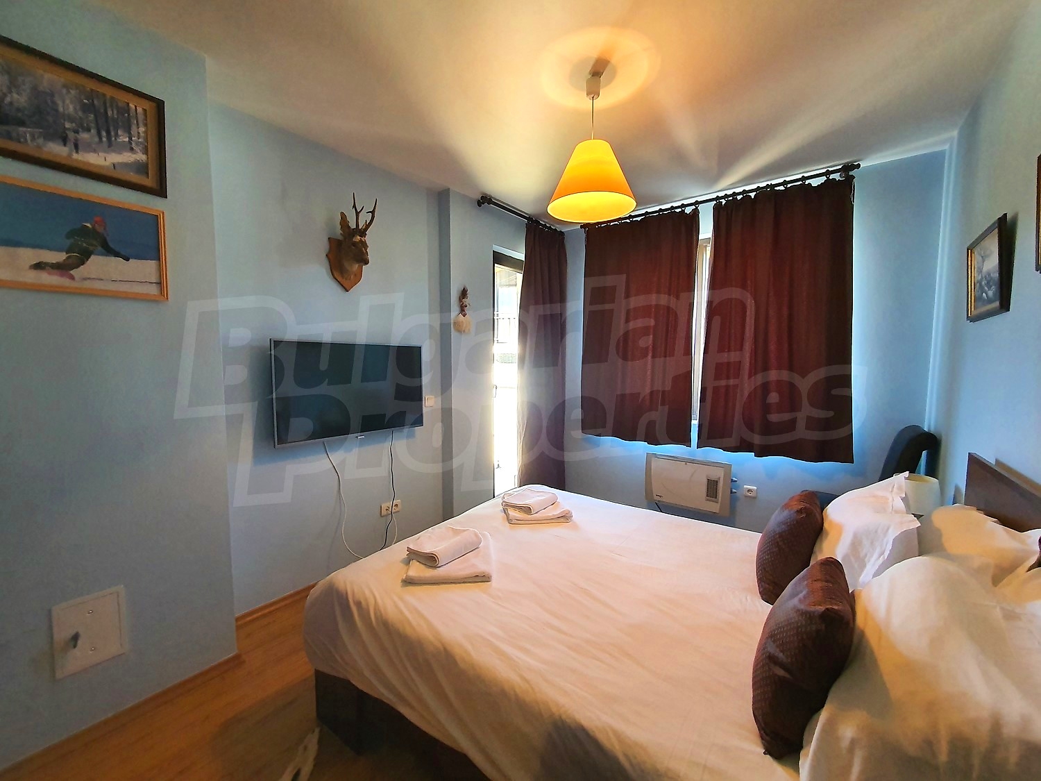 The flat is set on the third floor, with an area of 94.18 sq.m., facing south / west. The rooms have laminate floors, painted walls, windows - PVC. The kitchen is equipped with a ceramic hob, a sink, cabinets, hot plates, a toaster, a kettle, a fridge, a table with five chairs, a microwave; living room - with a sofa, a TV set, a DVD, a coffee table, a fireplace; bedroom 1 - a double bed, two bedside tables, a wardrobe, a TV set; bedroom 2 - a double bed, two bedside tables, a wardrobe, a TV set; bathroom with WC 1 - a bathtub, a washbasin with а mirror; bathroom with WC 2 - a shower box, a washbasin with a mirror. There are two balconies with beautiful views of the surrounding forests and mountains. The heating in the apartment is via electric convectors and a fireplace. The dwelling is wired for internet and cable TV. The complex has an elevator and a porter.