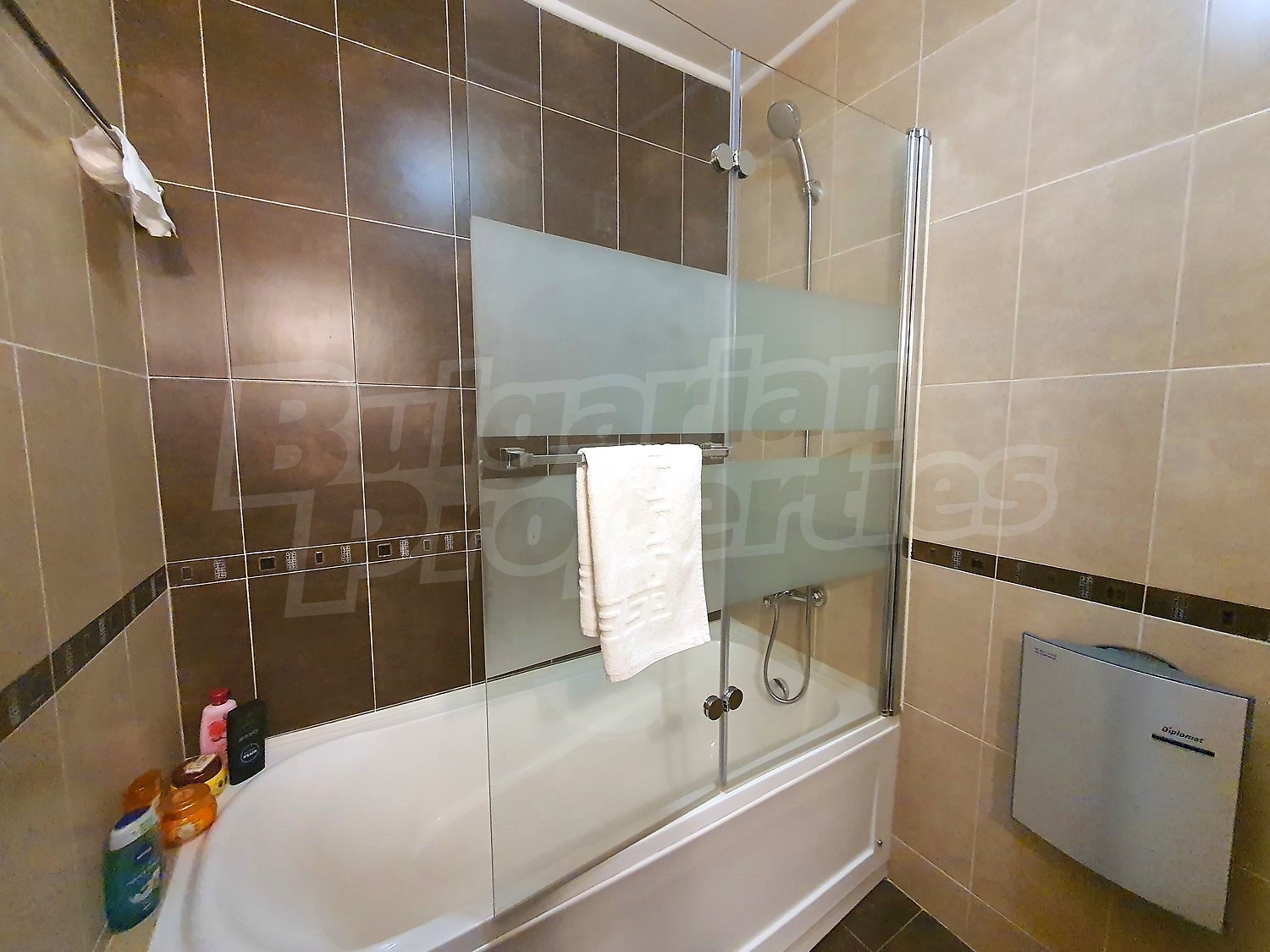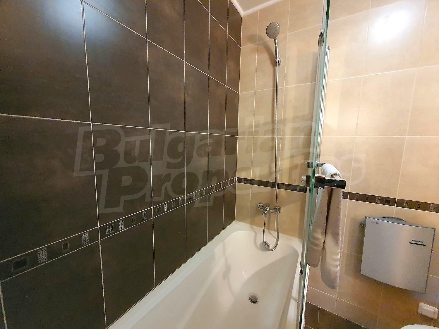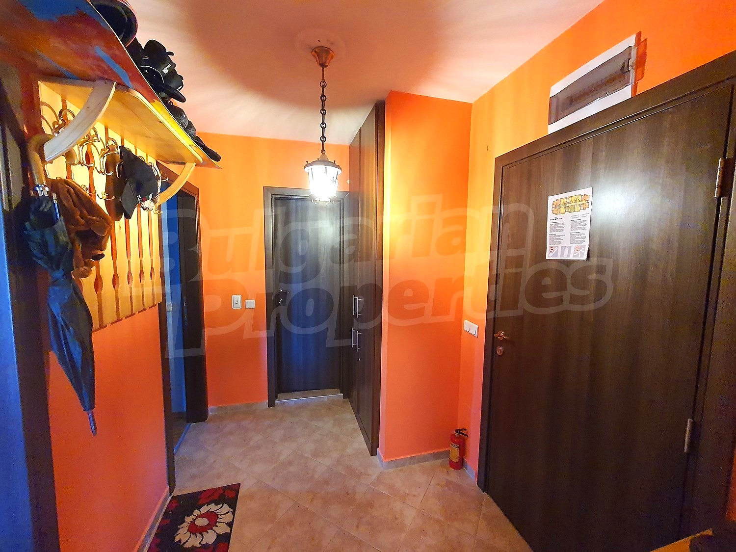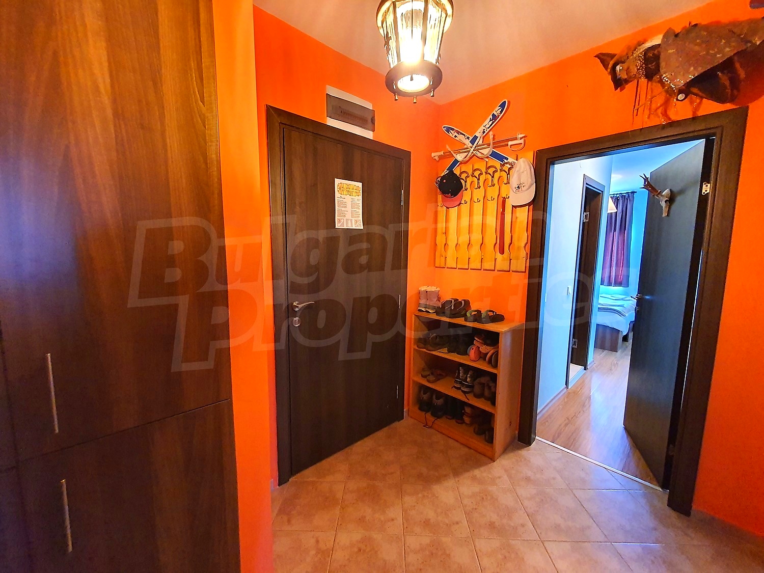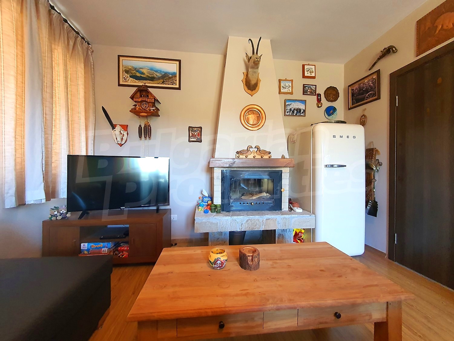 The flat is set on the third floor, with an area of 94.18 sq.m., facing south / west. The rooms have laminate floors, painted walls, windows - PVC. The kitchen is equipped with a ceramic hob, a sink, cabinets, hot plates, a toaster, a kettle, a fridge, a table with five chairs, a microwave; living room - with a sofa, a TV set, a DVD, a coffee table, a fireplace; bedroom 1 - a double bed, two bedside tables, a wardrobe, a TV set; bedroom 2 - a double bed, two bedside tables, a wardrobe, a TV set; bathroom with WC 1 - a bathtub, a washbasin with а mirror; bathroom with WC 2 - a shower box, a washbasin with a mirror. There are two balconies with beautiful views of the surrounding forests and mountains. The heating in the apartment is via electric convectors and a fireplace. The dwelling is wired for internet and cable TV. The complex has an elevator and a porter.