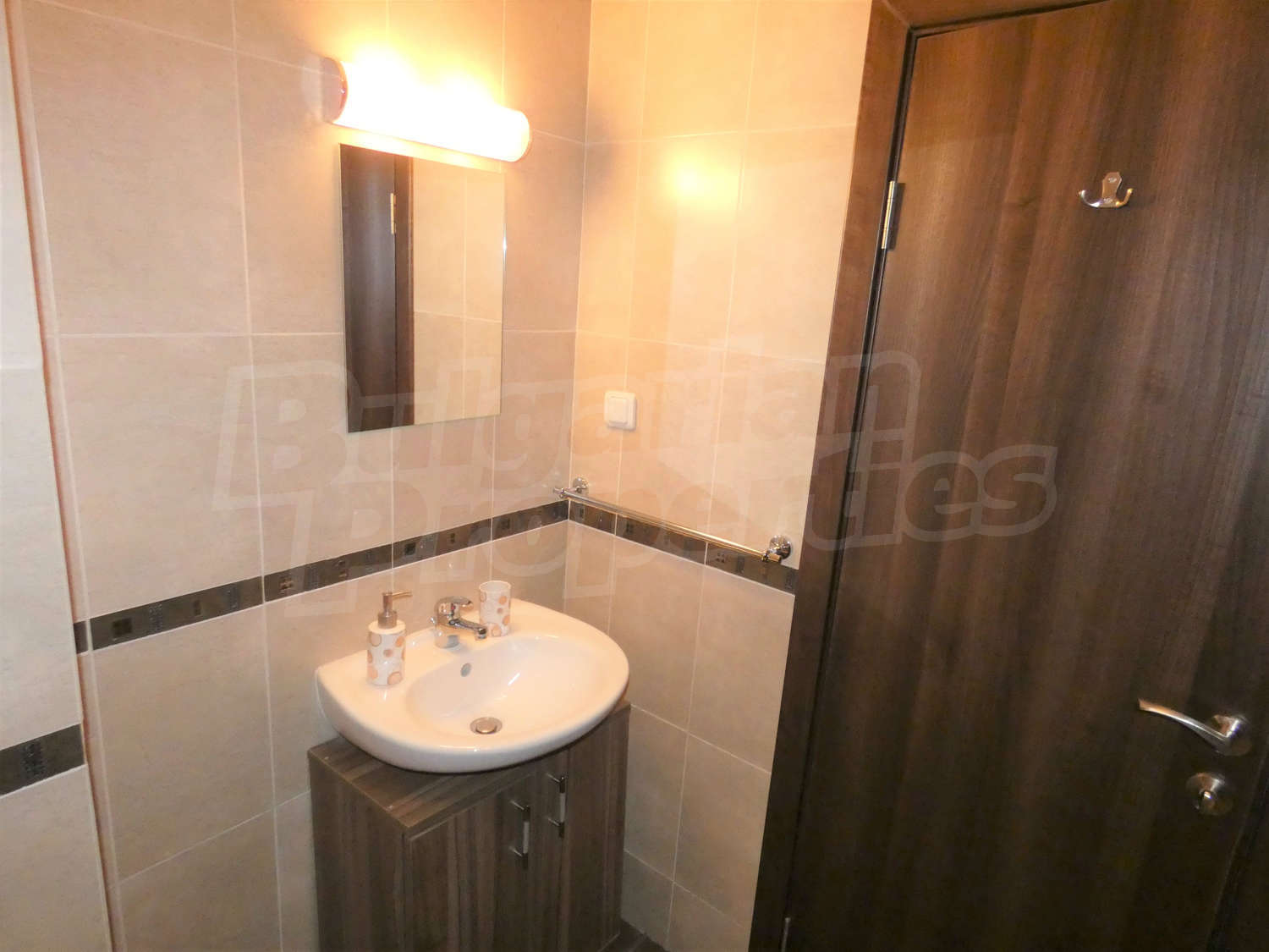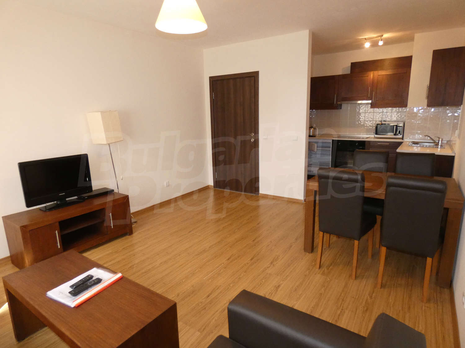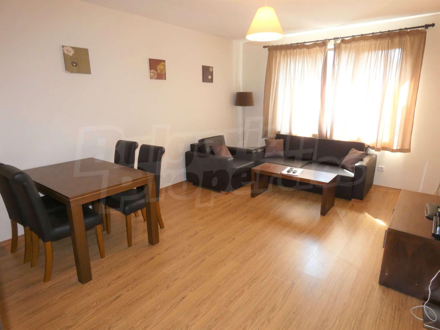 The 1-bedroom apartment (65.37 sq.m.) is facing west and is distributed between a living room with kitchenette, a bedroom, a bathroom with WC and a balcony overlooking the inner yard and the surrounding area. The rooms are finished with laminate and tiled flooring, painted walls, joinery - PVC. The kitchen is equipped with a ceramic hob, a sink, cabinets, hot plates, a toaster, a kettle, a fridge, a table with 4 chairs, a microwave. Living room with a sofa, an armchair, a TV set, a coffee table, two small tables. Bedroom with a double bed, two nightstands, a wardrobe. Bathroom with toilet, a bathtub, a sink and a mirror. The heating in the apartment is via electric convectors. The dwelling is wired for internet and cable TV. The complex has an elevator and a porter.