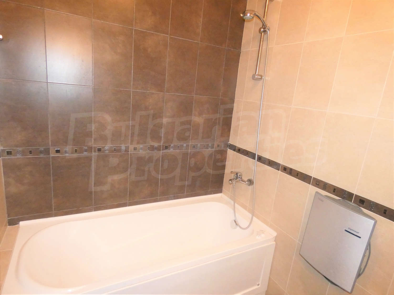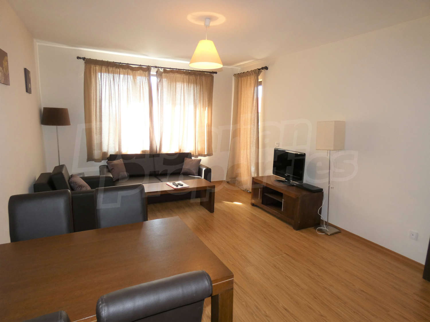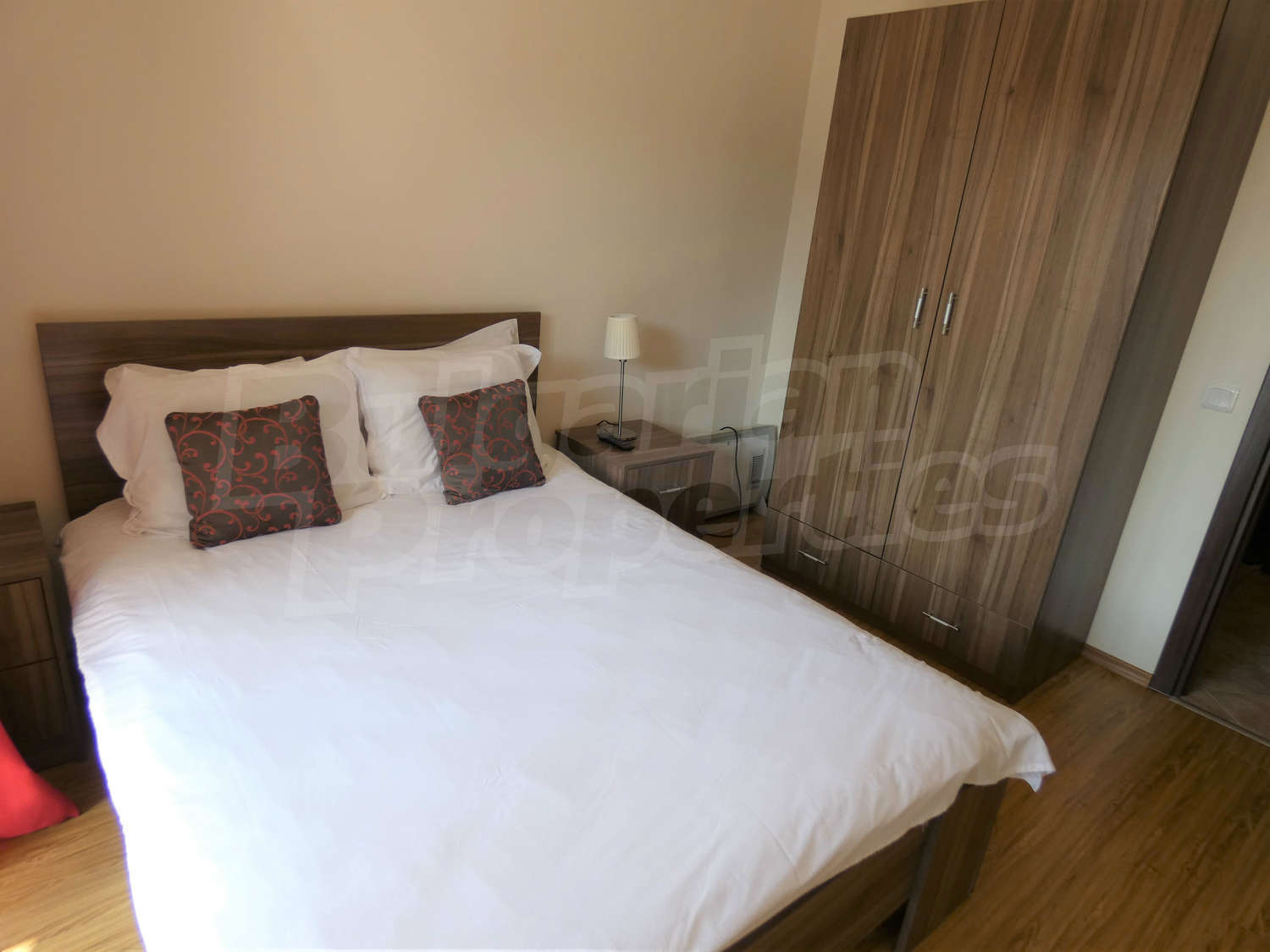 The 1-bedroom apartment (65.37 sq.m.) is facing west and is distributed between a living room with kitchenette, a bedroom, a bathroom with WC and a balcony overlooking the inner yard and the surrounding area. The rooms are finished with laminate and tiled flooring, painted walls, joinery - PVC. The kitchen is equipped with a ceramic hob, a sink, cabinets, hot plates, a toaster, a kettle, a fridge, a table with 4 chairs, a microwave. Living room with a sofa, an armchair, a TV set, a coffee table, two small tables. Bedroom with a double bed, two nightstands, a wardrobe. Bathroom with toilet, a bathtub, a sink and a mirror. The heating in the apartment is via electric convectors. The dwelling is wired for internet and cable TV. The complex has an elevator and a porter.
