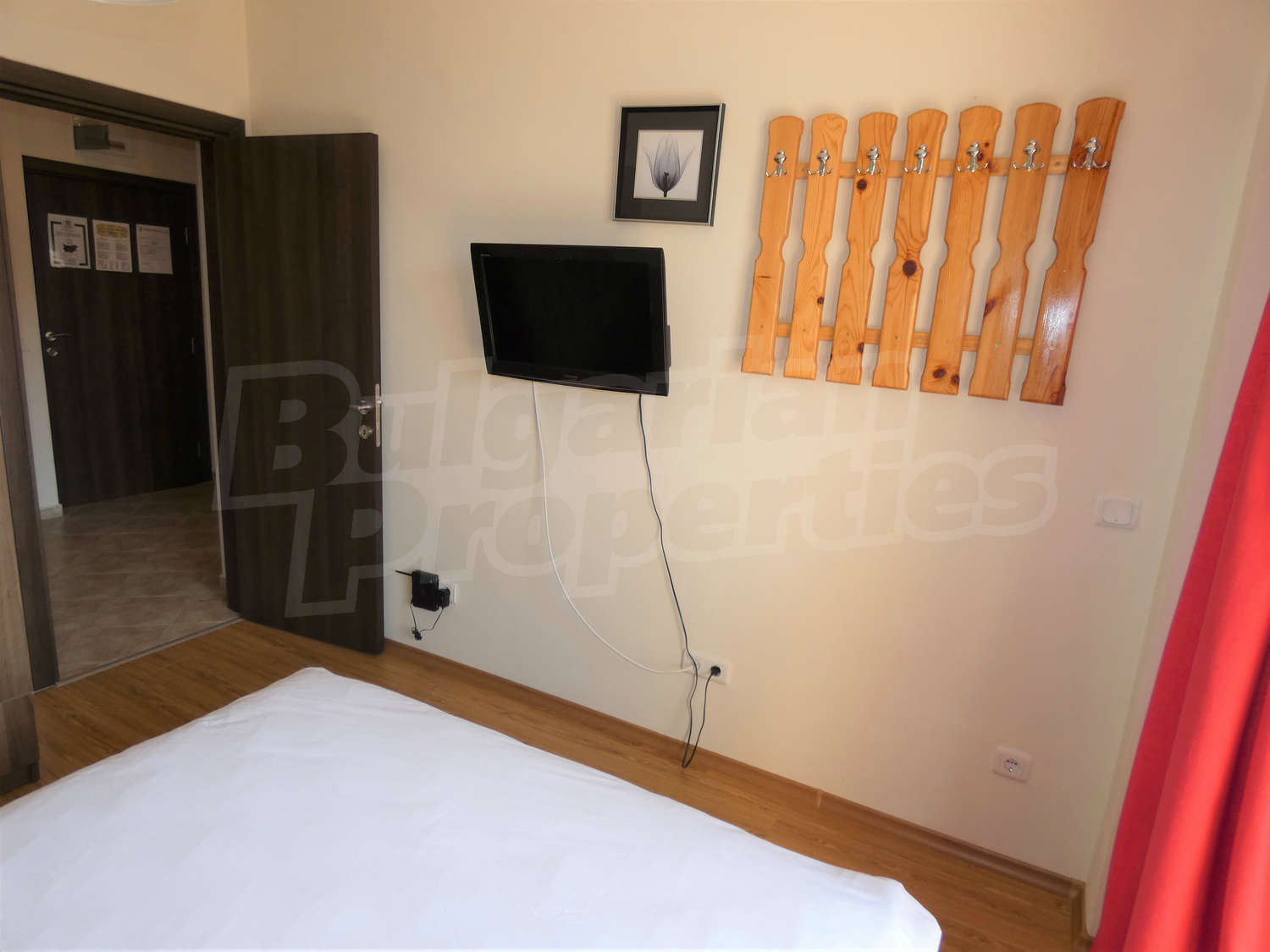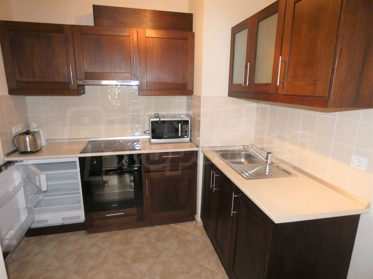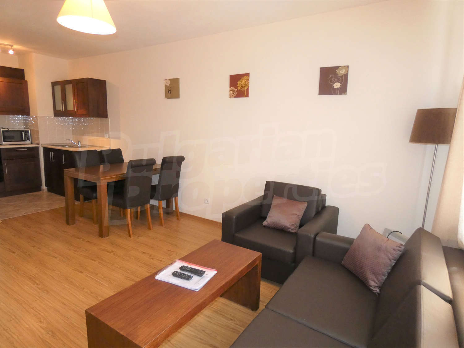 The 1-bedroom apartment (65.37 sq.m.) is facing west and is distributed between a living room with kitchenette, a bedroom, a bathroom with WC and a balcony overlooking the inner yard and the surrounding area. The rooms are finished with laminate and tiled flooring, painted walls, joinery - PVC. The kitchen is equipped with a ceramic hob, a sink, cabinets, hot plates, a toaster, a kettle, a fridge, a table with 4 chairs, a microwave. Living room with a sofa, an armchair, a TV set, a coffee table, two small tables. Bedroom with a double bed, two nightstands, a wardrobe. Bathroom with toilet, a bathtub, a sink and a mirror. The heating in the apartment is via electric convectors. The dwelling is wired for internet and cable TV. The complex has an elevator and a porter.