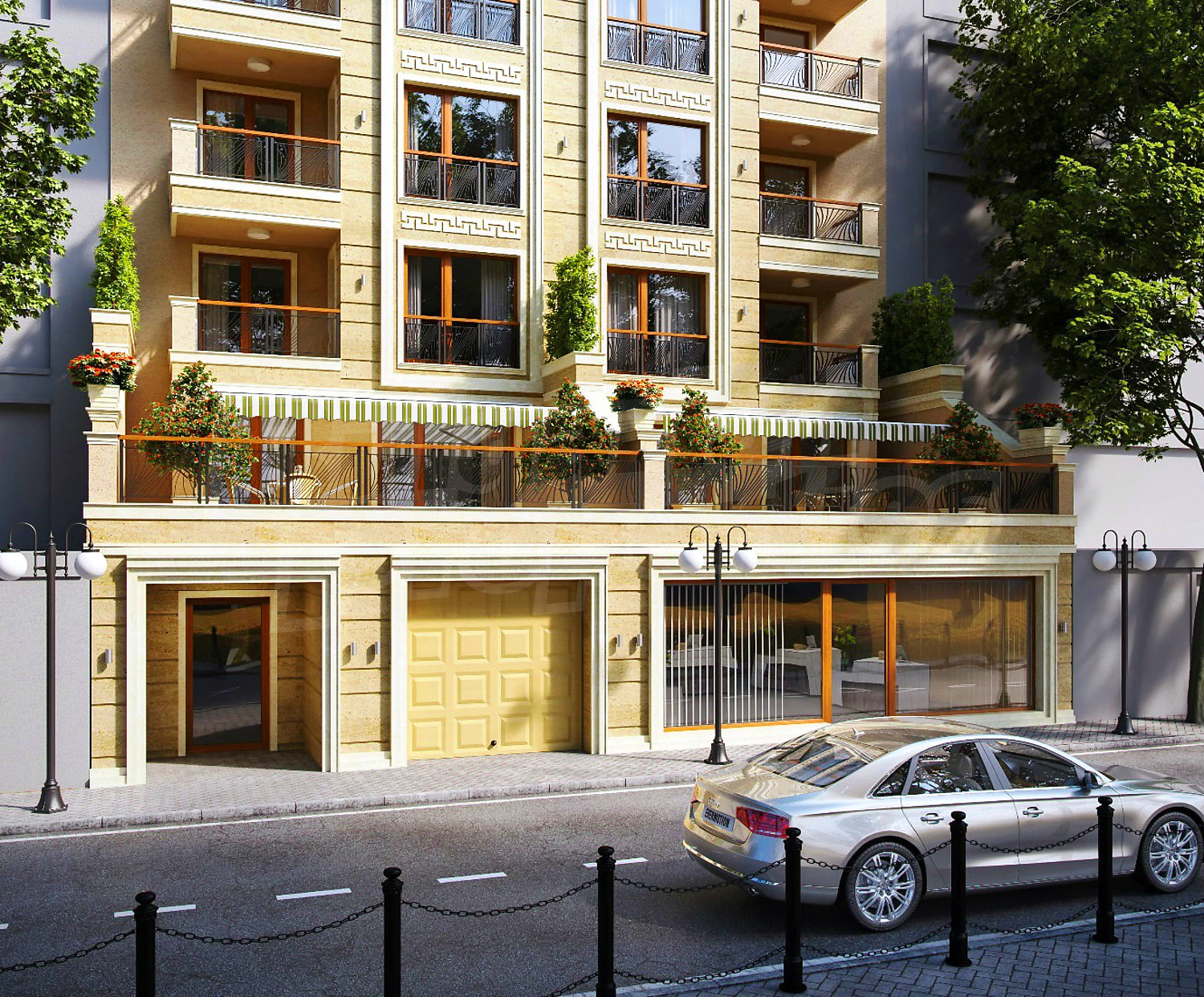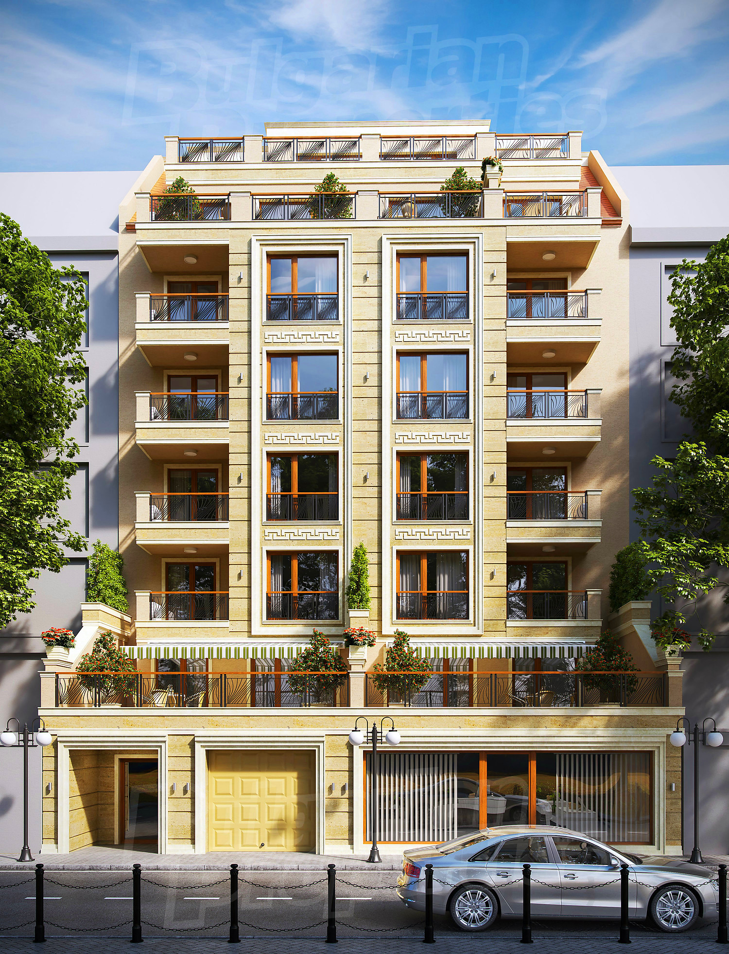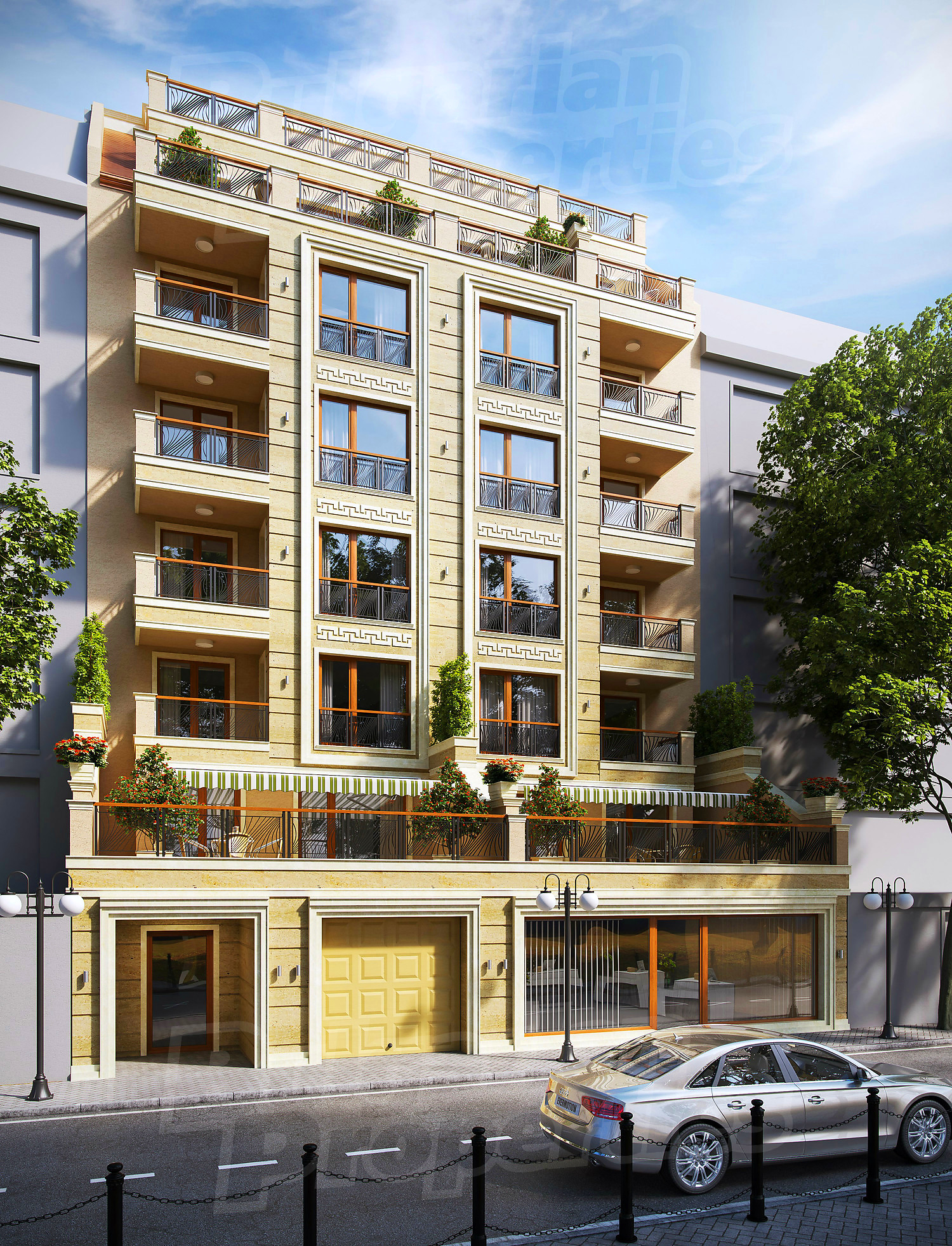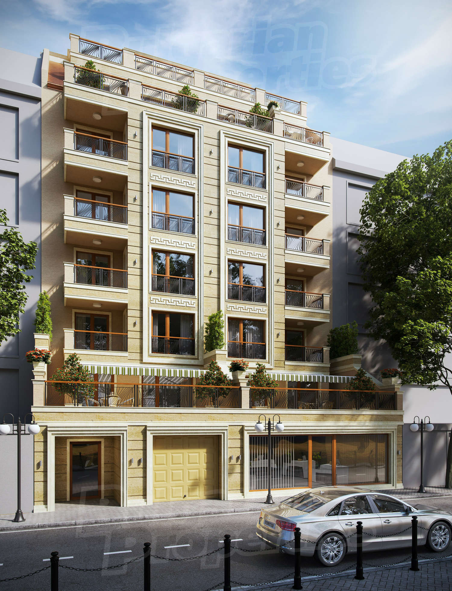 According to the project, the building has 8 above ground floors and underground guarded parking, elevator. New and traditional and time-tested materials and technologies in a modern and energy-efficient building. The facades of the building are in classic style, with linings and accents of travertine and natural materials. Luxurious common areas.