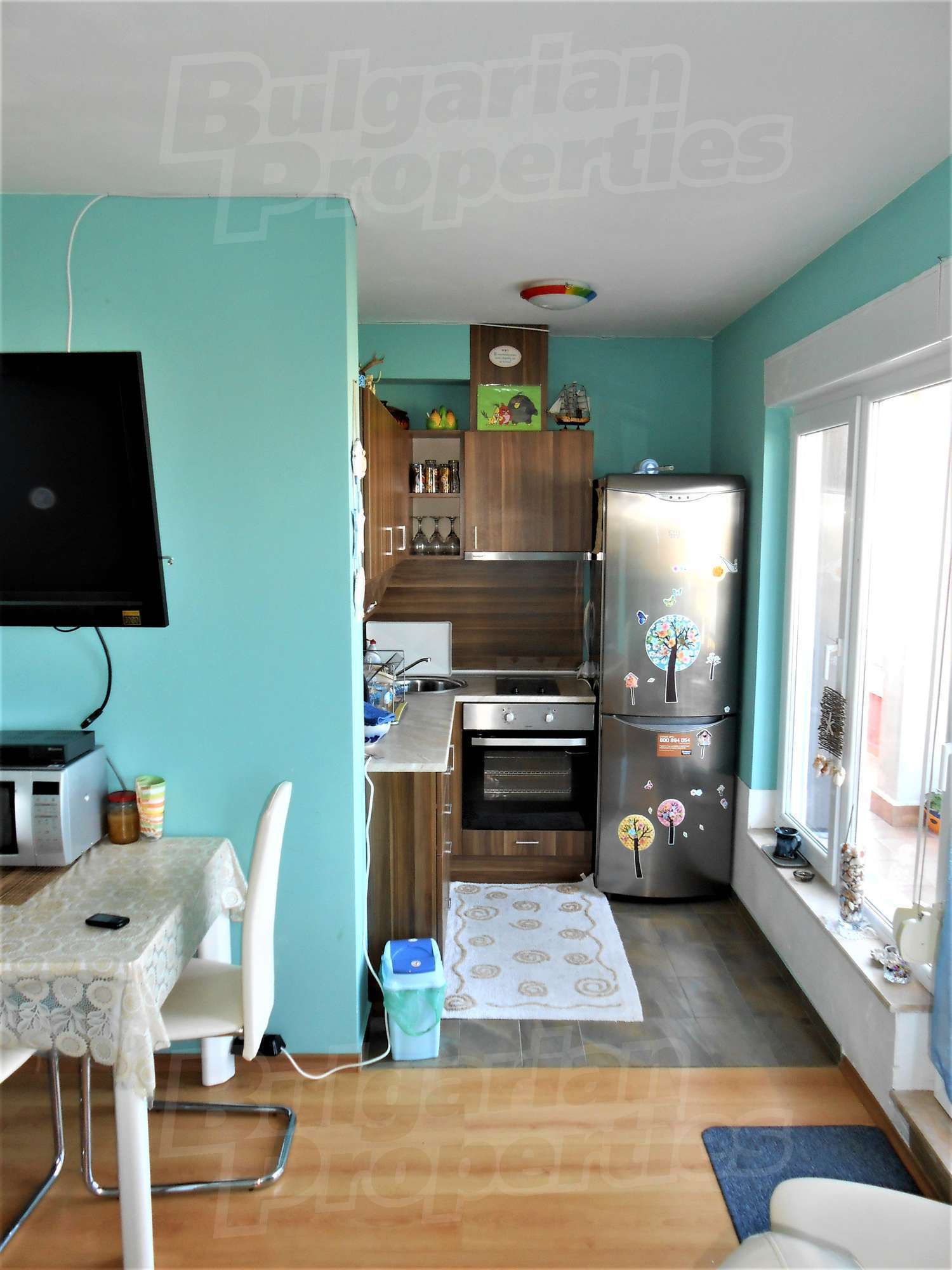 The apartment boasts impeccable quality of the materials - external insulation of leading European manufacturer; façade with high self-cleaning mineral plaster and stone from Ivaylovgrad; window sills of limestone and rails - inox. Quality window frames and flooring.