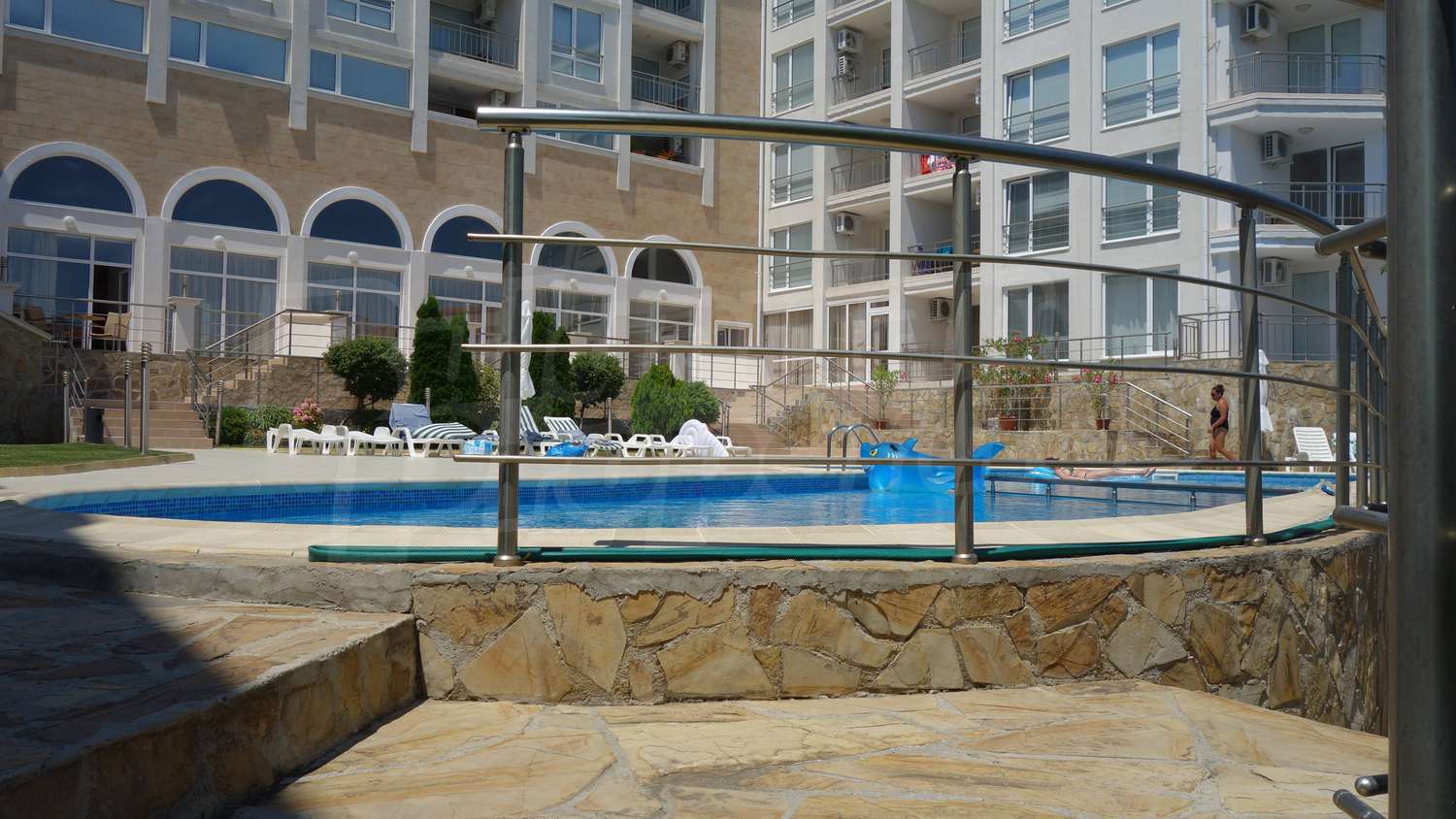 The complex has an outdoor pool with a separate section for children, a café, a parking lot and a gym. The maintenance fee for the common areas is 12 Euro/sq.m. per year.