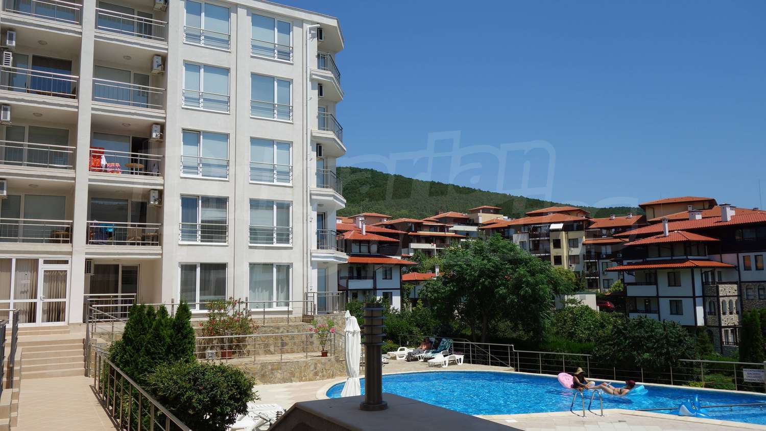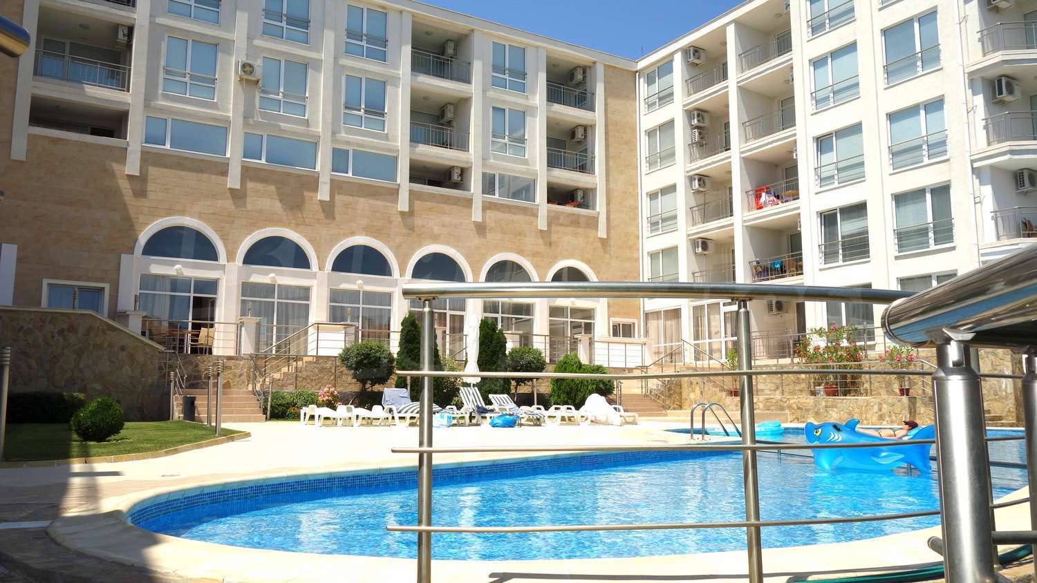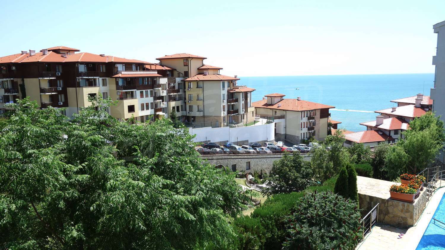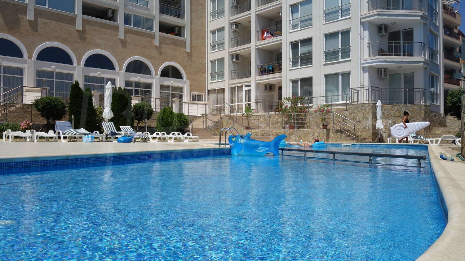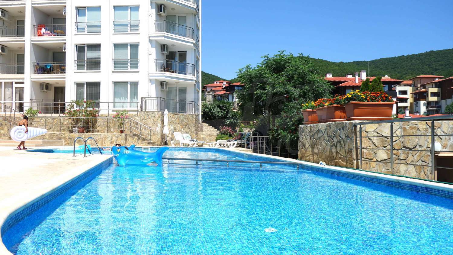 The complex has an outdoor pool with a separate section for children, a café, a parking lot and a gym. The maintenance fee for the common areas is 12 Euro/sq.m. per year.