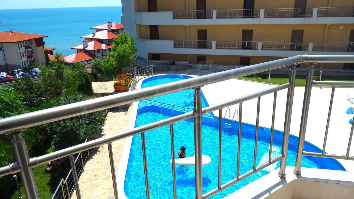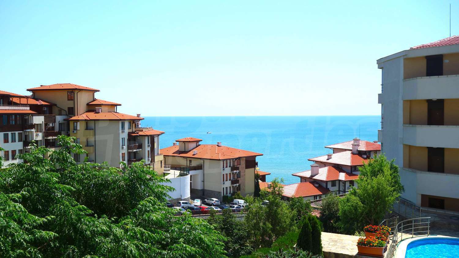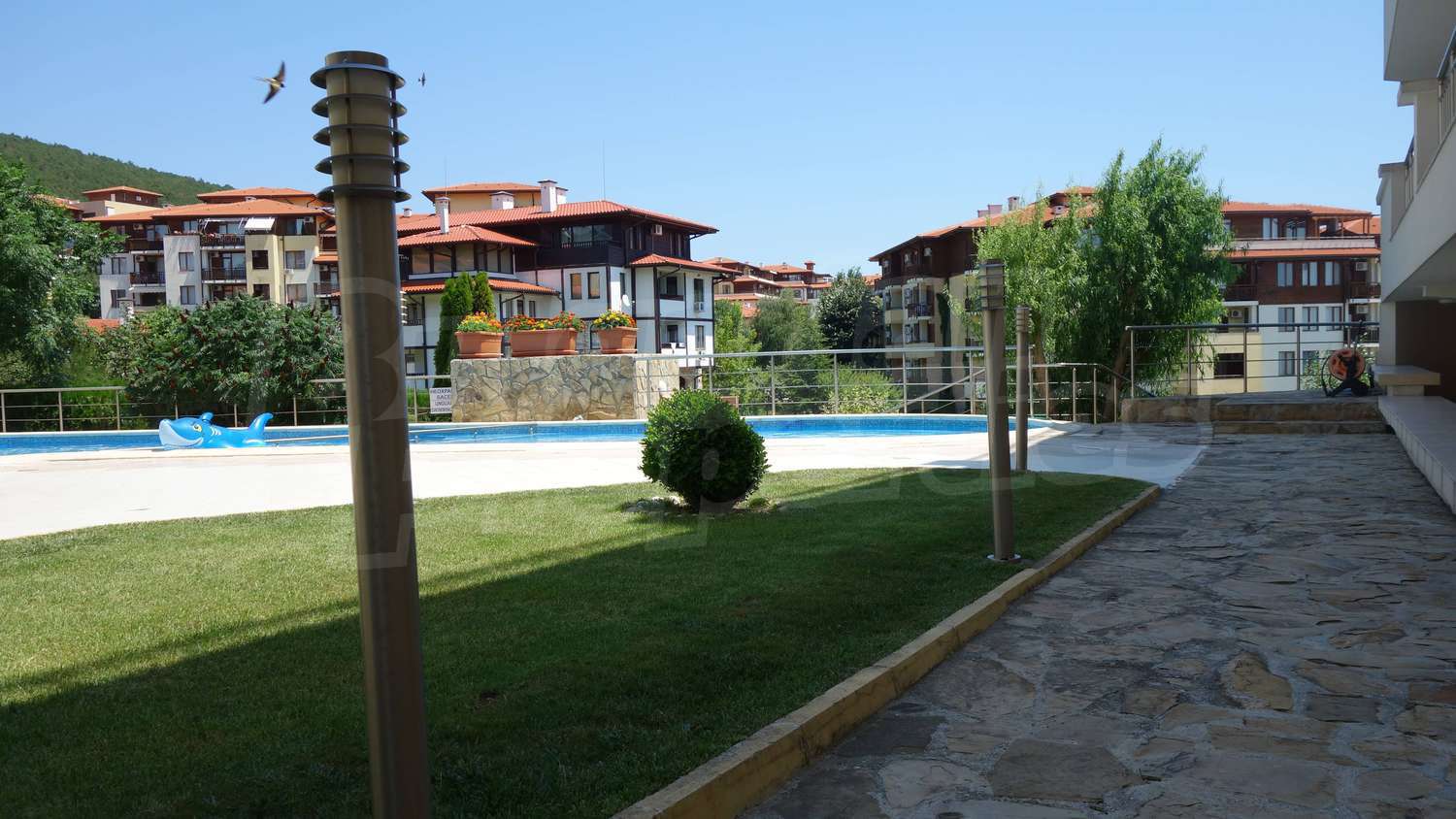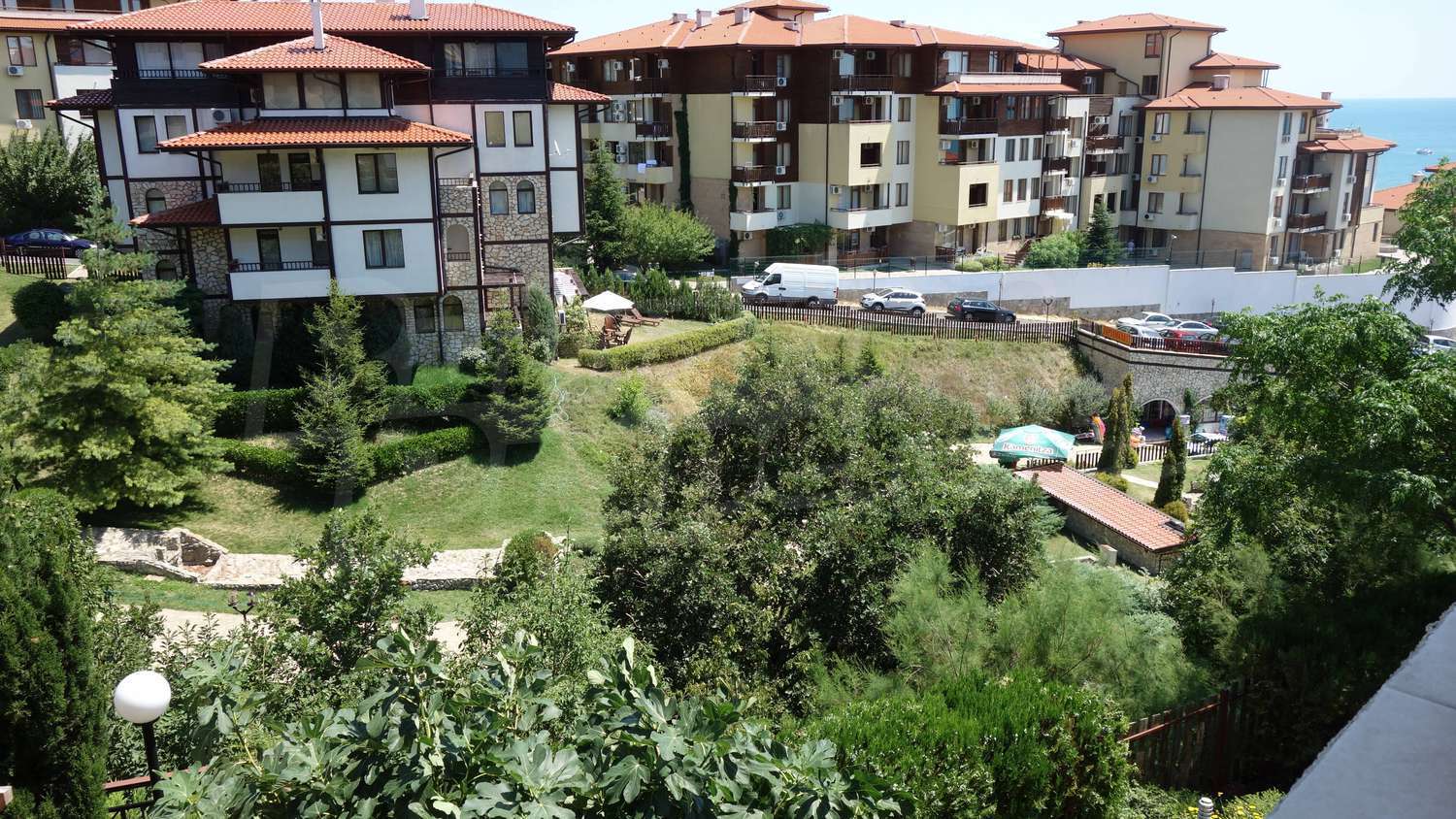 The complex has an outdoor pool with a separate section for children, a café, a parking lot and a gym. The maintenance fee for the common areas is 12 Euro/sq.m. per year.