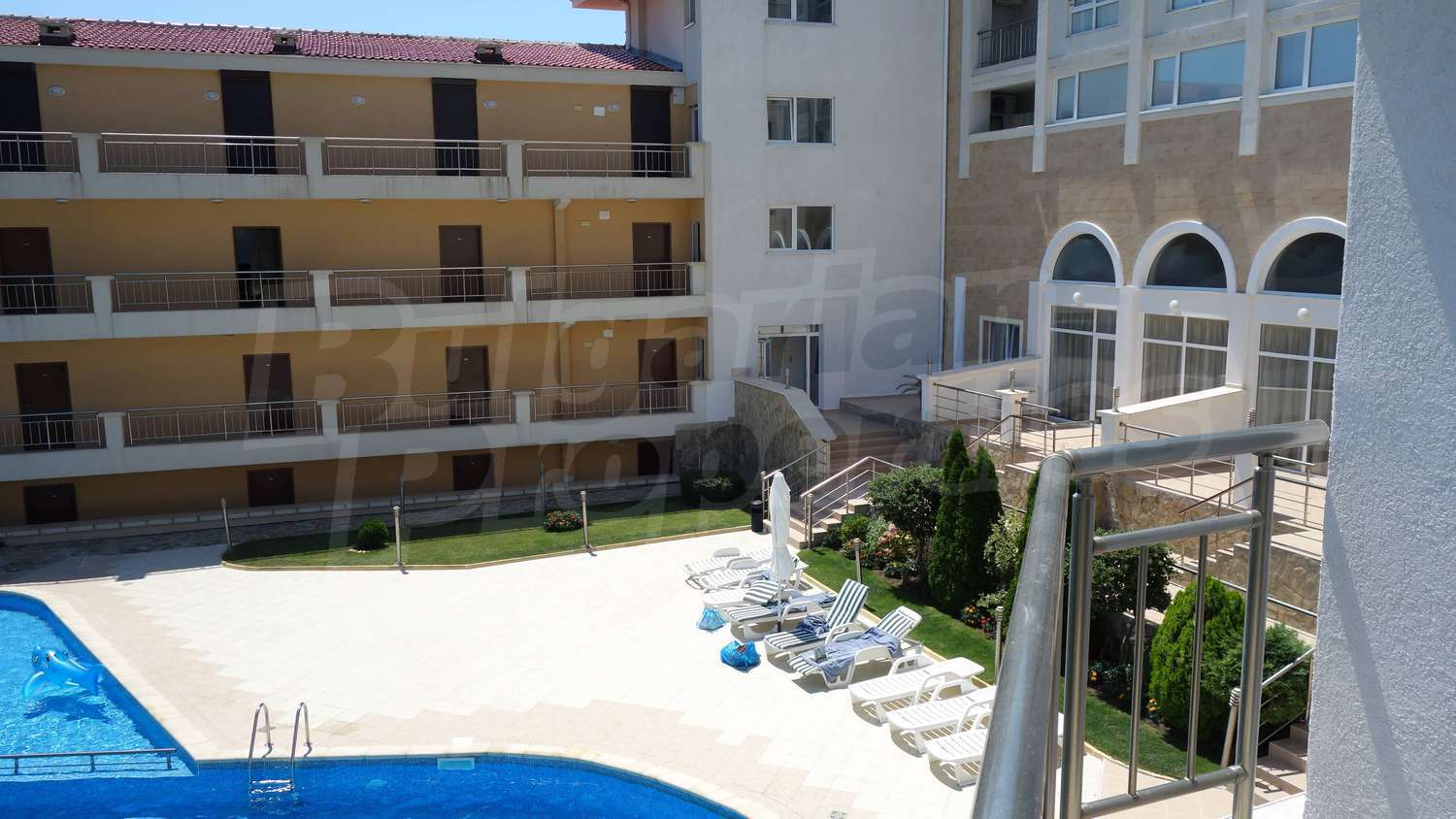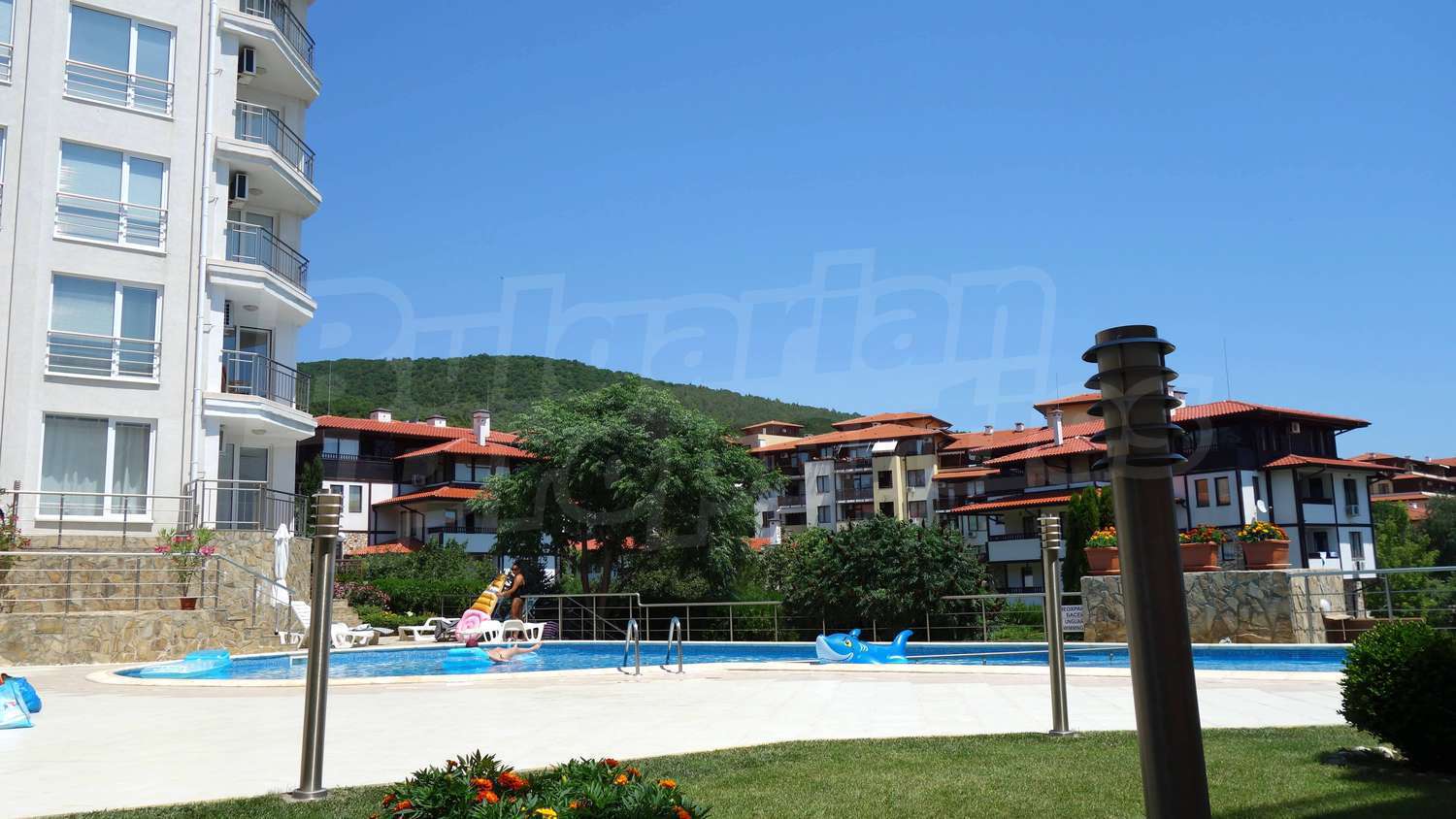 The complex has an outdoor pool with a separate section for children, a café, a parking lot and a gym. The maintenance fee for the common areas is 12 Euro/sq.m. per year.