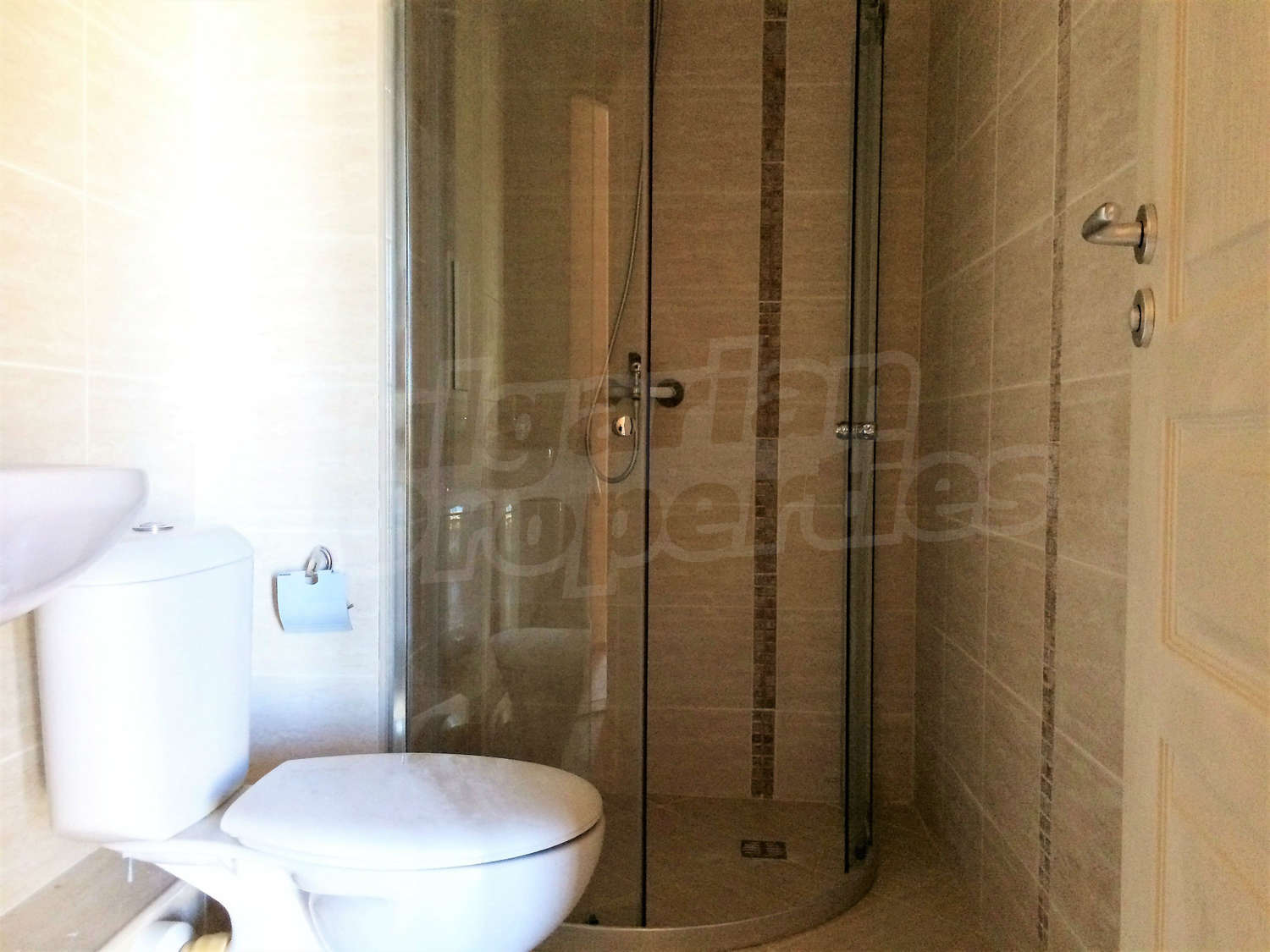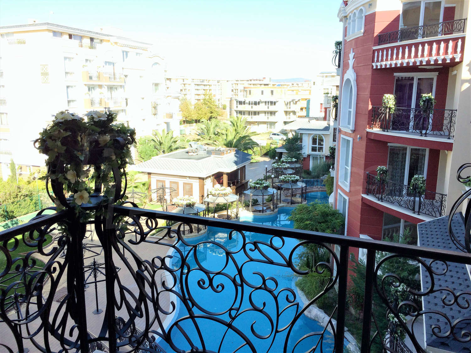 The studio is set on the 4th floor and consists of one room with kitchenette, bathroom with a toilet and a shower cabin and one balcony overlooking the courtyard of the complex and the swimming pool. The property is partly furnished and has a built-in kitchen and a fully equipped bathroom. The windows are PVC, the flooring - laminate and terracotta. The property has one air conditioner and is wired for cable TV and internet. The annual maintenance fee: 12 Euro/ sq.m.